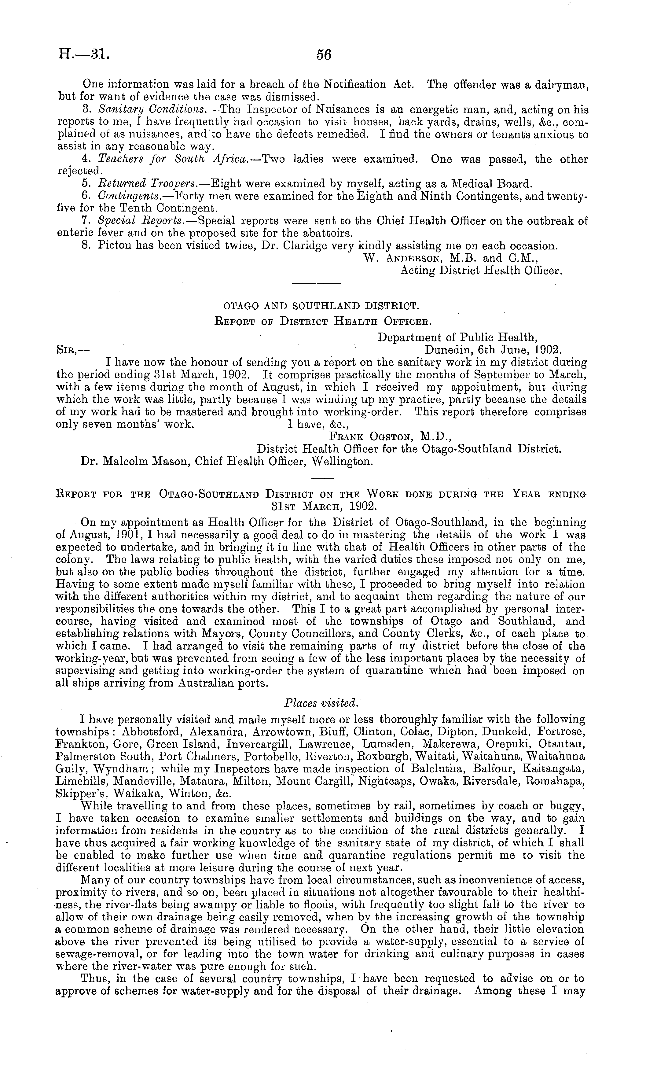 OTAGO AND SOUTHLAND DISTRICT. Beport of District Health Offices. Department of Public Health, Sib,— Dunedin, 6th June, 1902. I have now the honour of sending you a report on the sanitary work in my district during the period ending 31st March, 1902. It comprises practically the months of September to March, with a few items during the month of August, in which I received my appointment, but during which the work was little, partly because I was winding up my practice, partly because the details of my work had to be mastered and brought into working-order. This report therefore comprises only seven months' work. I have, &c, Frank Ogston, M.D., District Health Officer for the Otago-Southland District. Dr. Malcolm Mason, Chief Health Officer, Wellington.