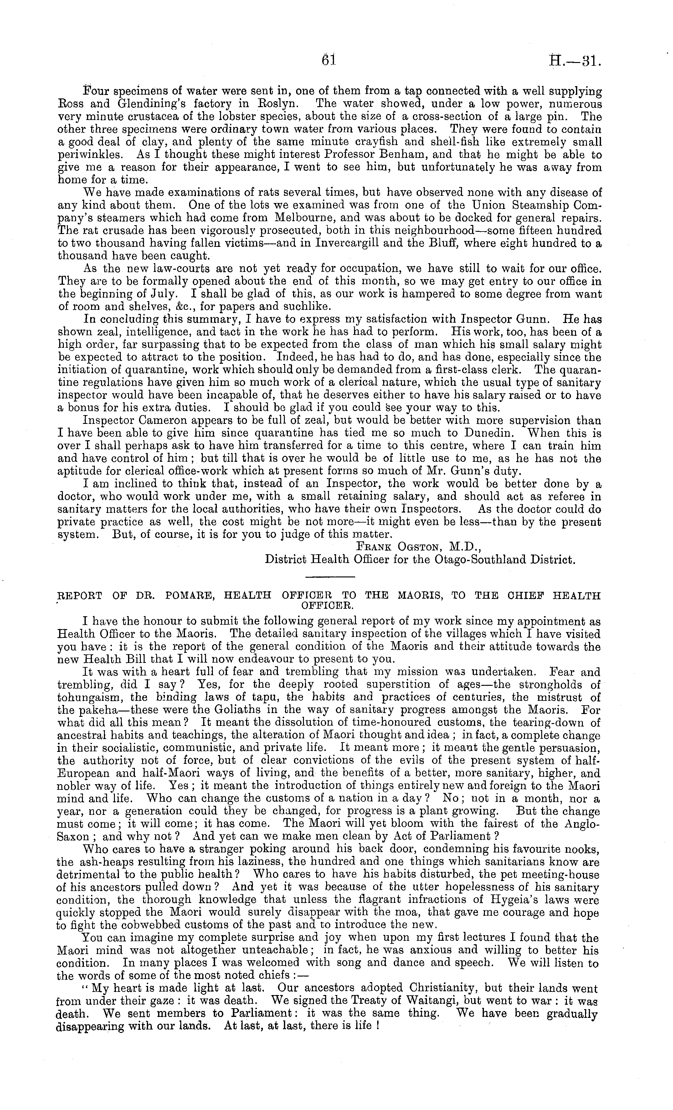 REPORT OP DR. POMARE, HEALTH OFFICER TO THE MAORIS, TO THE OHIEF HEALTH OFFICER. I have the honour to submit the following general report of my work since my appointment as Health Officer to the Maoris. The detailed sanitary inspection of the villages which I have visited you have : it is the report of the general condition of the Maoris and their attitude towards the new Health Bill that I will now endeavour to present to you. It was with a heart full of fear and trembling that my mission was undertaken. Fear and trembling, did I say ? Yes, for the deeply rooted superstition of ages—the strongholds of tohungaism, the binding laws of tapu, the habits and practices of centuries, the mistrust of the pakeha—these were the Goliaths in the way of sanitary progress amongst the Maoris. For what did all this mean ? It meant the dissolution of time-honoured customs, the tearing-down of ancestral habits and teachings, the alteration of Maori thought and idea ; in fact, a complete change in their socialistic, communistic, and private life. It meant more ; it meant the gentle persuasion, the authority not of force, but of clear convictions of the evils of the present system of halfEuropean and half-Maori ways of living, and the benefits of a better, more sanitary, higher, and nobler way of life. Yes ; it meant the introduction of things entirely new and foreign to the Maori mind and life. Who can change the customs of a nation in a day ? No; not in a month, nor a year, nor a generation could they be changed, for progress is a plant growing. But the change must come; it will come; it has come. The Maori will yet bloom with the fairest of the AngloSaxon ; and why not ? And yet can we make men clean by Act of Parliament ? Who cares to have a stranger poking around his back door, condemning his favourite nooks, the ash-heaps resulting from his laziness, the hundred and one things which sanitarians know are detrimental to the public health? Who cares to have his habits disturbed, the pet meeting-house of his ancestors pulled down ? And yet it was because of the utter hopelessness of his sanitary condition, the thorough knowledge that unless the flagrant infractions of Hygeia's laws were quickly stopped the Maori would surely disappear with the moa, that gave me courage and hope to fight the cobwebbed customs of the past and to introduce the new. You can imagine my complete surprise and joy when upon my first lectures I found that the Maori mind was not altogether unteachable; in fact, he was anxious and willing to better his condition. In many places I was welcomed with song and dance and speech. We will listen to the words of some of the most noted chiefs : — "My heart is made light at last. Our ancestors adopted Christianity, but their lands went from under their gaze :it was death. We signed the Treaty of Waitangi, but went to war :it was death. We sent members to Parliament: it was the same thing. We have been gradually disappearing with our lands. At last, at last, there is life I