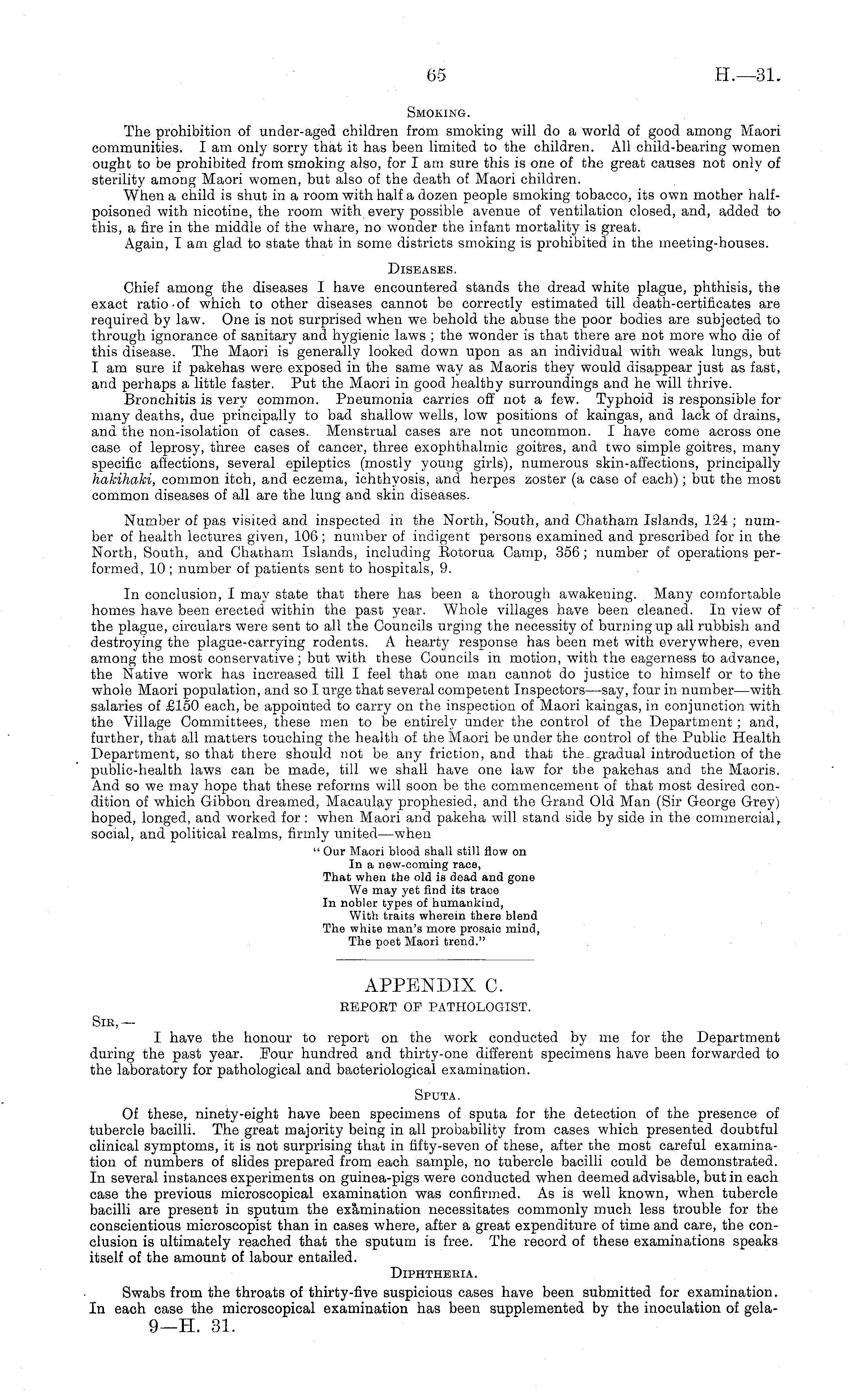 Smoking. The prohibition of under-aged children from smoking will do a world of good among Maori communities. lam only sorry that it has been limited to the children. All child-bearing women ought to be prohibited from smoking also, for I am sure this is one of the great causes not only of sterility among Maori women, but also of the death of Maori children. When a child is shut in a room with half a dozen people smoking tobacco, its own mother halfpoisoned with nicotine, the room with every possible avenue of ventilation closed, and, added to this, a fire in the middle of the whare, no wonder the infant mortality is great. Again, I am glad to state that in some districts smoking is prohibited in the meeting-houses. Diseases. Chief among the diseases I have encountered stands the dread white plague, phthisis, the exact ratio-of which to other diseases cannot be correctly estimated till death-certificates are required by law. One is not surprised when we behold the abuse the poor bodies are subjected to through ignorance of sanitary and hygienic laws ; the wonder is that there are not more who die of this disease. The Maori is generally looked down upon as an individual with weak lungs, but I am sure if pakehas were exposed in the same way as Maoris they would disappear just as fast, and perhaps a little faster. Put the Maori in good healthy surroundings and he will thrive. Bronchitis is very common. Pneumonia carries off not a few. Typhoid is responsible for many deaths, due principally to bad shallow wells, low positions of kaingas, and lack of drains, and the non-isolation of cases. Menstrual cases are not uncommon. I have come across one case of leprosy, three cases of cancer, three exophthalmic goitres, and two simple goitres, many specific affections, several epileptics (mostly young girls), numerous skin-affections, principally hakihaki, common itch, and eczema, ichthyosis, and herpes zoster (a case of each); but the most common diseases of all are the lung and skin diseases. Number of pas visited and inspected in the North, South, and Chatham Islands, 124 ; number of health lectures given, 106; number of indigent persons examined and prescribed for in the North, South, and Chatham Islands, including Botorua Camp, 356 ; number of operations performed, 10 ; number of patients sent to hospitals, 9. In conclusion, I may state that there has been a thorough awakening. Many comfortable homes have been erected within the past year. Whole villages have been cleaned. In view of the plague, circulars were sent to all the Councils urging the necessity of burning up all rubbish and destroying the plague-carrying rodents. A hearty response has been met with everywhere, even among the most conservative ; but with these Councils in motion, with the eagerness to advance, the Native work has increased till I feel that one man cannot do justice to himself or to the whole Maori population, and so I urge that several competent Inspectors—say, four in number —with salaries of £150 each, be appointed to carry on the inspection of Maori kaingas, in conjunction with the Village Committees, these men to be entirely under the control of the Department ; and, further, that all matters touching the health of the Maori be under the control of the Public Health Department, so that there should not be any friction, and that the gradual introduction of the public-health laws can be made, till we shall have one law for the pakehas and the Maoris. And so we may hope that these reforms will soon be the commencement of that most desired condition of which Gibbon dreamed, Macaulay prophesied, and the Grand Old Man (Sir George Grey) hoped, longed, and worked for : when Maori and pakeha will stand side by side in the commercial, social, and political realms, firmly united—when " Our Maori blood shall still flow on In a new-coming race, That when the old is dead and gone We may yet find its trace In nobler types of humankind, With traits wherein there blend The white man's more prosaic mind, The poet Maori trend."