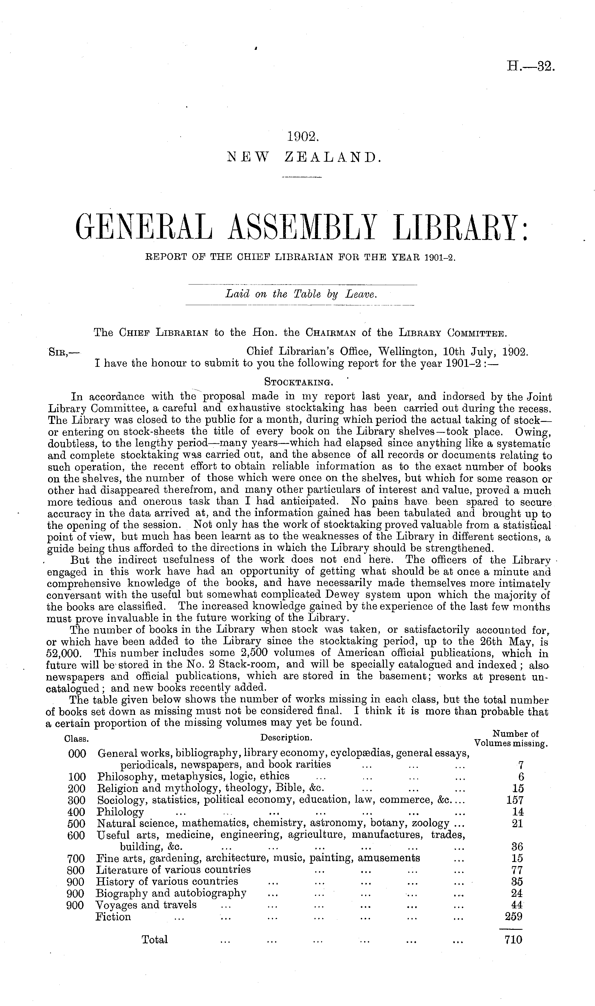 The Chief Libeaeian to the Hon. the Chaibman of the Libbaby Committee. Sib,— Chief Librarian's Office, Wellington, 10th July, 1902. I have the honour to submit to you the following report for the year 1901-2 :— Stocktaking. In accordance with the proposal made in my report last year, and indorsed by the Joint Library Committee, a careful and exhaustive stocktaking has been carried out during the recess. The Library was closed to the public for a month, during which period the actual taking of stock— or entering on stock-sheets the title of every book on the Library shelves—took place. Owing, doubtless, to the lengthy period —many years—which had elapsed since anything like a systematic and complete stocktaking was carried out, and the absence of all records or documents relating to such operation, the recent effort to obtain reliable information as to the exact number of books on the shelves, the number of those which were once on the shelves, but which for some reason or other had disappeared therefrom, and many other particulars of interest and value, proved a much more tedious and onerous task than I had anticipated. No pains have been spared to secure accuracy in the data arrived at, and the information gained has been tabulated and brought up to the opening of the session. Not only has the work of stocktaking proved valuable from a statistical point of view, but much has been learnt as to the weaknesses of the Library in different sections, a guide being thus afforded to the directions in which the Library should be strengthened. But the indirect usefulness of the work does not end here. The officers of the Library engaged in this work have had an opportunity of getting what should be at once a minute and comprehensive knowledge of the books, and have necessarily made themselves more intimately conversant with the useful but somewhat complicated Dewey system upon which the majority of the books are classified. The increased knowledge gained by the experience of the last few months must prove invaluable in the future working of the Library. The number of books in the Library when stock was taken, or satisfactorily accounted for, or which have been added to the Library since the stocktaking period, up to the 26th May, is 52,000. This number includes some 2,500 volumes of American official publications, which in future will be stored in the No. 2 Stack-room, and will be specially catalogued and indexed ; also newspapers and official publications, which are stored in the basement; works at present uncatalogued ; and new books recently added. The table given below shows the number of works missing in each class, but the total number of books set down as missing must not be considered final. I think it is more than probable that a certain proportion of the missing volumes may yet be found. Class Description. „ . Number of r ( Volumes missing. 000 General works, bibliography, library economy, cyclopaedias, general essays, periodicals, newspapers, and book rarities ... ... ... 7 100 Philosophy, metaphysics, logic, ethics ... ... ... ... 6 200 Religion and mythology, theology, Bible, &c. ... ... ... 15 300 Sociology, statistics, political economy, education, law, commerce, &c 157 400 Philology ... ..". ... ... ... ... ... 14 500 Natural science, mathematics, chemistry, astronomy, botany, zoology ... 21 600 Useful arts, medicine, engineering, agriculture, manufactures, trades, building, &c. ... ... ... ... ... ... 36 700 Fine arts, gardening, architecture, music, painting, amusements ... 15 800 Literature of various countries ... ... ... ... 77 900 History of various countries ... ... ... ... ... 35 900 Biography and autobiography ... ... ... ... ... 24 900 Voyages and travels ... ... ... ... ... ... 44 Fiction ... ... ... ... ... ... ... 259 Total ... ... ... ... ... ... 710