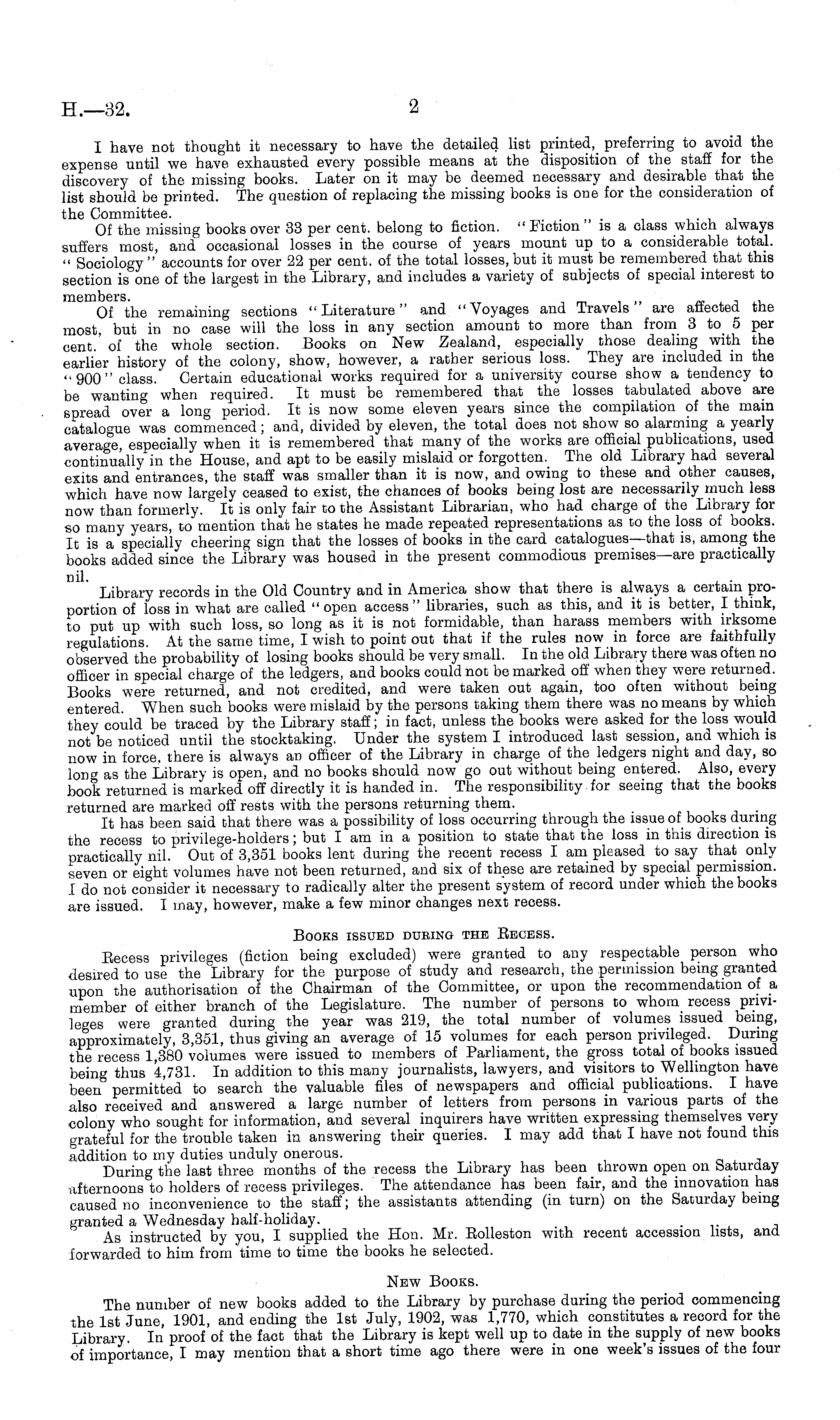 I have not thought it necessary to have the detailed list printed, preferring to avoid the expense until we have exhausted every possible means at the disposition of the staff for the discovery of the missing books. Later on it may be deemed necessary and desirable that the list should be printed. The question of replacing the missing books is one for the consideration of the Committee. Of the missing books over 33 per cent, belong to fiction. " Fiction is a class which always suffers most, and occasional losses in the course of years mount up to a considerable total. " Sociology " accounts for over 22 per cent, of the total losses, but it must be remembered that this section is one of the largest in the Library, and includes a variety of subjects of special interest to members. Of the remaining sections "Literature" and "Voyages and Travels are affected the most, but in no case will the loss in any section amount to more than from 3 to_ 5 per cent.' of the whole section. Books on New Zealand, especially those dealing with the earlier history of the colony, show, however, a rather serious loss. They are included in the "900" class. Certain educational works required for a university course show a tendency to be wanting when required. It must be remembered that the losses tabulated above are spread over a long period. It is now some eleven years since the compilation of the main catalogue was commenced; and, divided by eleven, the total does not show so alarming a yearly average, especially when it is remembered that many of the works are official publications, used continually in the House, and apt to be easily mislaid or forgotten. The old Library had several exits and entrances, the staff was smaller than it is now, and owing to these and other causes, which have now largely ceased to exist, the chances of books being lost are necessarily much less now than formerly. It is only fair to the Assistant Librarian, who had charge of the Library for so many years, to mention that he states he made repeated representations as to the loss of books. It is a specially cheering sign that the losses of books in the card catalogues—that is, among the books added since the Library was housed in the present commodious premises—are practically Library records in the Old Country and in America show that there is always a certain proportion of loss in what are called " open access" libraries, such as this, and it is better, I think, to put up with such loss, so long as it is not formidable, than harass members with irksome regulations. At the same time, I wish to point out that if the rules now in force are faithfully observed the probability of losing books should be very small. In the old Library there was often no officer in special charge of the ledgers, and books could not be marked off when they were returned. Books were returned, and not credited, and were taken out again, too often without being entered. When such books were mislaid by the persons taking them there was no means by which they could be traced by the Library staff; in fact, unless the books were asked for the loss would not be noticed until the stocktaking. Under the system I introduced last session, and which is now in force, there is always an officer of the Library in charge of the ledgers night and day, so long as the Library is open, and no books should now go out without being entered. Also, every book returned is marked off directly it is handed in. The responsibility for seeing that the books returned are marked off rests with the persons returning them. It has been said that there was a possibility of loss occurring through the issue of books during the recess to privilege-holders; but I am in a position to state that the loss in this direction is practically nil. Out of 3,351 books lent during the recent recess I am pleased to say that only seven or eight volumes have not been returned, and six of these are retained by special permission. I do not consider it necessary to radically alter the present system of record under which the books are issued. I may, however, make a few minor changes next recess. Books issued dueing the Eecbss. Eecess privileges (fiction being excluded) were granted to any respectable person who desired to use the Library for the purpose of study and research, the permission being granted upon the authorisation of the Chairman of the Committee, or upon the recommendation of a member of either branch of the Legislature. The number of persons to whom recess privileges were granted during the year was 219, the total number of volumes issued being, approximately, 3,351, thus giving an average of 15 volumes for each person privileged. During the recess 1,380 volumes were issued to members of Parliament, the gross total of books issued bein" thus 4,731. In addition to this many journalists, lawyers, and visitors to Wellington have been° permitted to search the valuable files of newspapers and official publications. I have also received and answered a large number of letters from persons in various parts of the colony who sought for information, and several inquirers have written expressing themselves very grateful for the trouble taken in answering their queries. I may add that I have not found this addition to my duties unduly onerous. During the last three months of the recess the Library has been thrown open on baturday afternoons to holders of recess privileges. The attendance has been fair, and the innovation has caused no inconvenience to the staff; the assistants attending (in turn) on the Saturday being granted a Wednesday half-holiday. As instructed by you, I supplied the Hon. Mr. Eolleston with recent accession lists, and forwarded to him from time to time the books he selected. New Books. The number of new books added to the Library by purchase during the period commencing the Ist June, 1901, and ending the Ist July, 1902, was 1,770, which constitutes a record for the Library. In proof of 