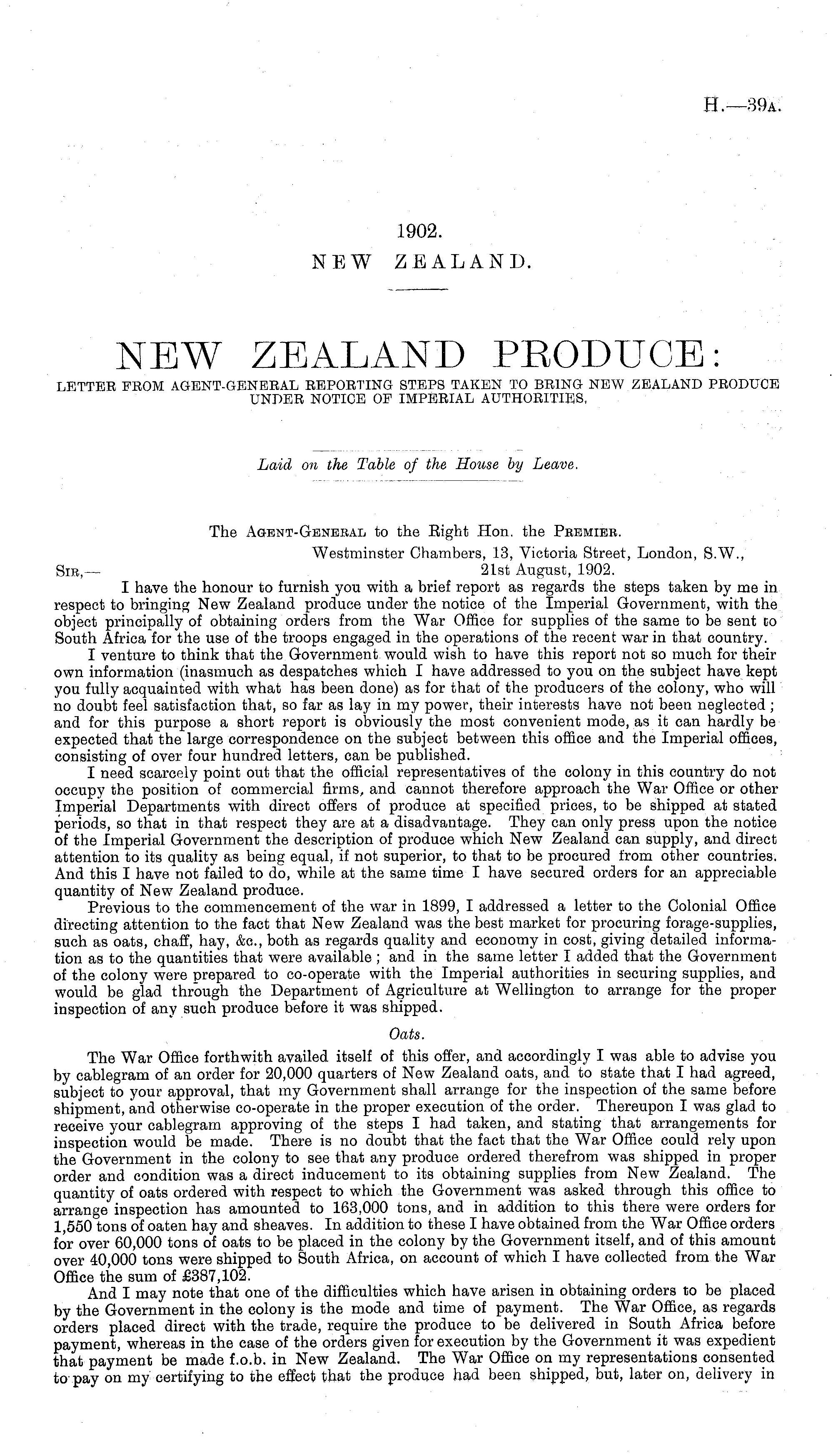 The Agent-General to the Right Hon. the Premier. Westminster Chambers, 13, Victoria Street, London, S.W., Sir,— 21st August, 1902. I have the honour to furnish you with a brief report as regards the steps taken by me in respect to bringing New Zealand produce under the notice of the Imperial Government, with the object principally of obtaining orders from the War Office for supplies of the same to be sent to South Africa for the use of the troops engaged in the operations of the recent war in that country. I venture to think that the Government would wish to have this report not so much for their own information (inasmuch as despatches which I have addressed to you on the subject have kept you fully acquainted with what has been done) as for that of the producers of the colony, who will no doubt feel satisfaction that, so far as lay in my power, their interests have not been neglected; and for this purpose a short report is obviously the most convenient mode, as it can hardly be expected that the large correspondence on the subject between this office and the Imperial offices, consisting of over four hundred letters, can be published. I need scarcely point out that the official representatives of the colony in this country do not occupy the position of commercial firms, and cannot therefore approach the War Office or other Imperial Departments with direct offers of produce at specified prices, to be shipped at stated periods, so that in that respect they are at a disadvantage. They can only press upon the notice of the Imperial Government the description of produce which New Zealand can supply, and direct attention to its quality as being equal, if not superior, to that to be procured from other countries. And this I have not failed to do, while at the same time I have secured orders for an appreciable quantity of New Zealand produce. Previous to the commencement of the war in 1899, I addressed a letter to the Colonial Office directing attention to the fact that New Zealand was the best market for procuring forage-supplies, such as oats, chaff, hay, &c, both as regards quality and economy in cost, giving detailed information as to the quantities that were available ; and in the same letter I added that the Government of the colony were prepared to co-operate with the Imperial authorities in securing supplies, and would be glad through the Department of Agriculture at Wellington to arrange for the proper inspection of any such produce before it was shipped. Oats. The War Office forthwith availed itself of this offer, and accordingly I was able to advise you by cablegram of an order for 20,000 quarters of New Zealand oats, and to state that I had agreed, subject to your approval, that my Government shall arrange for the inspection of the same before shipment, and otherwise co-operate in the proper execution of the order. Thereupon I was glad to receive your cablegram approving of the steps I had taken, and stating that arrangements for inspection would be made. There is no doubt that the fact that the War Office could rely upon the Government in the colony to see that any produce ordered therefrom was shipped in proper order and condition was a direct inducement to its obtaining supplies from New Zealand. The quantity of oats ordered with respect to which the Government was asked through this office to arrange inspection has amounted to 163,000 tons, and in addition to this there were orders for 1,550 tons of oaten hay and sheaves. In addition to these I have obtained from the War Office orders for over 60,000 tons of oats to be placed in the colony by the Government itself, and of this amount over 40,000 tons were shipped to South Africa, on account of which I have collected from the War Office the sum of £387,102. And I may note that one of the difficulties which have arisen in obtaining orders to be placed by the Government in the colony is the mode and time of payment. The War Office, as regards orders placed direct with the trade, require the produce to be delivered in South Africa before payment, whereas in the case of the orders given for execution by the Government it was expedient that payment be made f.o.b. in New Zealand. The War Office on my representations consented to pay on my certifying to the effect that the produce had been shipped, but, later on, delivery in