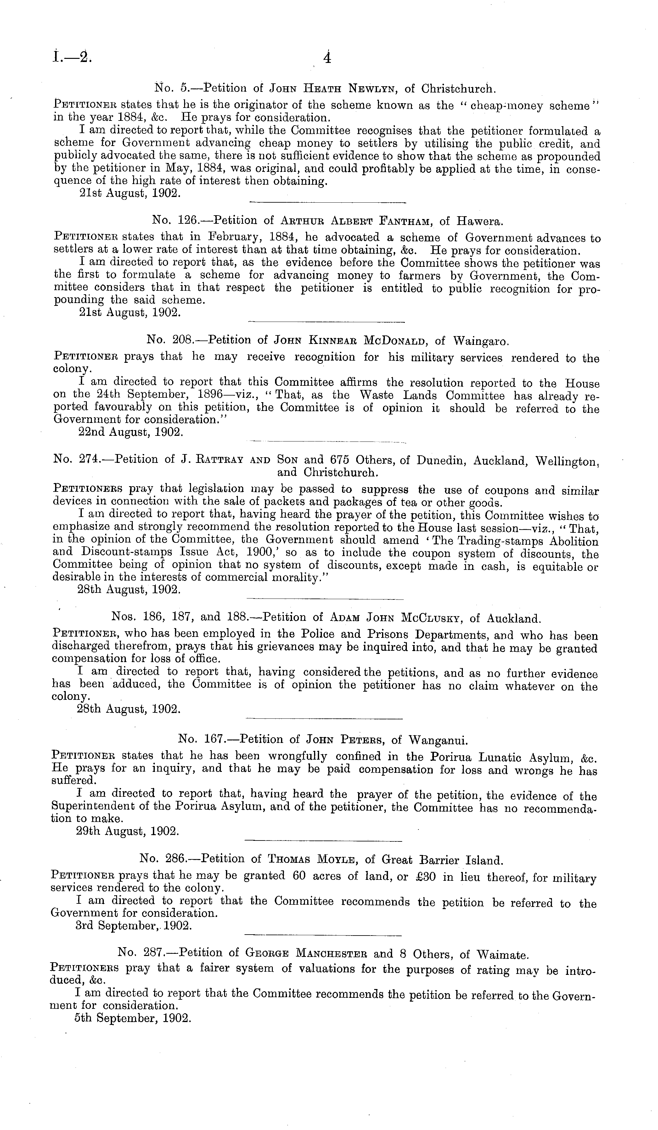 No. s.—Petition of John Heath Newlyn, of Christchurch. Petitionee states that he is the originator of the scheme known as the " cheap-money scheme" in the year 1884, &c. He prays for consideration. I am directed to report that, while the Committee recognises that the petitioner formulated a scheme for Government advancing cheap money to settlers by utilising the public credit, and publicly advocated the same, there is not sufficient evidence to show that the scheme as propounded by the petitioner in May, 1884, was original, and could profitably be applied at the time, in consequence of the high rate of interest then obtaining. 21st August, 1902.