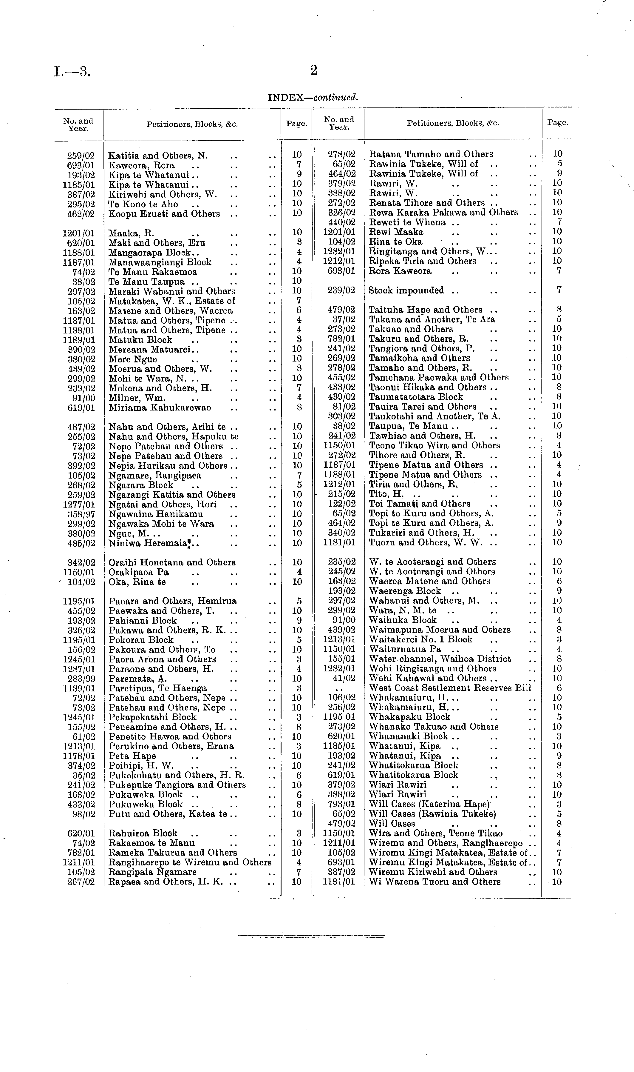No. and Year. Petitioners, Blocks, &c. No. and Pa § e - J Year. Petitioners, Blocks, &c. Page. 259/02 693/01 193/02 1185/01 387/02 295/02 462/02 Katitia and Others, N. Kaweora, P»ora Kipa te Whatanui Kipa te Whatanui Kiriwehi and Others, W. .. Te Kono te Aho Koopu Erueti and Others 10 7 9 10 10 10 10 278/02 65/02 464/02 379/02 388/02 272/02 326/02 440/02 1201/01 104/02 1282/01 1212/01 693/01 Ratana Tamaho and Others Rawinia Tukeke, Will of .. Rawinia Tukeke, Will of .. Rawiri, W. Rawiri, W. Renata Tihore and Others .. Rewa Karaka Pakawa and Others .. Reweti te Whena .. Rewi Maaka Rina te Oka Bingitanga and Others, W... Ripeka Tiria and Others Rora Kaweora 10 5 9 10 10 10 10 7 10 10 10 10 7 1201/01 620/01 1188/01 1187/01 74/02 38/02 297/02 105/02 163/02 1187/01 1188/01 1189/01 390/02 380/02 439/02 299/02 239/02 91/00 619/01 Maaka, R. Maki and Others, Eru Mangaorapa Blook.. Manawaangiangi Block Te Manu Rakaemoa Te Manu Taupua Maraki Wahanui and Others Matakatea, W. K., Estate of Matene and Others, Waeroa Matua and Others, Tipene Matua and Others, Tipene Matuku Block Mereana Matuarei.. Mere Ngue Moerua and Others, W. Mohi te Wara, N. .. Mokena and Others, H. Milner, Wm. Miriama Kahukarewao 10 3 4 4 10 10 10 7 6 4 4 3 10 10 8 10 7 i 8 239/02 479/02 37/02 273/02 782/01 241/02 269/02 278/02 455/02 433/02 439/02 81/02 303/02 38/02 241/02 1150/01 272/02 1187/01 1188/01 1212/01 215/02 122/02 65/02 464/02 340/02 1181/01 Stock impounded Taituha Hape and Others Takana and Another, Te Ara Takuao and Others Takuru and Others, R. Tangiora and Others, P. Tamaikoha and Others Tamaho and Others, R. Tamehana Paewaka and Others T&onui Hikaka and Others Taumatatotara Block Tauira Tarei and Others Taukotahi and Another, Te A. Taupua, Te Manu Tawhiao and Others, H. .. Teone Tikao Wira and Others Tihore and Others, R. Tipene Matua and Others Tipene Matua and Others Tiria and Others, R, Tito, H. .. Toi Tamatt and Others Topi te Kuru and Others, A. Topi te Kuru and Others, A. Tukariri and Others, H. Tuoru and Others, W. W. .. 7 8 5 10 10 10 10 10 10 8 8 10 10 10 8 4 10 4 4 10 10 10 5 9 10 10 487/02 255/02 72/02 73/02 392/02 105/02 268/02 259/02 1277/01 358/97 299/02 380/02 485/02 Nahu and Others, Arihi te .. Nahu and Others, Hapuku te Nepe Patehau and Others Nepe Patehau and Others Nepia Hurikau and Others .. Ngamare, Rangipaea Ngarara Block Ngarangi Katitia and Others Ngatai and Others, Hori Ngawaina Hanikamu Ngawaka Mohi te Wara Ngue, M. .. Niniwa HeremaiaJ.. 10 10 10 10 10 7 5 10 10 10 10 10 10 342/02 1150/01 • 104/02 1195/01 455/02 193/02 326/02 1195/01 156/02 1245/01 1287/01 283/99 1189/01 72/02 73/02 1245/01 155/02 61/02 1213/01 1178/01 374/02 35/02 241/02 163/02 433/02 98/02 Oraihi Honetana and Others Orakipaoa Pa Oka, Rina te Paeara and Others, Hemirua Paewaka and Others, T. Pahianui Block Pakawa and Others, R. K. .. Pokorau Block Pakoura and Others, Te Paora Arona and Others Paraone and Others, H. Paremata, A. Paretipua, Te Haenga Patehau and Others, Nepe Patehau and Others, Nepe Pekapekatahi Block Peneamine and Others, H. .. Penetito Hawea and Others Perukino and Others, Erana Peta Hape Poihipi, H. W. Pukekohatu and Others, H. R. Pukepuke Tangiora and Others Pukuweka Blook Pukuweka Block .. Putu and Others, Katea te .. 10 4 10 5 10 9 10 5 10 3 4 10 3 10 10 8 8 10 3 10 10 6 10 6 8 10 235/02 245/02 163/02 193/02 297/02 299/02 91/00 439/02 1213/01 1150/01 155/01 1282/01 41/02 106/02 256/02 1195 01 273/02 620/01 1185/01 193/02 241/02 619/01 379/02 388/02 793/01 65/02 479/02 1150/01 1211/01 105/02 693/01 387/02 1181/01 W. te Aooterangi and Others W. te Aooterangi and Others Waeroa Matene and Others Waerenga Block Wahanui and Others, M. .. Wara, N. M. te .. Waihuka Block Waimapuna Moerua and Others Waitakerei No. 1 Blook Waituruatua Pa Water-ohanne), Waihoa District Wehi Ringitanga and Others Wehi Kahawai and Others West Coast Settlement Reserves Bill Whakamaiuru, H. .. Whakamaiuru, H. .. Whakapaku Block Whanako Takuao and Others Whananaki Block Whatanui, Kipa Whatanui, Kipa Whatitokarua Block Whatitokarua Block Wiari Rawiri Wiari Rawiri Will Cases (Katerina Hape) Will Oases (Rawinia Tukeke) Will Cases Wira and Others, Teone Tikao Wiremu and Others, Ranglhaerepo .. Wiremu Kingi Matakatea, Estate of.. Wiremu Kingi Matakatea, Estate of.. Wiremu Kiriwehi aud Others Wi Warena Tuoru and Others 10 10 6 9 10 10 4 8 3 4 8 10 10 6 .10 10 5 10 3 10 9 8 8 10 JO 3 5 8 4 4 7 7 10 10 620/01 74/02 782/01 1211/01 105/02 267/02 Rahuiroa Block Rakaemoa te Manu Rameka Takurua and Others Rangihaerepo te Wiremu and Others Rangipaia Ngamare Rapaea and Others, H. K. .. 3 10 10 4 7 10