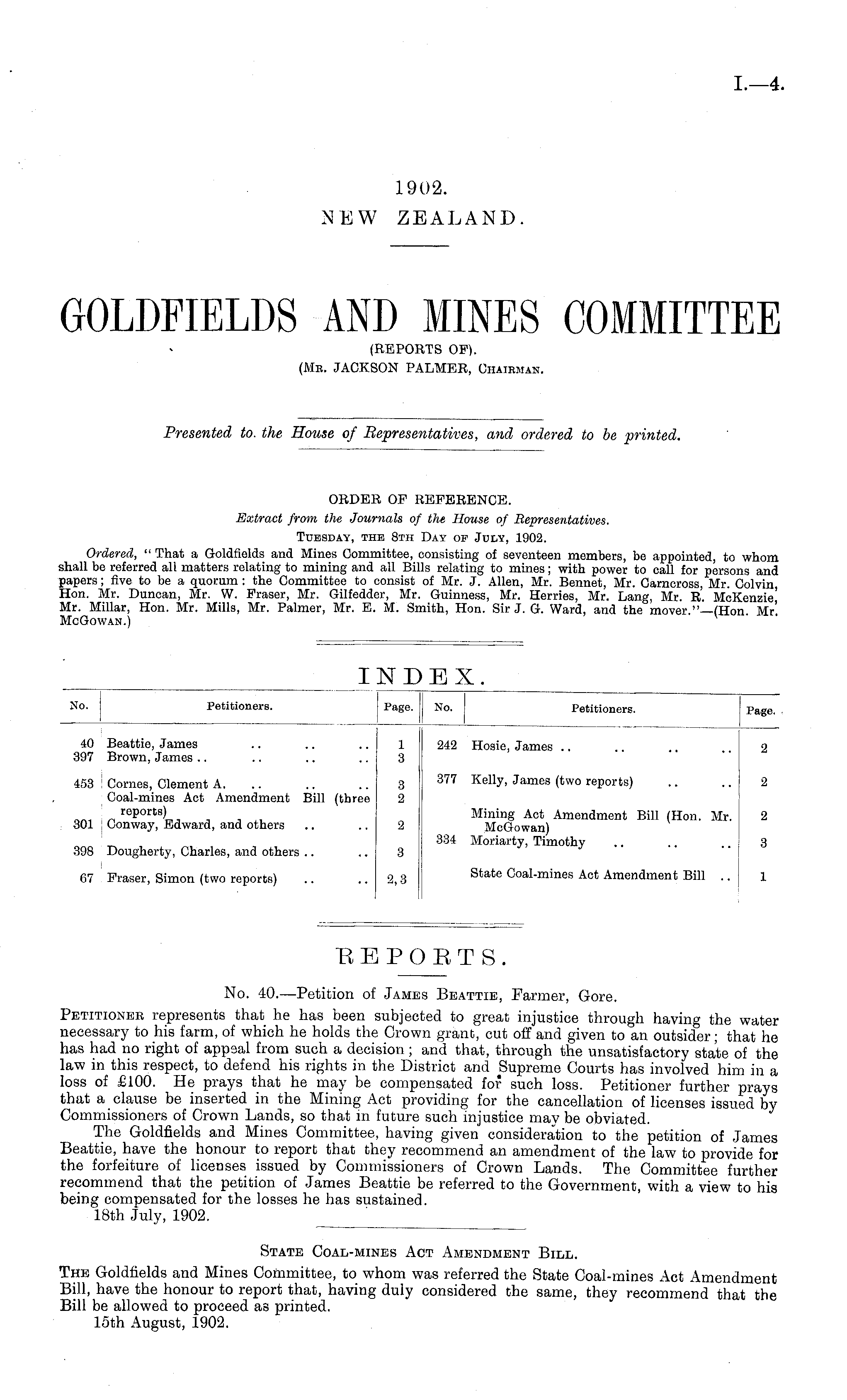 No. 40.—Petition of James Beattie, Farmer, Gore. Petitioner represents that he has been subjected to great injustice through having the water necessary to his farm, of which he holds the Crown grant, cut off and given to an outsider; that he has had no right of appeal from such a decision ; and that, through the unsatisfactory state of the law in this respect, to defend his rights in the District and Supreme Courts has involved him in a loss of £100. He prays that he may be compensated for such loss. Petitioner further prays that a clause be inserted in the Mining Act providing for the cancellation of licenses issued by Commissioners of Crown Lands, so that in future such injustice may be obviated. The Goldfields and Mines Committee, having given consideration to the petition of James Beattie, have the honour to report that they recommend an amendment of the law to provide for the forfeiture of licenses issued by Commissioners of Crown Lands. The Committee further recommend that the petition of James Beattie be referred to the Government, with a view to his being compensated for the losses he has sustained. 18th July, 1902. '