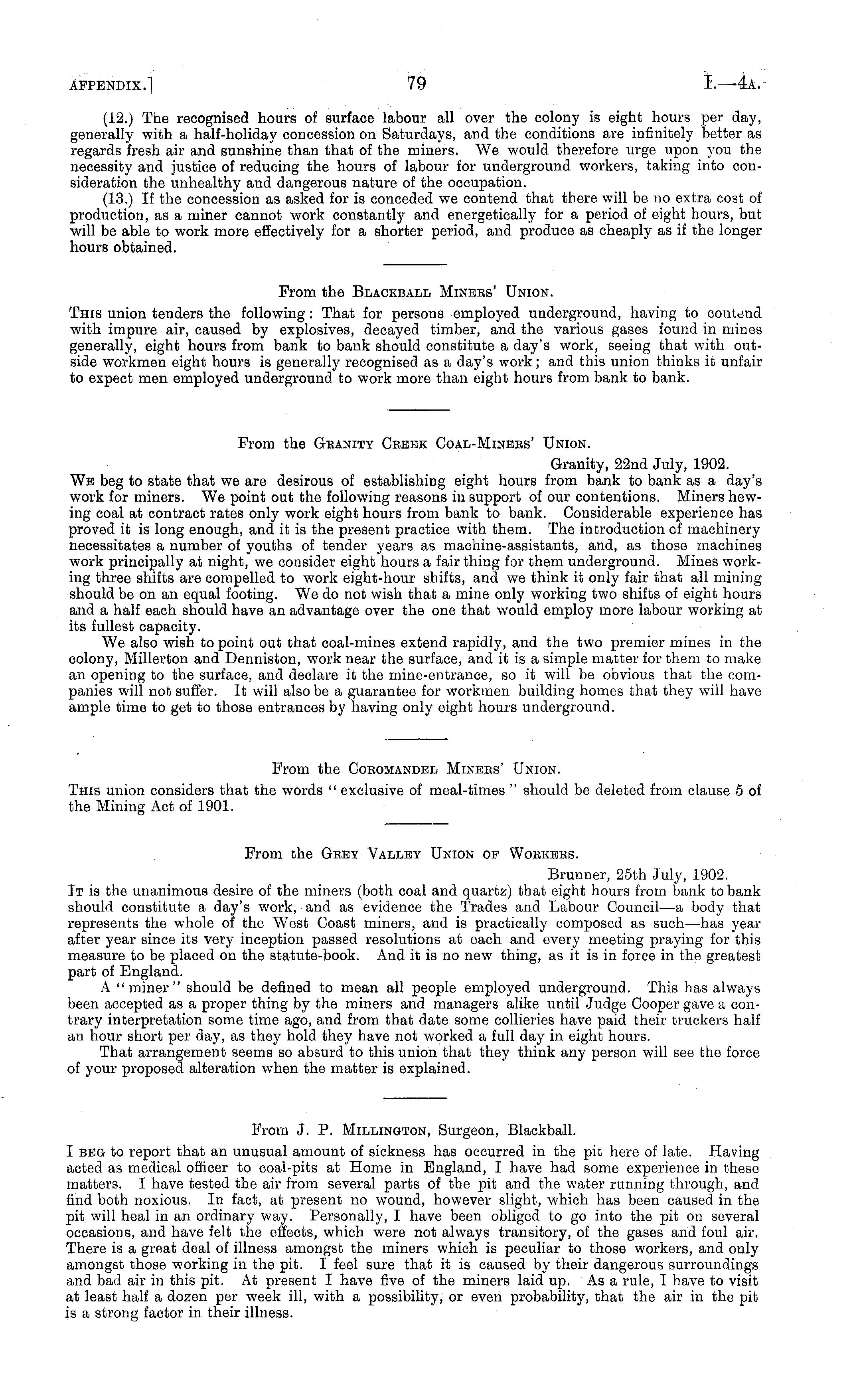 From the Granity Ceeek Coal-Minees' Union. Granity, 22nd July, 1902. We beg to state that we are desirous of establishing eight hours from bank to bank as a day's work for miners. We point out the following reasons in support of our contentions. Miners hewing coal at contract rates only work eight hours from bank to bank. Considerable experience has proved it is long enough, and it is the present practice with them. The introduction of machinery necessitates a number of youths of tender years as machine-assistants, and, as those machines work principally at night, we consider eight hours a fair thing for them underground. Mines working three shifts are compelled to work eight-hour shifts, and we think it only fair that all mining should be on an equal footing. We do not wish that a mine only working two shifts of eight hours and a half each should have an advantage over the one that would employ more labour working at its fullest capacity. We also wish to point out that coal-mines extend rapidly, and the two premier mines in the colony, Millerton and Denniston, work near the surface, and it is a simple matter for them to make an opening to the surface, and declare it the mine-entrance, so it will be obvious that the companies will not suffer. It will also be a guarantee for workmen building homes that they will have ample time to get to those entrances by having only eight hours underground.