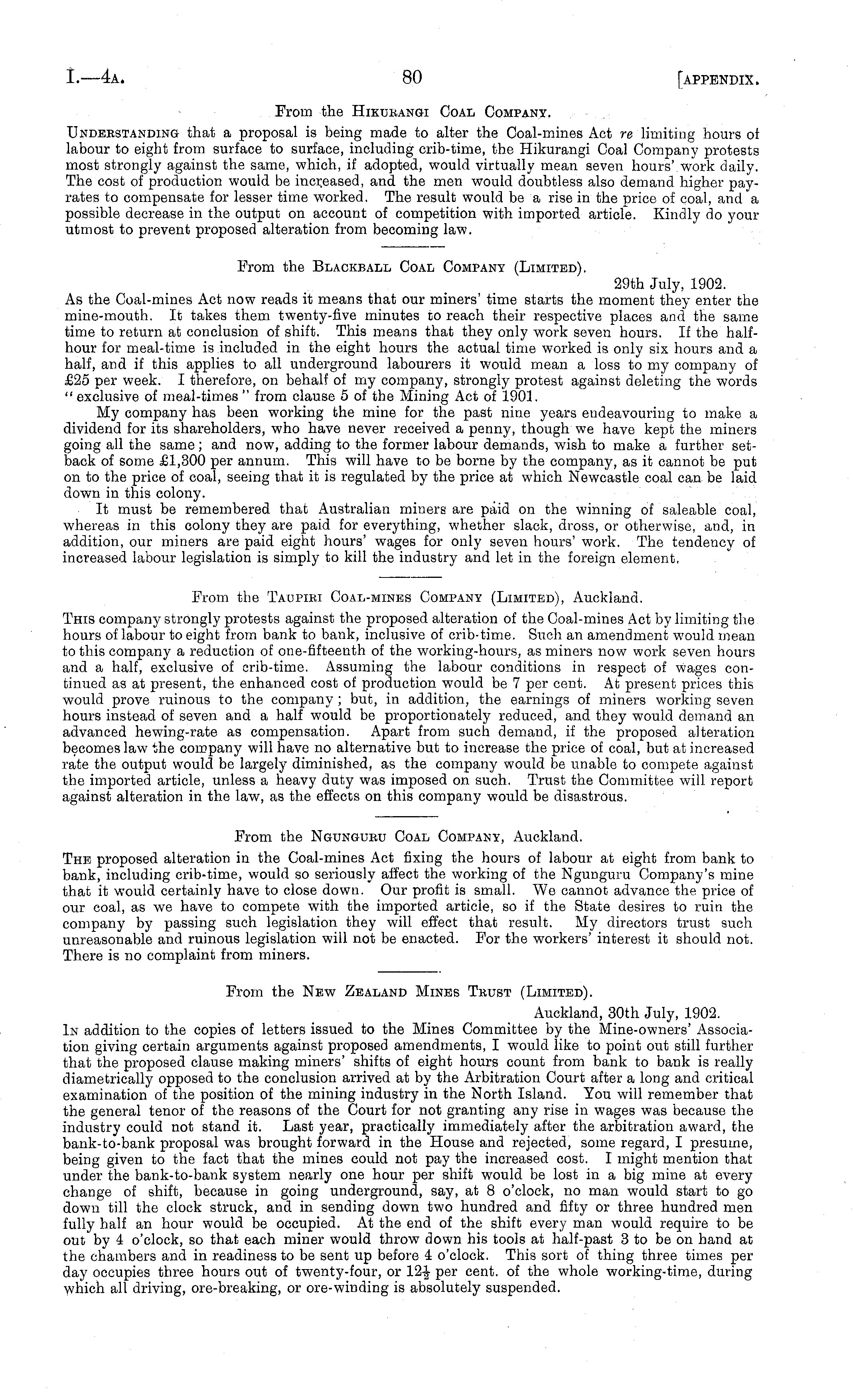 From the Blackball Coal Company (Limited). 29th July, 1902. As the Coal-mines Act now reads it means that our miners' time starts the moment they enter the mine-mouth. It takes them twenty-five minutes to reach their respective places and the same time to return at conclusion of shift. This means that they only work seven hours. If the halfhour for meal-time is included in the eight hours the actual time worked is only six hours and a half, and if this applies to all underground labourers it would mean a loss to my company of £25 per week. I therefore, on behalf of my company, strongly protest against deleting the words " exclusive of meal-times " from clause 5 of the Mining Act of 1901. My company has been working the mine for the past nine years endeavouring to make a dividend for its shareholders, who have never received a penny, though we have kept the miners going all the same; and now, adding to the former labour demands, wish to make a further sethack of some £1,300 per annum. This will have to be borne by the company, as it cannot be put on to the price of coal, seeing that it is regulated by the price at which Newcastle coal can be laid down in this colony. It must be remembered that Australian miners are paid on the winning of saleable coal, whereas in this colony they are paid for everything, whether slack, dross, or otherwise, and, in addition, our miners are paid eight hours' wages for only seven hours' work. The tendency of increased labour legislation is simply to kill the industry and let in the foreign element.