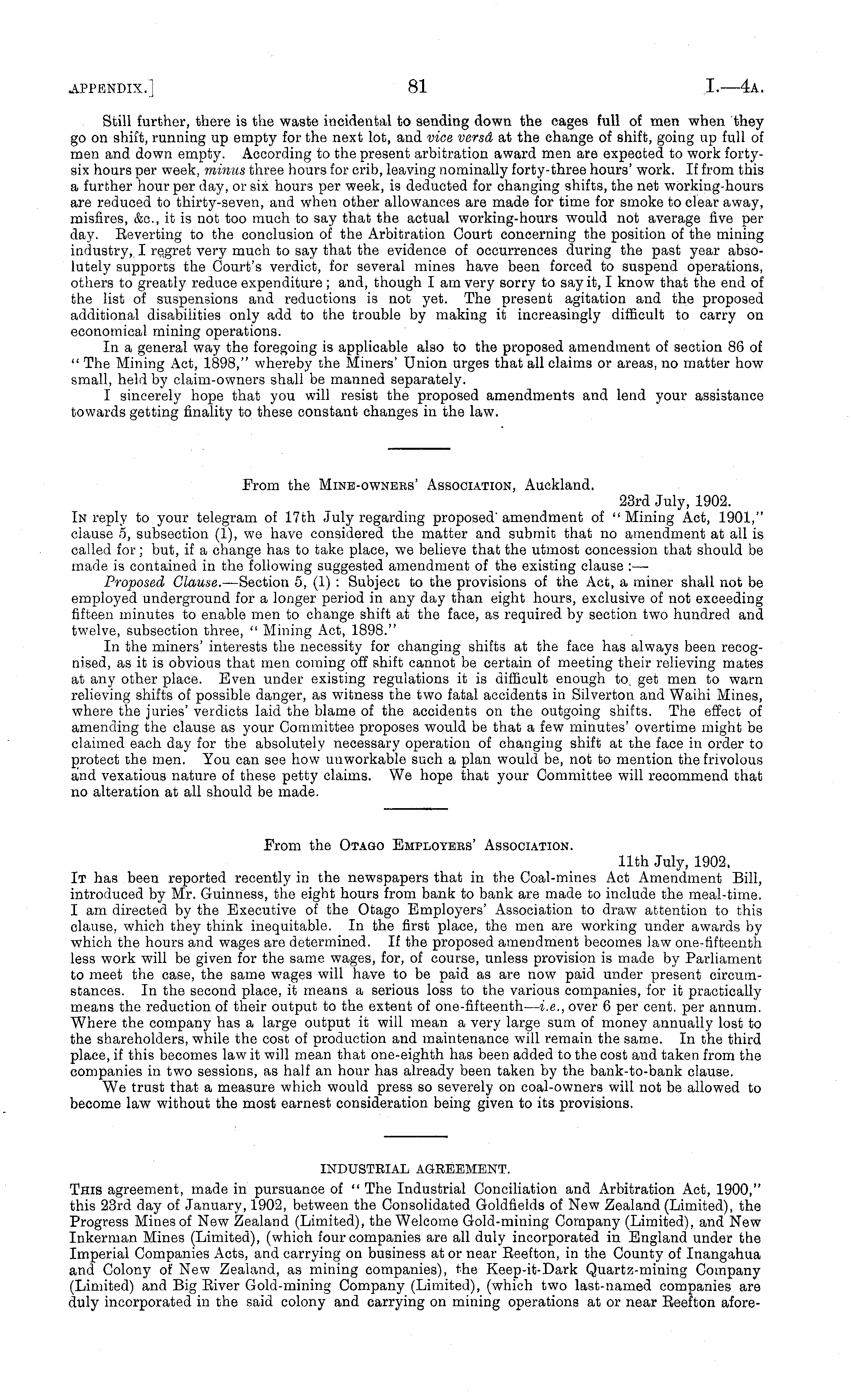INDUSTRIAL AGREEMENT. This agreement, made in pursuance of " The Industrial Conciliation and Arbitration Act, 1900," this 23rd day of January, 1902, between the Consolidated Goldfields of New Zealand (Limited), the Progress Mines of New Zealand (Limited), the Welcome Gold-mining Company (Limited), and New Inkerman Mines (Limited), (which four companies are all duly incorporated in England under the Imperial Companies Acts, and carrying on business at or near Reefton, in the County of Inangahua and Colony of New Zealand, as mining companies), the Keep-it-Dark Quartz-mining Company (Limited) and Big River Gold-mining Company (Limited), (which two last-named companies are duly incorporated in the said colony and carrying on mining operations at or near Reefton afore-