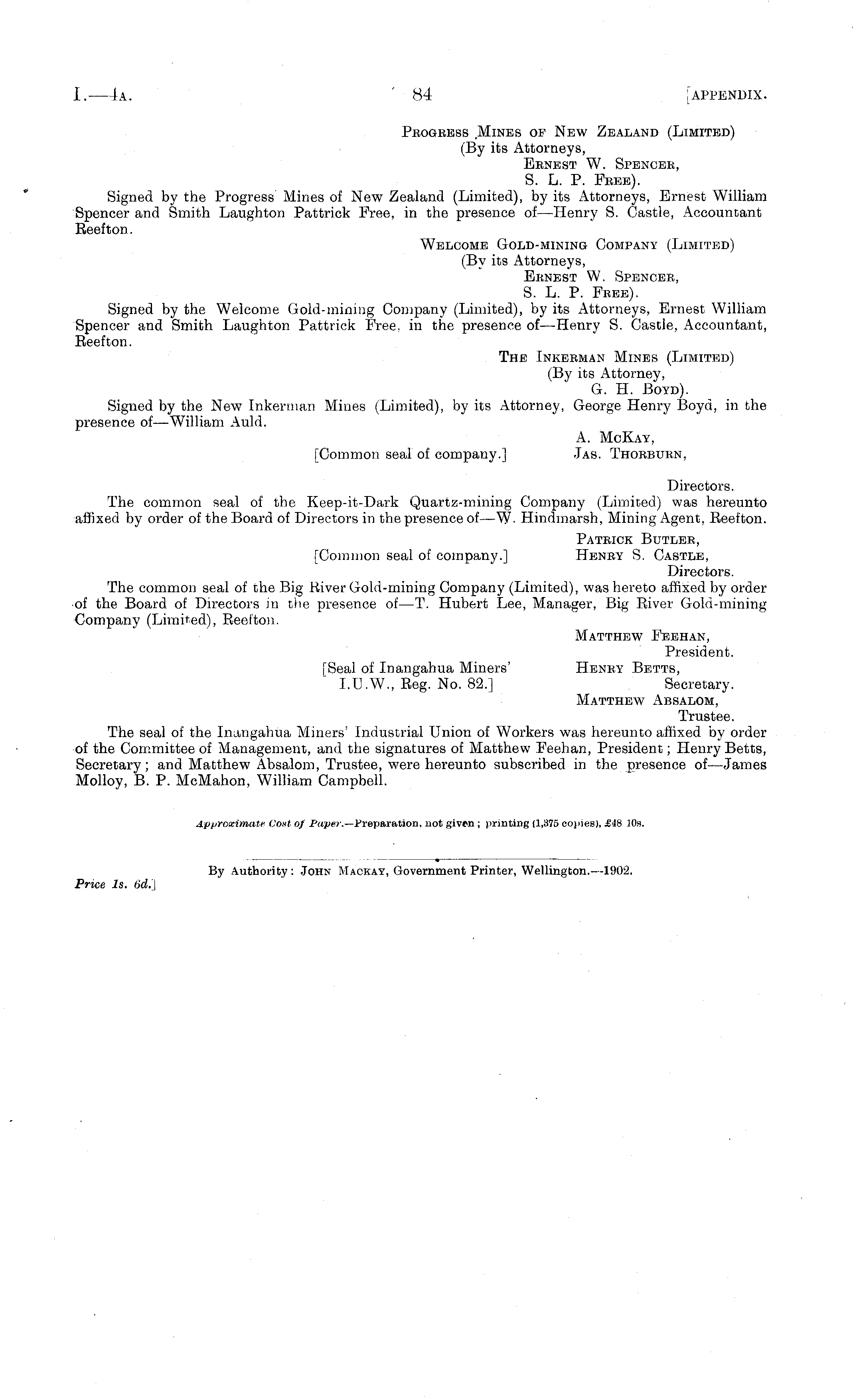 Peogeess Mines of New Zealand (Limited) (By its Attorneys, Ernest W. Spencer, S. L. P. Fees). Signed by the Progress Mines of New Zealand (Limited), by its Attorneys, Ernest William Spencer and Smith Laughton Pattrick Free, in the presence of—Henry S. Castle, Accountant Reefton. Welcome Gold-mining Company (Limited) (By its Attorneys, Ernest W. Spencer, S. L. P. Free). Signed by the Welcome Gold-mining Company (Limited), by its .attorneys, Ernest William Spencer and Smith Laughton Pattrick Free, in the presence of—Henry S. Castle, Accountant, Reefton. The Inkerman Mines (Limited) (By its Attorney, G. H. Boyd). Signed by the New Inkerman Mines (Limited), by its Attorney, George Henry Boyd, in the presence of—William .^uld. A. McKay, [Common seal of company.] Jas. Thoeburn, Directors. The common seal of the Keep-it-Dark Quartz-mining Company (Limited) was hereunto affixed by order of the Board of Directors in the presence of—W- Hindmarsh, Mining Agent, Reefton. Patrick Butler, [Common seal of company.] Henry S. Castle, Directors. The common seal of the Big River Gold-mining Company (Limited), was hereto affixed by order of the Board of Directors in the presence of—T. Hubert Lee, Manager, Big River Gold-mining Company (Limited), Reefton. Matthew Feehan, President. [Seal of Inangahua Miners' Henry Betts, 1.D.W., Reg. No. 82.] Secretary. Matthew .Absalom, Trustee. The seal of the Inangahua Miners' Industrial Union of Workers was hereunto affixed by order of the Committee of Management, and the signatures of Matthew Feehan, President; Henry Betts, Secretary; and Matthew Absalom, Trustee, were hereunto subscribed in the presence of —James Molloy, B. P. McMahon, William Campbell.