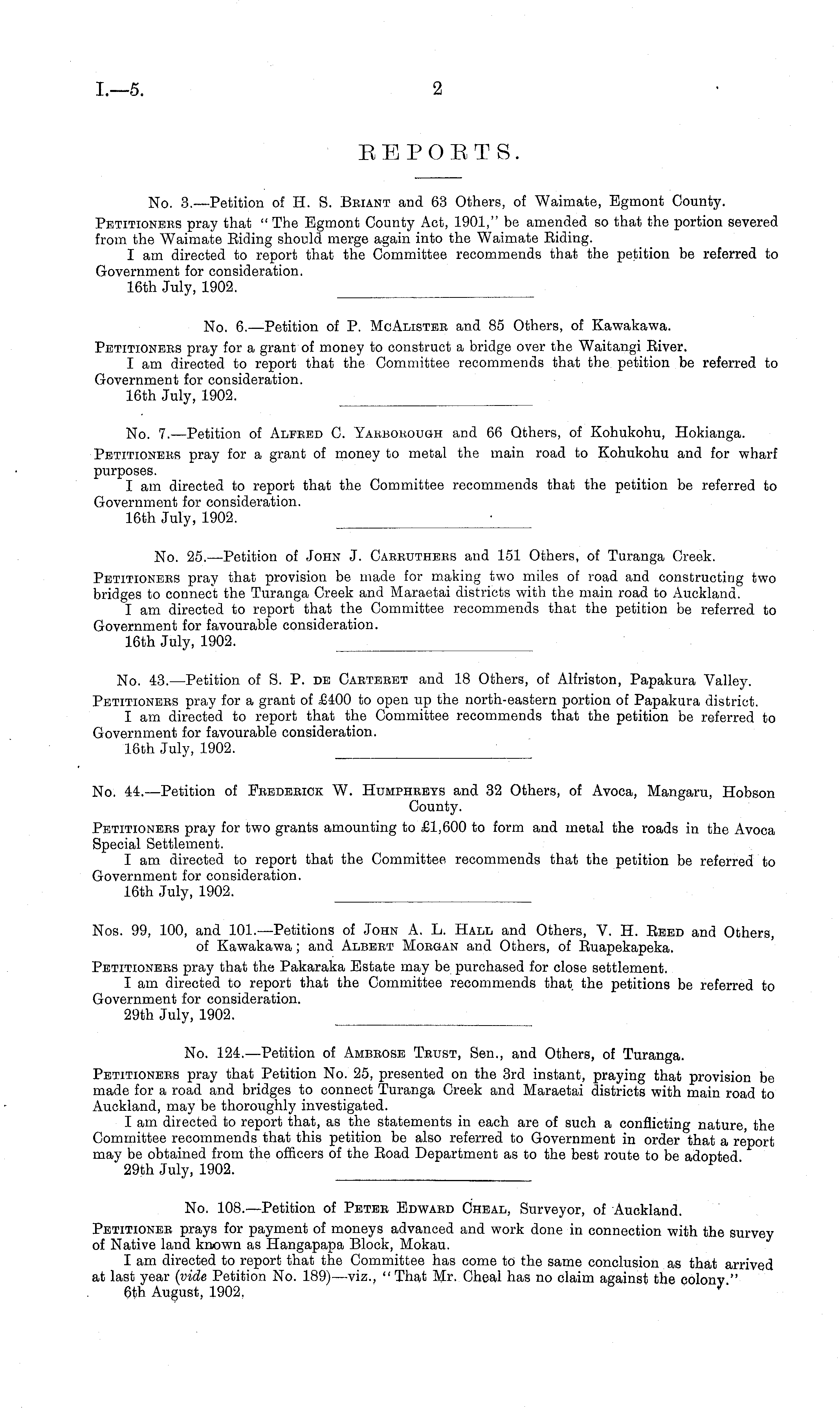 No. 124.—Petition of Ambrose Trust, Sen., and Others, of Turanga. Petitioners pray that Petition No. 25, presented on the 3rd instant, praying that provision be made for a road and bridges to connect Turanga Creek and Maraetai districts with main road to Auckland, may be thoroughly investigated. I am directed to report that, as the statements in each are of such a conflicting nature, the Committee recommends that this petition be also referred to Government in order that a report may be obtained from the officers of the Boad Department as to the best route to be adopted 29th July, 1902.