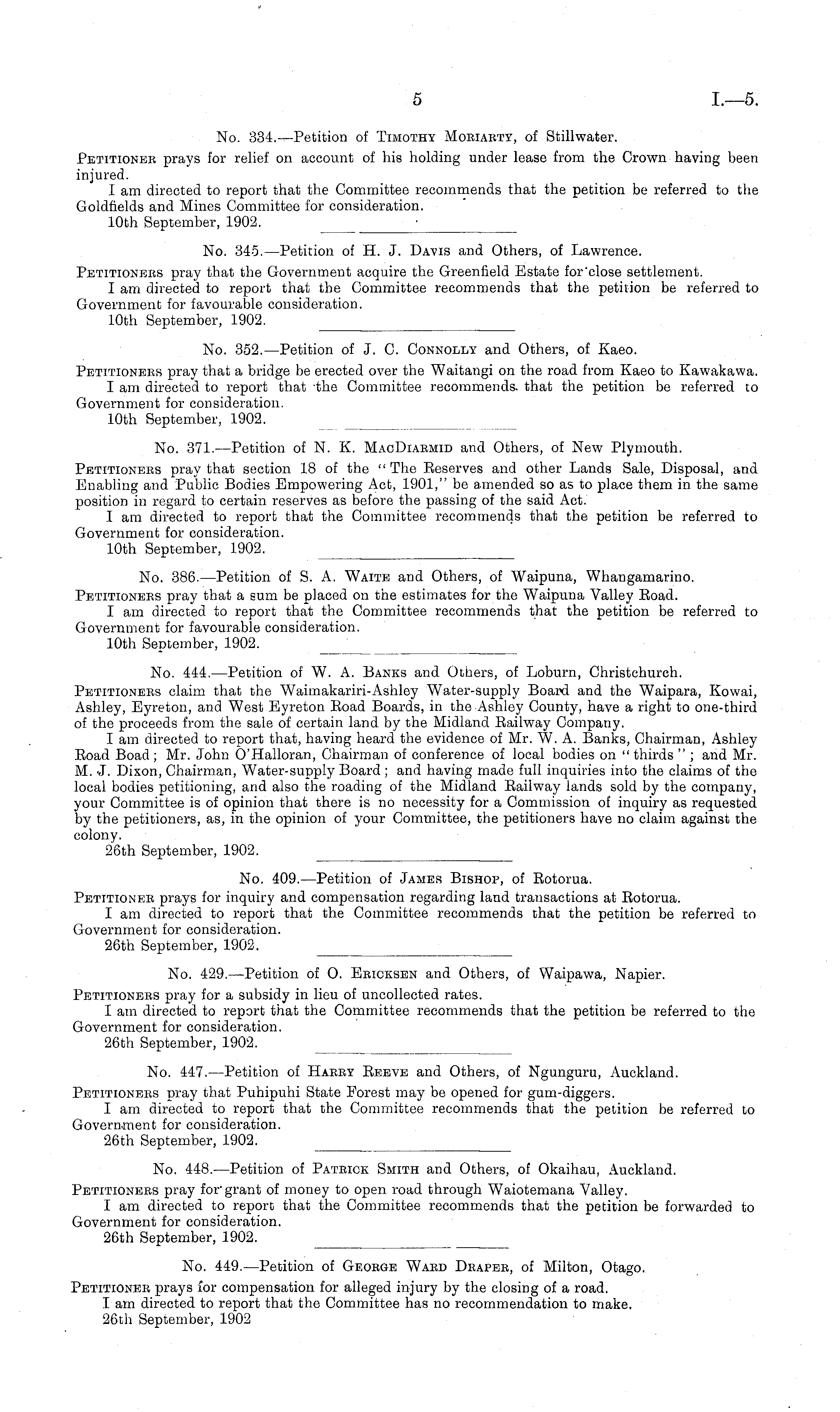No. 449. —Petition of George Wabd Dbapbr, of Milton, Otago. Petitioner prays for compensation for alleged injury by the closing of a road. I am directed to report that the Committee has no recommendation to make. 26th September, 1902