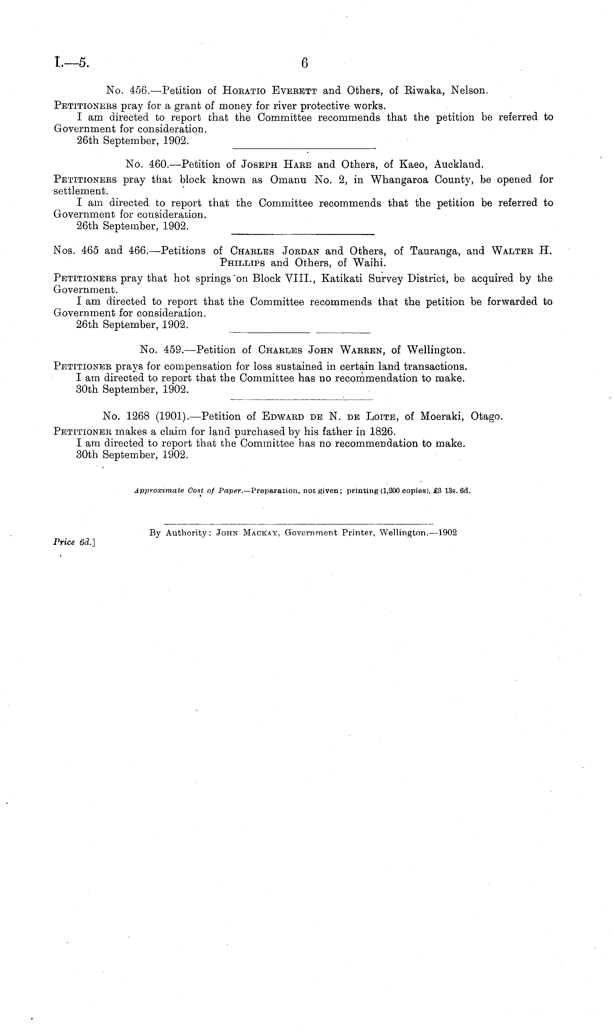 No. 1268 (1901). —Petition of Edward de N. de Loite, of Moeraki, Otago. Petitioner makes a claim for land purchased by his father in 1826. I am directed to report that the Committee has no recommendation to make. 30th September, 1902. Approximate Cost of Paper. —Preparation, not given; printing (1,200 copies). £3 13s. 6d.
