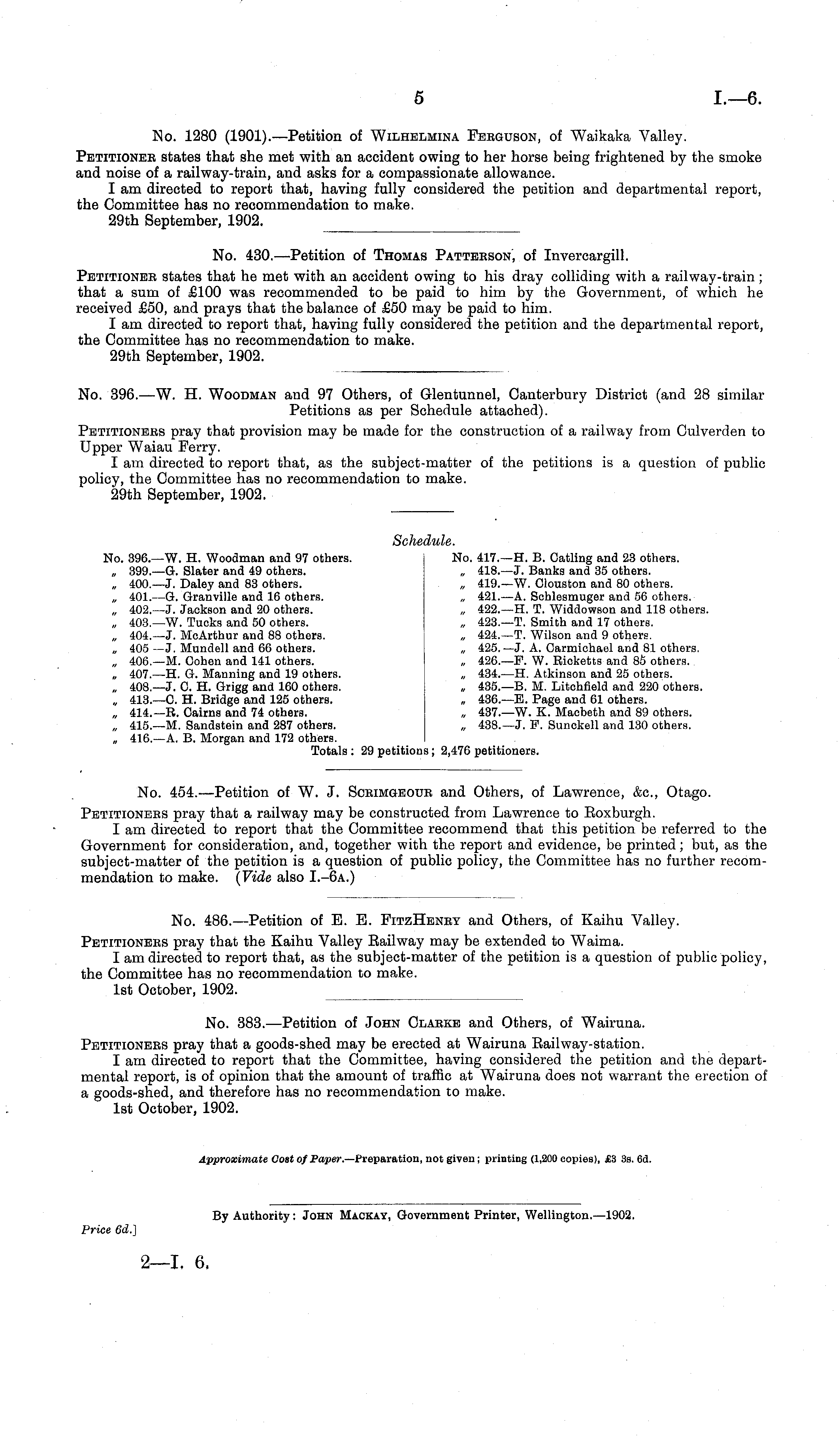 No. 396.— W. H. Woodman and 97 Others, of Glentunnel, Canterbury District (and 28 similar Petitions as per Schedule attached). Petitioners pray that provision may be made for the construction of a railway from Culverden to Upper Waiau Ferry. I am directed to report that, as the subject-matter of the petitions is a question of public policy, the Committee has no recommendation to make. 29th September, 1902.