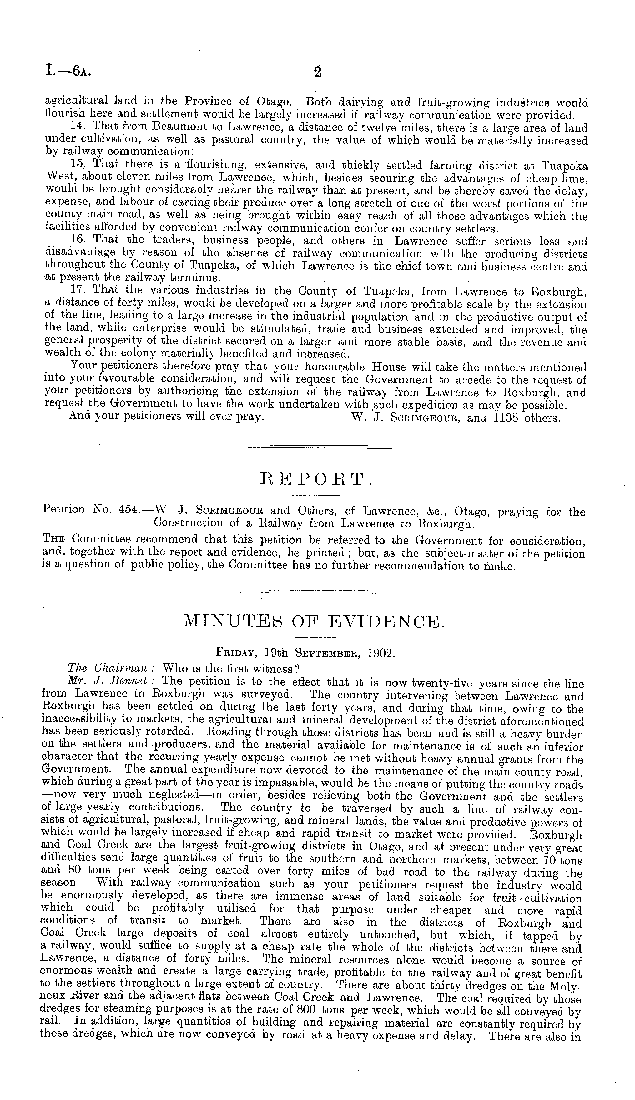 Feiday, 19th Septembee, 1902. The Chairman: Who is the first witness? Mr. J. Rennet : The petition is to the effect that it is now twenty-five years since the line from Lawrence to Boxburgh was surveyed. The country intervening between Lawrence and Boxburgh has been settled on during the last forty years, and during that time, owing to the inaccessibility to markets, the agricultural and mineral development of the district aforementioned has been seriously retarded. Boading through those districts has been and is still a heavy burden on the settlers and producers, and the material available for maintenance is of such an inferior character that the recurring yearly expense cannot be met without heavy annual grants from the Government. The annual expenditure now devoted to the maintenance of the main county road, which during a great part of the year is impassable, would be the means of putting the country roads —now very much neglected—in order, besides relieving both the Government and the settlers of large yearly contributions. The country to be traversed by such a line of railway consists of agricultural, pastoral, fruit-growing, and mineral lands, the value and productive powers of which would be largely increased if cheap and rapid transit to market were provided. Boxburgh and Coal Creek are the largest fruit-growing districts in Otago, and at present under very great difficulties send large quantities of fruit to the southern and northern markets, between 70 tons and 80 tons per week being carted over forty miles of bad road to the railway during the season. With railway communication such as your petitioners request the industry would be enormously developed, as there are immense areas of land suitable for fruit - cultivation which could be profitably utilised for that purpose under cheaper and more rapid conditions of transit to market. There are also in the districts of Boxburgh and Coal Creek large deposits of coal almost entirely untouched, but which, if tapped by a railway, would suffice to supply at a cheap rate the whole of the districts between there and Lawrence, a distance of forty miles. The mineral resources alone would become a source of enormous wealth and create a large carrying trade, profitable to the railway and of great benefit to the settlers throughout a large extent of country. There are about thirty dredges on the Molyneux Biver and the adjacent flats between Coal Creek and Lawrence. The coal required by those dredges for steaming purposes is at the rate of 800 tons per week, which would be all conveyed by rail. In addition, large quantities of building and repairing material are constantly required by those dredges, which are now conveyed by road at a heavy expense and delay. There are also in