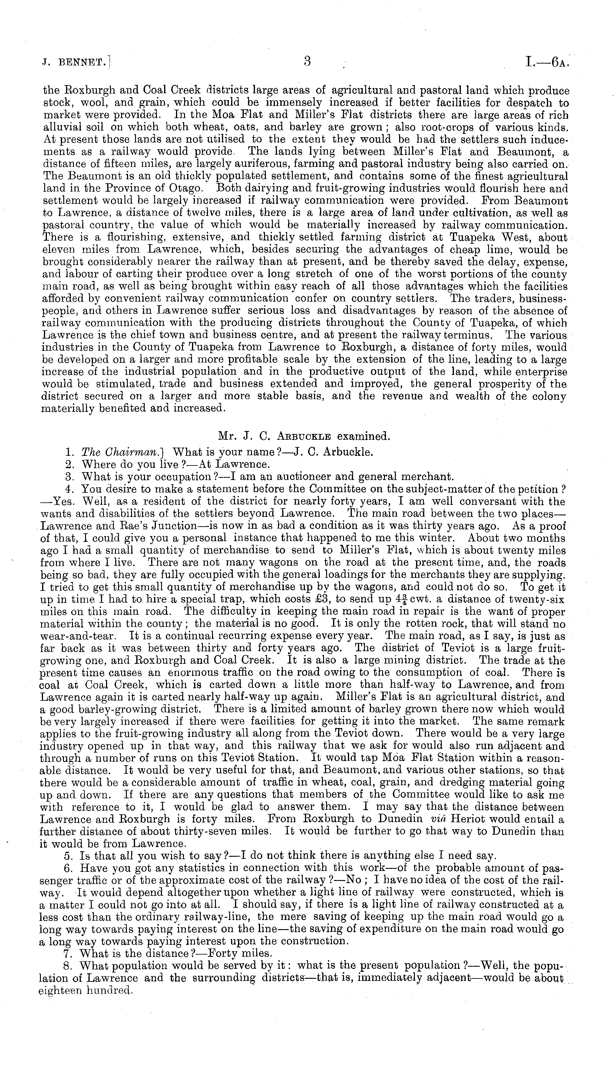 the Boxburgh and Coal Creek districts large areas of agricultural and pastoral land which produce stock, wool, and grain, which could be immensely increased if better facilities for despatch to market were provided. In the Moa Flat and Miller's Flat districts there are large areas of rich alluvial soil on which both wheat, oats, and barley are grown ; also root-crops of various kinds. At present those lands are not Utilised to the extent they would be had the settlers such inducements as a railway would provide. The lands lying between Miller's Flat and Beaumont, a distance of fifteen miles, are largely auriferous, farming and pastoral industry being also carried on. The Beaumont is an old thickly populated settlement, and contains some of the finest agricultural land in the Province of Otago. Both dairying and fruit-growing industries would flourish here and settlement would be largely increased if railway communication were provided. From Beaumont to Lawrence, a distance of twelve miles, there is a large area of land under cultivation, as well as pastoral country, the value of which would be materially increased by railway communication. There is a flourishing, extensive, and thickly settled farming district at Tuapeka West, about eleven miles from Lawrence, which, besides securing the advantages of cheap lime, would be brought considerably nearer the railway than at present, and be thereby saved the delay, expense, and labour of carting their produce over a long stretch of one of the worst portions of the county main road, as well as being brought within easy reach of all those advantages which the facilities afforded by convenient railway communication confer on country settlers. The traders, businesspeople, and others in Lawrence suffer serious loss and disadvantages by reason of the absence of railway communication with the producing districts throughout the County of Tuapeka, of which Lawrence is the chief town and business centre, and at present the railway terminus. The various industries in the County of Tuapeka from Lawrence to Boxburgh, a distance of forty miles, would be developed on a larger and more profitable scale by the extension of the line, leading to a large increase of the industrial population and in the productive output of the land, while enterprise would be stimulated, trade and business extended and improved, the general prosperity of the district secured on a larger and more stable basis, and the revenue and wealth of the colony materially benefited and increased. Mr. J. C. Aebuckle examined. 1. The Chairman.] What is your name?—J. C. Arbuckle. 2. Where do you live ? —At Lawrence. 3. What is your occupation ?—I am an auctioneer and general merchant. 4. You desire to make a statement before the Committee on the subject-matter of the petition? —Yes. Well, as a resident of the district for nearly forty years, I am well conversant with the wants and disabilities of the settlers beyond Lawrence. The main road between the two places— Lawrence and Bae's Junction —is now in as bad a condition as it was thirty years ago. As a proof of that, I could give you a personal instance that happened to me this winter. About two months ago I had a small quantity of merchandise to send to Miller's Flat, which is about twenty miles from where I live. There are not many wagons on the road at the present time, and, the roads being so bad, they are fully occupied with the general loadings for the merchants they are supplying. I tried to get this small quantity of merchandise up by the wagons, and could not do so. To get it up in time I had to hire a special trap, which costs £3, to send up 4-fcwt. a distance of twenty-six miles on this main road. The difficulty in keeping the main road in repair is the want of proper material within the county ; the material is no good. It is only the rotten rock, that will stand no wear-and-tear. It is a continual recurring expense every year. The main road, as I say, is just as far back as it was between thirty and forty years ago. The district of Teviot is a large fruitgrowing one, and Boxburgh and Coal Creek. It is also a large mining district. The trade at the present time causes an enormous traffic on the road owing to the consumption of coal. There is coal at Coal Creek, which is carted down a little more than half-way to Lawrence, and from Lawrence again it is carted nearly half-way up again. Miller's Flat is an agricultural district, and a good barley-growing district. There is a limited amount of barley grown there now which would be very largely increased if there were facilities for getting it into the market. The same remark applies to the fruit-growing industry all along from the Teviot down. There would be a very large industry opened up in that way, and this railway that we ask for would also run adjacent and through a number of runs on this Teviot Station. It would tap Moa Flat Station within a reasonable distance. It would be very useful for that, and Beaumont, and various other stations, so that there would be a considerable amount of traffic in wheat, coal, grain, and dredging material going up and down. If there are any questions that members of the Committee would like to ask me with reference to it, I would be glad to answer them. I may say that the distance between Lawrence and Boxburgh is forty miles. From Boxburgh to Dunedin via Heriot would entail a further distance of about thirty-seven miles. It would be further to go that way to Dunedin than it would be from Lawrence. 5. Is that all you wish to say? —I do not think there is anything else I need say. 6. Have you got any statistics in connection with this work—of the probable amount of passenger traffic or of the approximate cost of the railway ? —No ; I have no idea of the cost of the railway. It would depend altogether upon whether a light line of railway were constructed, which is a matter I could not go into at all. I should say, if there is a light 