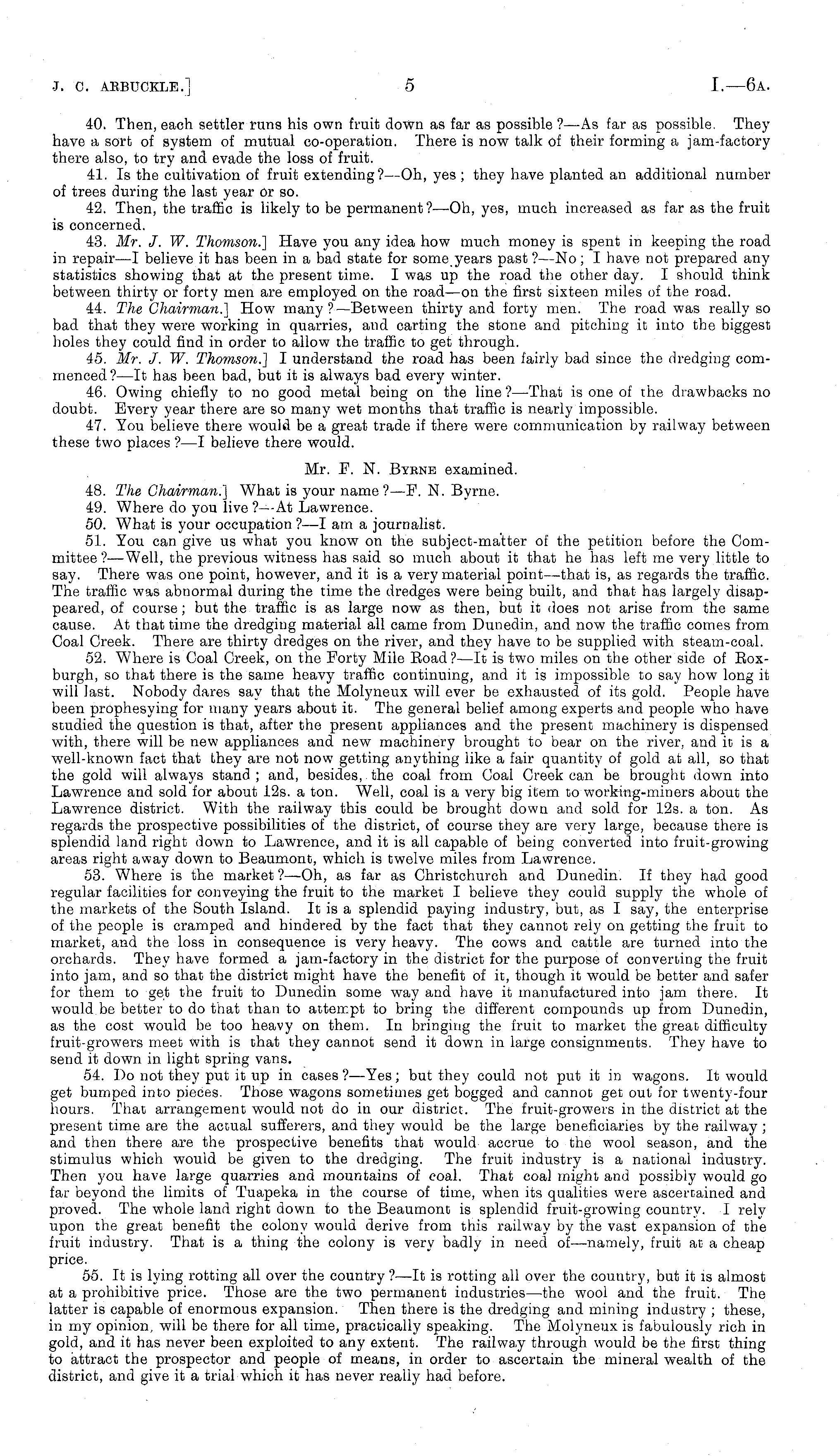 40. Then, each settler runs his own fruit down as far as possible ?—As far as possible. They have a sort of system of mutual co-operation. There is now talk of their forming a jam-factory there also, to try and evade the loss of fruit. 41. Is the cultivation of fruit extending?—Oh, yes ; they have planted an additional number of trees during the last year or so. 42. Then, the traffic is likely to be permanent?—Oh, yes, much increased as far as the fruit is concerned. 43. Mr. J. W. Thomson.] Have you any idea how much money is spent in keeping the road in repair—l believe it has been in a bad state for some years past ?—No; I have not prepared any statistics showing that at the present time. I was up the road the other day. I should think between thirty or forty men are employed on the road—on the first sixteen miles of the road. 44. The Chairman.] How many?—Between thirty and forty men. The road was really so bad that they were working in quarries, and carting the stone and pitching it into the biggest holes they could find in order to allow the traffic to get through. 45. Mr. J. W. Thomson.] I understand the road has been fairly bad since the dredging commenced ?—lt has been bad, but it is always bad every winter. 46. Owing chiefly to no good metal being on the line ?—That is one of the drawbacks no doubt. Every year there are so many wet months that traffic is nearly impossible. 47. You believe there would be a great trade if there were communication by railway between these two places ?—I believe there would. Mr. F. N. Byene examined. 48. The Chairman.] What is your name? —F. N. Byrne. 49. Where do you live ?—At Lawrence. 50. What is your occupation ?—I am a journalist. 51. You can give us what you know on the subject-matter of the petition before the Committee ?—Well, the previous witness has said so much about it that he has left me very little to say. There was one point, however, and it is a very material point—that is, as regards the traffic. The traffic was abnormal during the time the dredges were being built, and that has largely disappeared, of course; but the traffic is as large now as then, but it does not arise from the same cause. At that time the dredging material all came from Dunedin, and now the traffic comes from Coal Creek. There are thirty dredges on the river, and they have to be supplied with steam-coal. 52. Where is Coal Creek, on the Forty Mile Boad? —It is two miles on the other side of Boxburgh, so that there is the same heavy traffic continuing, and it is impossible to say how long it will last. Nobody dares say that the Molyneux will ever be exhausted of its gold. People have been prophesying for many years about it. The general belief among experts and people who have studied the question is that, after the present appliances and the present machinery is dispensed with, there will be new appliances and new machinery brought to bear on the river, and it is a well-known fact that they are not now getting anything like a fair quantity of gold at all, so that the gold will always stand ; and, besides, the coal from Coal Creek can be brought down into Lawrence and sold for about 12s. a ton. Well, coal is a very big item to working-miners about the Lawrence district. With the railway this could be brought down and sold for 12s. a ton. As regards the prospective possibilities of the district, of course they are very large, because there is splendid land right down to Lawrence, and it is all capable of being converted into fruit-growing areas right away down to Beaumont, which is twelve miles from Lawrence. 53. Where is the market ? —Oh, as far as Christchurch and Dunedin. If they had good regular facilities for conveying the fruit to the market I believe they could supply the whole of the markets of the South Island. It is a splendid paying industry, but, as I say, the enterprise of the people is cramped and hindered by the fact that they cannot rely on getting the fruit to market, and the loss in consequence is very heavy. The cows and cattle are turned into the orchards. They have formed a jam-factory in the district for the purpose of converting the fruit into jam, and so that the district might have the benefit of it, though it would be better and safer for them to get the fruit to Dunedin some way and have it manufactured into jam there. It would be better to do that than to attempt to bring the different compounds up from Dunedin, as the cost would be too heavy on them. In bringing the fruit to market the great difficulty fruit-growers meet with is that they cannot send it down in large consignments. They have to send it down in light spring vans. 54. Do not they put it up in cases? —Yes; but they could not put it in wagons. It would get bumped into pieces. Those wagons sometimes get bogged and cannot get out for twenty-four hours. That arrangement would not do in our district. The fruit-growers in the district at the present time are the actual sufferers, and they would be the large beneficiaries by the railway ; and then there are the prospective benefits that would accrue to the wool season, and the stimulus which would be given to the dredging. The fruit industry is a national industry. Then you have large quarries and mountains of coal. That coal might and possibly would go far beyond the limits of Tuapeka in the course of time, when its qualities were ascertained and proved. The whole land right down to the Beaumont is splendid fruit-growing country. I rely upon the great benefit the colony would derive from this railway by the vast expansion of the fruit industry. That is a thing the colony is very badly in need of—namely, fruit at a cheap price. 55. It is lying rotting all over the country? —It is rotting all over the country, but it is almost at a prohibitive price. Those are the two permanent industries—the wool and the fruit. The latter is capable of enormous expansion. Then there is the dredging and mini
