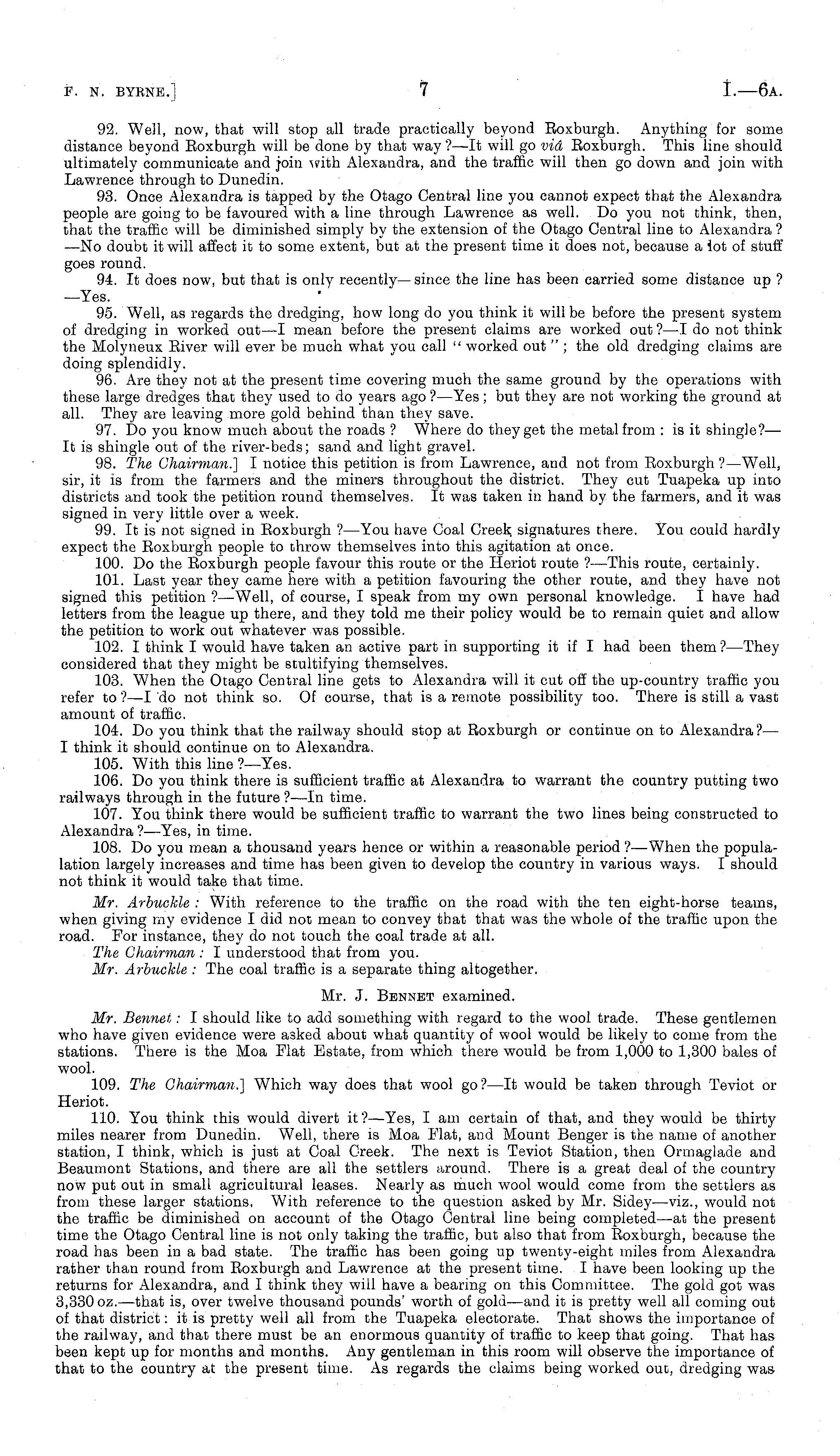 92. Well, now, that will stop all trade practically beyond Boxburgh. Anything for some distance beyond Boxburgh will be done by that way ? —lt will go via Boxburgh. This line should ultimately communicate and join with Alexandra, and the traffic will then go down and join with Lawrence through to Dunedin. 93. Once Alexandra is tapped by the Otago Central line you cannot expect that the Alexandra people are going to be favoured with a line through Lawrence as well. Do you not think, then, that the traffic will be diminished simply by the extension of the Otago Central line to Alexandra ? —No doubt it will affect it to some extent, but at the present time it does not, because a iot of stuff goes round. 94. It does now, but that is only recently— since the line has been carried some distance up ? —Yes. 95. Well, as regards the dredging, how long do you think it will be before the present system of dredging in worked out —I mean before the present claims are worked out ? —I do not think the Molyneux Biver will ever be much what you call " worked out " ; the old dredging claims are doing splendidly. 96. Are they not at the present time covering much the same ground by the operations with these large dredges that they used to do years ago ?—Yes; but they are not working the ground at all. They are leaving more gold behind than they save. 97. Do you know much about the roads ? Where do they get the metal from :is it shingie?— It is shingle out of the river-beds; sand and light gravel. 98. The Chairman.] I notice this petition is from Lawrence, and not from Boxburgh ?—Well, sir, it is from the farmers and the miners throughout the district. They cut Tuapeka up into districts and took the petition round themselves. It was taken in hand by the farmers, and it was signed in very little over a week. 99. It is not signed in Boxburgh ?—You have Coal Creek signatures there. You could hardly expect the Boxburgh people to throw themselves into this agitation at once. 100. Do the Boxburgh people favour this route or the Heriot route ?—This route, certainly. 101. Last year they came here with a petition favouring the other route, and they have not signed this petition ? —Well, of course, I speak from my own personal knowledge. I have had letters from the league up there, and they told me their policy would be to remain quiet and allow the petition to work out whatever was possible. 102. I think I would have taken an active part in supporting it if I had been them? —They considered that they might be stultifying themselves. 103. When the Otago Central line gets to Alexandra will it cut off the up-country traffic you refer to ?—I do not think so. Of course, that is a remote possibility too. There is still a vast amount of traffic. 104. Do you think that the railway should stop at Roxburgh or continue on to Alexandra?— I think it should continue on to Alexandra. 105. With this line ?—Yes. 106. Do you think there is sufficient traffic at Alexandra to warrant the country putting two railways through in the future ? —ln time. 107. You think there would be sufficient traffic to warrant the two lines being constructed to Alexandra?—Yes, in time. 108. Do you mean a thousand years hence or within a reasonable period?—When the populalation largely increases and time has been given to develop the country in various ways. I should not think it would take that time. Mr. Arbuckle : With reference to the traffic on the road with the ten eight-horse teams, when giving my evidence I did not mean to convey that that was the whole of the traffic upon the road. For instance, they do not touch the coal trade at all. The Chairman : I understood that from you. Mr. Arbuckle : The coal traffic is a separate thing altogether. Mr. J. Bennet examined. Mr. Rennet: I should like to add something with regard to the wool trade. These gentlemen who have given evidence were asked about what quantity of wool would be likely to come from the stations. There is the Moa Flat Estate, from which there would be from 1,000 to 1,300 bales of wool. 109. The Chairman.] Which way does that wool go? —It would be taken through Teviot or Heriot. 110. You think this would divert it?—Yes, I am certain of that, and they would be thirty miles nearer from Dunedin. Well, there is Moa Flat, and Mount Benger is the name of another station, I think, which is just at Coal Creek. The next is Teviot Station, then Ormaglade and Beaumont Stations, and there are all the settlers around. There is a great deal of the country now put out in small agricultural leases. Nearly as much wool would come from the settlers as from these larger stations. With reference to the question asked by Mr. Sidey—viz., would not the traffic be diminished on account of the Otago Central line being completed—at the present time the Otago Central line is not only taking the traffic, but also that from Roxburgh, because the road has been in a bad state. The traffic has been going up twenty-eight miles from Alexandra rather than round from Boxburgh and Lawrence at the present time. I have been looking up the returns for Alexandra, and I think they will have a bearing on this Committee. The gold got was 3,330 oz.—that is, over twelve thousand pounds' worth of gold—and it is pretty well all coming out of that district: it is pretty well all from the Tuapeka electorate. That shows the importance of the railway, and that there must be an enormous quantity of traffic to keep that going. That has been kept up for months and months. Any gentleman in this room will observe the importance of that to the country at the present time. As regards the claims being worked out, dredging was