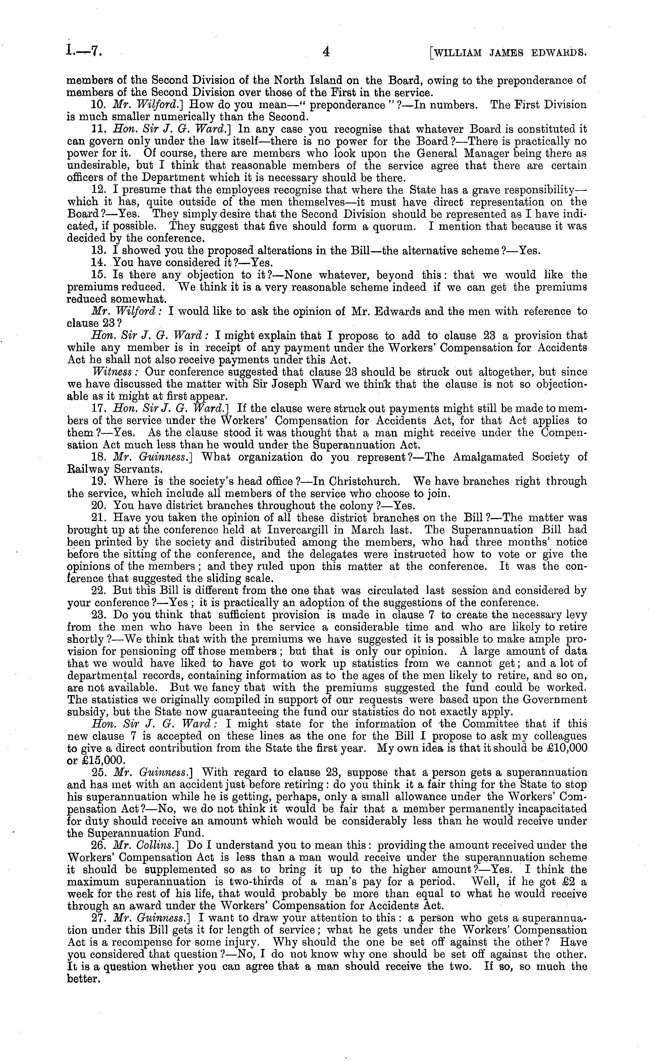 members of the Second Division of the North Island on the Board, owing to the preponderance of members of the Second Division over those of the First in the service. 10. Mr. Wilford.] How do you mean—" preponderance " ?—ln numbers. The First Division is much smaller numerically than the Second. 11. Hon. Sir J. G. Ward.] In any case you recognise that whatever Board is constituted it can govern only under the law itself—there is no power for the Board ?—There is practically no power for it. Of course, there are members who look upon the General Manager being there as undesirable, but I think that reasonable members of the service agree that there are certain officers of the Department which it is necessary should be there. 12. I presume that the employees recognise that where the State has a grave responsibility— which it has, quite outside of the men themselves—it must have direct representation on the Board? —Yes. They simply desire that the Second Division should be represented as I have indicated, if possible. They suggest that five should form a quorum. I mention that because it was decided by the conference. 13. I showed you the proposed alterations in the Bill—the alternative scheme?— Yes. 14. You have considered it ?—Yes. 15. Is there any objection to it?— None whatever, beyond this: that we would like the premiums reduced. We think it is a very reasonable scheme indeed if we can get the premiums reduced somewhat. Mr. Wilford: I would like to ask the opinion of Mr. Edwards and the men with reference to clause 23 ? Hon. Sir J. G. Ward: I might explain that I propose to add to clause 23 a provision that while any member is in receipt of any payment under the Workers' Compensation for Accidents Act he shall not also receive payments under this Act. Witness : Our conference suggested that clause 23 should be struck out altogether, but since we have discussed the matter with Sir Joseph Ward we think that the clause is not so objectionable as it might at first appear. 17. Hon. Sir J. G. Ward.] If the clause were struck out payments might still be made to members of the service under the Workers' Compensation for Accidents Act, for that Act applies to them ?—Yes. As the clause stood it was thought that a man might receive under the Compensation Act much less than he would under the Superannuation Act. 18. Mr. Guinness.] What organization do you represent?— The Amalgamated Society of Bailway Servants. 19. Where is the society's head office ? —ln Christchurch. We have branches right through the service, which include all members of the service who choose to join. 20. You have district branches throughout the colony ?—Yes. 21. Have you taken the opinion of all these district branches on the Bill?— The matter was brought up at the conference held at Invercargill in March last. The Superannuation Bill had been printed by the society and distributed among the members, who had three months' notice before the sitting of the conference, and the delegates were instructed how to vote or give the opinions of the members; and they ruled upon this matter at the conference. It was the conference that suggested the sliding scale. 22. But this Bill is different from the one that was circulated last session and considered by your conference ?—Yes ; it is practically an adoption of the suggestions of the conference. 23. Do you think that sufficient provision is made in clause 7 to create the necessary levy from the men who have been in the service a considerable time and who are likely to retire shortly ?—We think that with the premiums we have suggested it is possible to make ample provision for pensioning off those members; but that is only our opinion. A large amount of data that we would have liked to have got to work up statistics from we cannot get; and a lot of departmental records, containing information as to the ages of the men likely to retire, and so on, are not available. But we fancy that with the premiums suggested the fund could be worked. The statistics we originally compiled in support of our requests were based upon the Government subsidy, but the State now guaranteeing the fund our statistics do not exactly apply. Hon. Sir J. G. Ward: I might state for the information of the Committee that if this new clause 7 is accepted on these lines as the one for the Bill I propose to ask my colleagues to give a direct contribution from the State the first year. My own idea is that it should be £10,000 or £15,000. 25. Mr. Guinness.] With regard to clause 23, suppose that a person gets a superannuation and has met with an accident just before retiring : do you think it a fair thing for the State to stop his superannuation while he is getting, perhaps, only a small allowance under the Workers' Compensation Act ?—No, we do not think it would be fair that a member permanently incapacitated for duty should receive an amount which would be considerably less than he would receive under the Superannuation Fund. 26. Mr. Collins.] Do I understand you to mean this : providing the amount received under the Workers' Compensation Act is less than a man would receive under the superannuation scheme it should be supplemented so as to bring it up to the higher amount ?—Yes. I think the maximum superannuation is two-thirds of a man's pay for a period. Well, if he got £2 a week for the rest of his life, that would probably be more than equal to what he would receive through an award under the Workers' Compensation for Accidents Act. 27. Mr. Guinness.] I want to draw your attention to this : a person who gets a superannuation under this Bill gets it for length of service; what he gets under the Workers' Compensation Act is a recompense for some injury. Why should the one be set off against the other? Have you considered that question ?—No, I do not know why one should be set off against the other. It is a question whether you can agree that a man should receive the two. If 