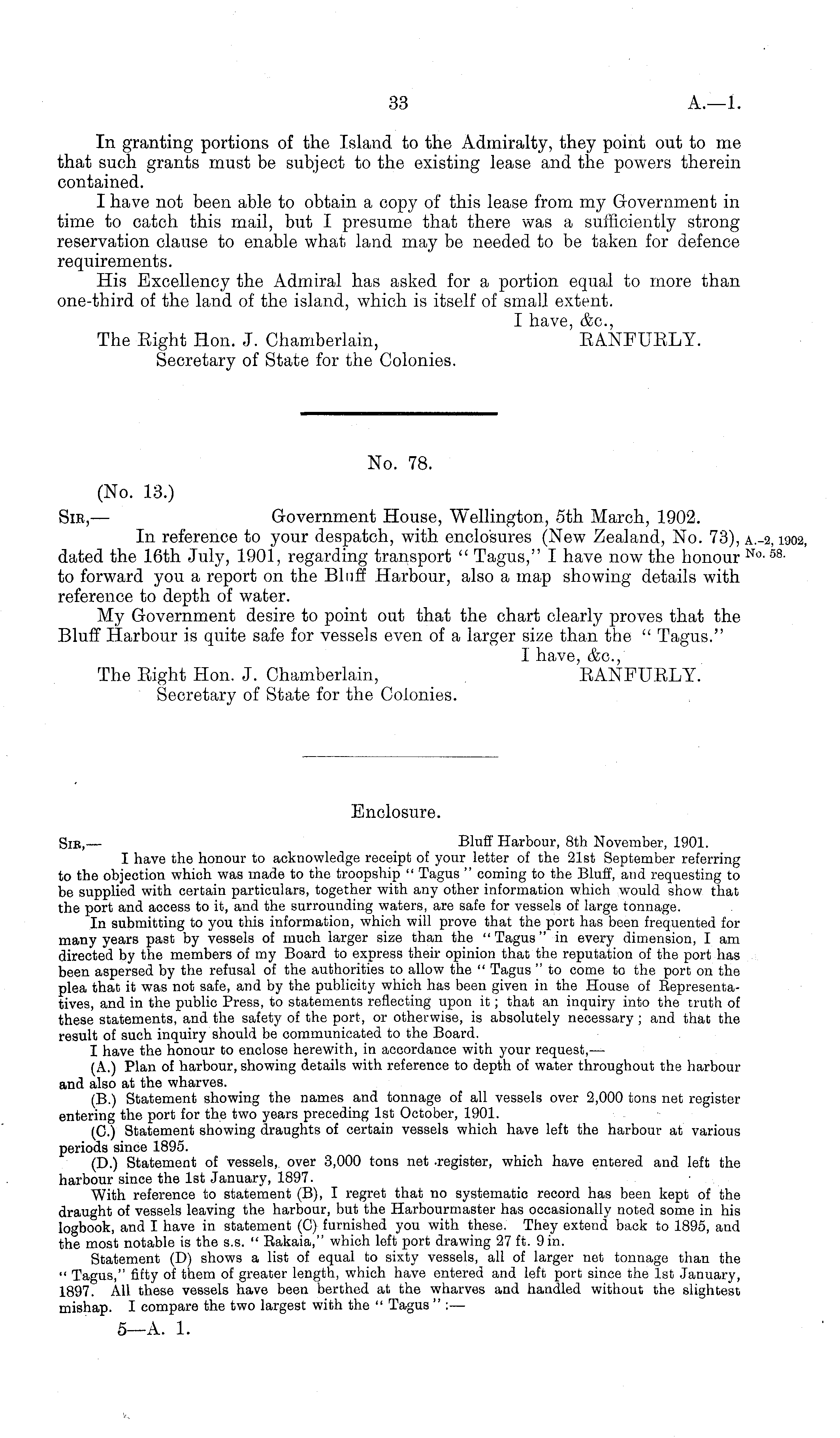 Enclosure. Sir,— Bluff Harbour, Bth November, 1901. I have the honour to acknowledge receipt of your letter of the 21st September referring to the objection which was made to the troopship " Tagus " coming to the Bluff, and requesting to be supplied with certain particulars, together with any other information which would show that the port and access to it, and the surrounding waters, are safe for vessels of large tonnage. In submitting to you this information, which will prove that the port has been frequented for many years past by vessels of much larger size than the " Tagus " in every dimension, I am directed by the members of my Board to express their opinion that the reputation of the port has been aspersed by the refusal of the authorities to allow the " Tagus " to come to the port on the plea that it was not safe, and by the publicity which has been given in the House of Representatives, and in the public Press, to statements reflecting upon it; that an inquiry into the truth of these statements, and the safety of the port, or otherwise, is absolutely necessary ; and that the result of such inquiry should be communicated to the Board. I have the honour to enclose herewith, in accordance with your request,— (A.) Plan of harbour, showing details with reference to depth of water throughout the harbour and also at the wharves. (B.) Statement showing the names and tonnage of all vessels over 2,000 tons net register entering the port for the two years preceding Ist October, 1901. (C.) Statement showing draughts of certain vessels which have left the harbour at various periods since 1895. (D.) Statement of vessels, over 3,000 tons net -register, which have entered and left the harbour since the Ist January, 1897. With reference to statement (B), I regret that no systematic record has been kept of the draught of vessels leaving the harbour, but the Harbourmaster has occasionally noted some in his logbook, and I have in statement (C) furnished you with these. They extend back to 1895, and the most notable is the s.s. " Rakaia," which left port drawing 27 ft. 9 in. Statement (D) shows a list of equal to sixty vessels, all of larger net tonnage than the " Tagus," fifty of them of greater length, which have entered and left port since the Ist January, 1897. All these vessels have been berthed at the wharves and handled without the slightest mishap. I compare the two largest with the " Tagus ":—