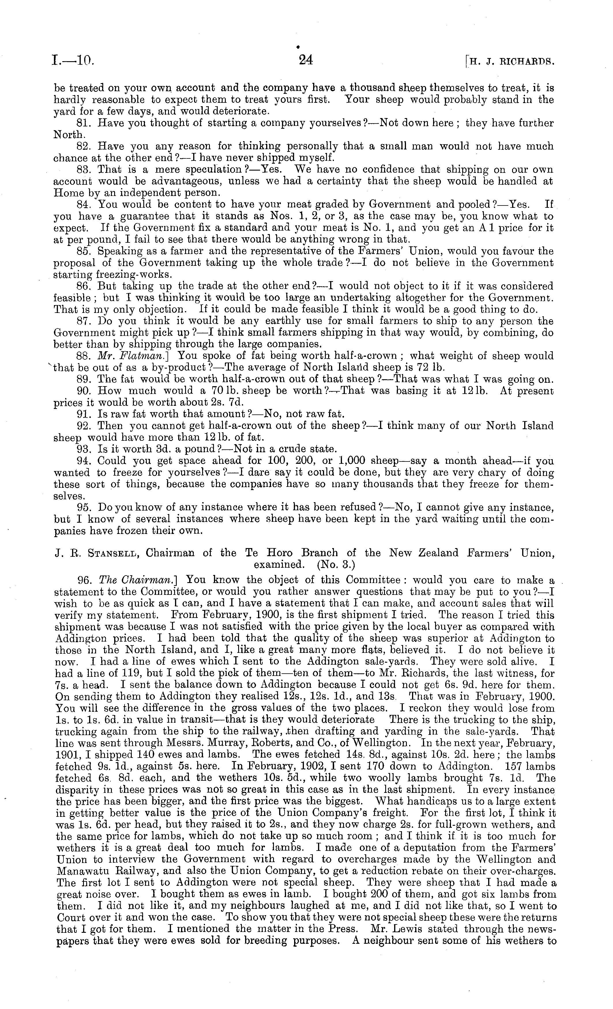 be treated on your own account and the company have a thousand sheep themselves to treat, it is hardly reasonable to expect them to treat yours first. Your sheep would probably stand in the yard for a few days, and would deteriorate. 81. Have you thought of starting a company yourselves?— Not down here ; they have further North. 82. Have you any reason for thinking personally that a small man would not have much chance at the other end ?—I have never shipped myself. 83. That is a mere speculation ?—Yes. We have no confidence that shipping on our own account would be advantageous, unless we had a certainty that the sheep would be handled at Home by an independent person. 84. You would be content to have your meat graded by Government and pooled?— Yes. If you have a guarantee that it stands as Nos. 1, 2, or 3, as the case may be, you know what to expect. If the Government fix a standard and your meat is No. 1, and you get an A 1 price for it at per pound, I fail to see that there would be anything wrong in that. 85. Speaking as a farmer and the representative of the Farmers' Union, would you favour the proposal of the Government taking up the whole trade ? —I do not believe in the Government starting freezing-works. 86. But taking up the trade at the other end?—l would not object to it if it was considered feasible ; but I was thinking it would be too large an undertaking altogether for the Government. That is my only objection. If it could be made feasible I think it would be a good thing to do. 87. Do you think it would be any earthly use for small farmers to ship to any person the Government might pick up ?—I think small farmers shipping in that way would, by combining, do better than by shipping through the large companies. 88. Mr. Flatman.] You spoke of fat being worth half-a-crown ; what weight of sheep would that be out of as a by-product ?—The average of North Island sheep is 72 lb. 89. The fat would be worth half-a-crown out of that sheep ?—That was what I was going on. 90. How much would a7O lb. sheep be worth ?—That was basing it at 121b. At present prices it would be worth about 2s. 7d. 91. Is raw fat worth that amount ? —No, not raw fat. 92. Then you cannot get half-a-crown out of the sheep?—l think many of our North Island sheep would have more than 12 lb. of fat. 93. Is it worth 3d. a pound? —Not in a crude state. 94. Could you get space ahead for 100, 200, or 1,000 sheep—say a month ahead—if you wanted to freeze for yourselves ? —I dare say it could be done, but they are very chary of doing these sort of things, because the companies have so many thousands that they freeze for themselves. 95. Do you know of any instance where it has been refused ?—No, I cannot give any instance, but I know of several instances where sheep have been kept in the yard waiting until the companies have frozen their own. J. E. Stansell, Chairman of the Te Horo Branch of the New Zealand Farmers' Union, examined. (No. 3.) 96. The Chairman.] You know the object of this Committee : would you care to make a statement to the Committee, or would you rather answer questions that may be put to you ?—I wish to be as quick as I can, and I have a statement that I can make, and account sales that will verify my statement. From February, 1900, is the first shipment I tried. The reason I tried this shipment was because I was not satisfied with the price given by the local buyer as compared with Addington prices. I had been told that the quality of the sheep was superior at Addington to those in the North Island, and I, like a great many more flats, believed it. I do not believe it now. I had a line of ewes which I sent to the Addington sale-yards. They were sold alive. I had a line of 119, but I sold the pick of them —ten of them —to Mr. Eichards, the last witness, for 7s. a head. I sent the balance down to Addington because I could not get 6s. 9d. here for them. On sending them to Addington they realised 125., 12s. Id., and 13s. That was in February, 1900. You will see the difference in the gross values of the two places. I reckon they would lose from Is. to Is. 6d. in value in transit—that is they would deteriorate There is the trucking to the ship, trucking again from the ship to the railway, .then drafting and yarding in the sale-yards. That line was sent through Messrs. Murray, Eoberts, and Co., of Wellington. In the next year, February, 1901, I shipped 140 ewes and lambs. The ewes fetched 14s. Bd., against 10s. 2d. here; the lambs fetched 9s. Id., against ss. here. In February, 1902, I sent 170 down to Addington. 157 lambs fetched 6s. Bd. each, and the wethers 10s. 5d., while two woolly lambs brought 7s. Id. The disparity in these prices was not so great in this case as in the last shipment. In every instance the price has been bigger, and the first price was the biggest. What handicaps us to a large extent in getting better value is the price of the Union Company's freight. For the first lot, I think it was Is. 6d. per head, but they raised it to 25., and they now charge 2s. for full-grown wethers, and the same price for lambs, which do not take up so much room ; and I think if it is too much for wethers it is a great deal too much for lambs. I made one of a deputation from the Farmers' Union to interview the Government with regard to overcharges made by the Wellington and Manawatu Eailway, and also the Union Company, to get a reduction rebate on their over-charges. The first lot I sent to Addington were not special sheep. They were sheep that I had made a great noise over. I bought them as ewes in lamb. I bought 200 of them, and got six lambs from them. I did not like it, and my neighbours laughed at me, and I did not like that, so I went to Court over it and won the case. To show you that they were not special sheep these were the returns that I got for them. I mentioned the matter in the Press. Mr. Lewis stated through the newspapers that they were ewes sold f
