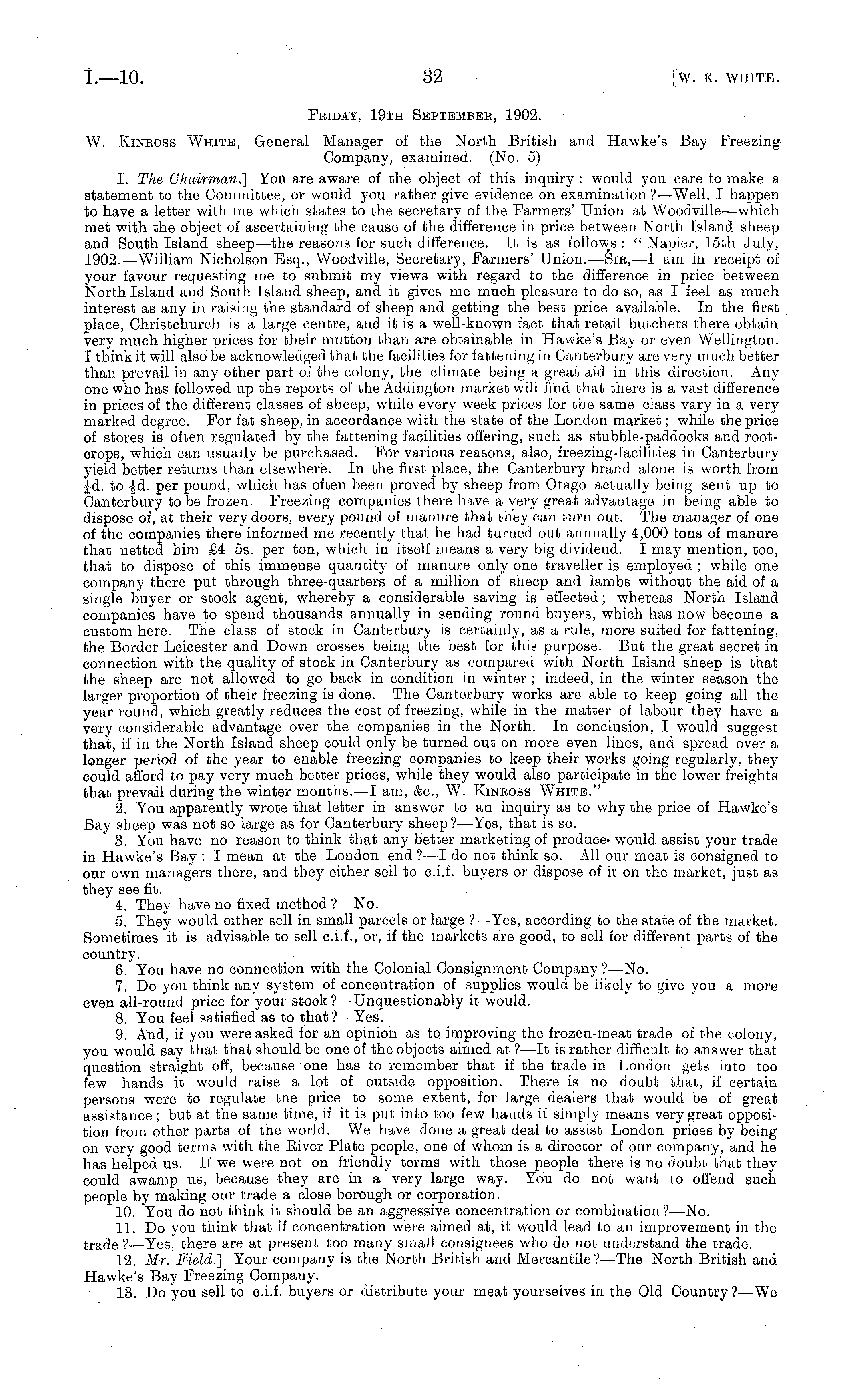 W. Kinross White, General Manager of the North British and Hawke's Bay Freezing Company, examined. (No. 5) 1. The Chairman.] You are aware of the object of this inquiry : would you care to make a statement to the Committee, or would you rather give evidence on examination ? —Well, I happen to have a letter with me which states to the secretary of the Farmers' Union at Woodville—which met with the object of ascertaining the cause of the difference in price between North Island sheep and South Island sheep —the reasons for such difference. It is as follows : " Napier, 15th July, 1902. —William Nicholson Esq., Woodville, Secretary, Farmers' Union.—Sir, —l am in receipt of your favour requesting me to submit my views with regard to the difference in price between North Island and South Island sheep, and it gives me much pleasure to do so, as I feel as much interest as any in raising the standard of sheep and getting the best price available. In the first place, Christchurch is a large centre, and it is a well-known fact that retail butchers there obtain very much higher prices for their mutton than are obtainable in Hawke's Bay or even Wellington. I think it will also be acknowledged that the facilities for fattening in Canterbury are very much better than prevail in any other part of the colony, the climate being a great aid in this direction. Any one who has followed up the reports of the Addington market will find that there is a vast difference in prices of the different classes of sheep, while every week prices for the same class vary in a very marked degree. For fat sheep, in accordance with the state of the London market; while the price of stores is often regulated by the fattening facilities offering, such as stubble-paddocks and rootcrops, which can usually be purchased. For various reasons, also, freezing-facilities in Canterbury yield better returns than elsewhere. In the first place, the Canterbury brand alone is worth from Jd. to Jd. per pound, which has often been proved by sheep from Otago actually being sent up to Canterbury to be frozen. Freezing companies there have a very great advantage in being able to dispose of, at their very doors, every pound of manure that they can turn out. The manager of one of the companies there informed me recently that he had turned out annually 4,000 tons of manure that netted him £4 ss. per ton, which in itself means a very big dividend. I may mention, too, that to dispose of this immense quantity of manure only one traveller is employed ; while one company there put through three-quarters of a million of sheep and lambs without the aid of a single buyer or stock agent, whereby a considerable saving is effected; whereas North Island companies have to spend thousands annually in sending round buyers, which has now become a custom here. The class of stock in Canterbury is certainly, as a rule, more suited for fattening, the Border Leicester and Down crosses being the best for this purpose. But the great secret in connection with the quality of stock in Canterbury as compared with North Island sheep is that the sheep are not allowed to go back in condition in winter ; indeed, in the winter season the larger proportion of their freezing is done. The Canterbury works are able to keep going all the year round, which greatly reduces the cost of freezing, while in the matter of labour they have a very considerable advantage over the companies in the North. In conclusion, I would suggest that, if in the North Island sheep could only be turned out on more even lines, and spread over a longer period of the year to enable freezing companies to keep their works going regularly, they could afford to pay very much better prices, while they would also participate in the lower freights that prevail during the winter months. —I am, &c, W. Kinross White." 2. You apparently wrote that letter in answer to an inquiry as to why the price of Hawke's Bay sheep was not so large as for Canterbury sheep ? —Yes, that is so. 3. You have no reason to think that any better marketing of produce- would assist your trade in Hawke's Bay : I mean at the London end ?—I do not think so. All our meat is consigned to our own managers there, and they either sell to c.i.f. buyers or dispose of it on the market, just as they see fit. 4. They have no fixed method ?—No. 5. They would either sell in small parcels or large ? —Yes, according to the state of the market. Sometimes it is advisable to sell c.i.f., or, if the markets are good, to sell for different parts of the country. 6. You have no connection with the Colonial Consignment Company ?—No. 7. Do you think any system of concentration of supplies would be likely to give you a more even all-round price for your stock? —Unquestionably it would. 8. You feel satisfied as to that? —Yes. 9. And, if you were asked for an opinion as to improving the frozen-meat trade of the colony, you would say that that should be one of the objects aimed at ?—lt is rather difficult to answer that question straight off, because one has to remember that if the trade in London gets into too few hands it would raise a lot of outside opposition. There is no doubt that, if certain persons were to regulate the price to some extent, for large dealers that would be of great assistance; but at the same time, if it is put into too few hands it simply means very great opposition from other parts of the world. We have done a great deal to assist London prices by being on very good terms with the Eiver Plate people, one of whom is a director of our company, and he has helped us. If we were not on friendly terms with those people there is no doubt that they could swamp us, because they are in a very large way. You do not want to offend such people by making our trade a close borough or corporation. 10. You do not think it should be an aggressive concentration or combination ?—No. 11. Do you think that if concentration were aimed at, i
