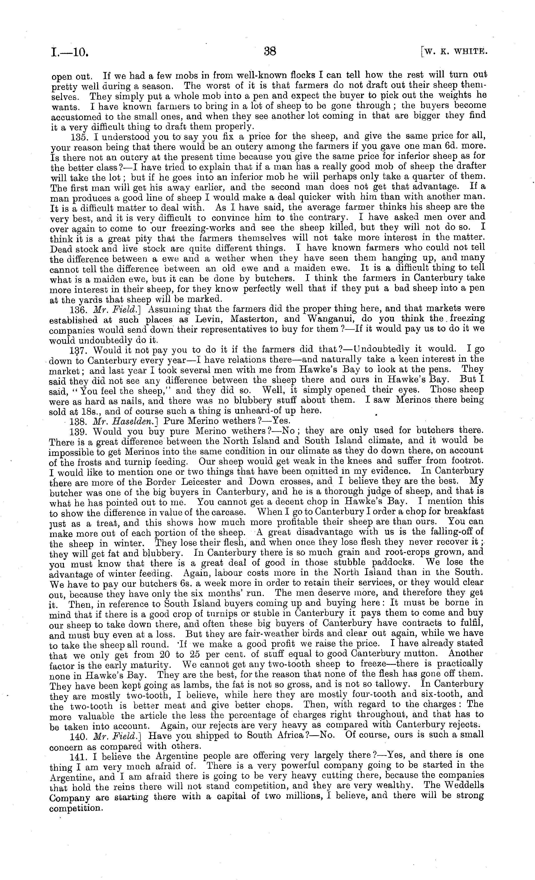 open out. If we had a few mobs in from well-known flocks I can tell how the rest will turn out pretty well during a season. The worst of it is that farmers do not draft out their sheep themselves. They simply put a whole mob into a pen and expect the buyer to pick out the weights he wants. I have known farmers to bring in a lot of sheep to be gone through ; the buyers become accustomed to the small ones, and when they see another lot coming in that are bigger they find it a very difficult thing to draft them properly. 135. I understood you to say you fix a price for the sheep, and give the same price for all, your reason being that there would be an outcry among the farmers if you gave one man 6d. more. Is there not an outcry at the present time because you give the same price for inferior sheep as for the better class ? —I have tried to explain that if a man has a really good mob of sheep the drafter will take the lot; but if he goes into an inferior mob he will perhaps only take a quarter of them. The first man will get his away earlier, and the second man does not get that advantage. If a man produces a good line of sheep I would make a deal quicker with him than with another man. It is a difficult matter to deal with. As I have said, the average farmer thinks his sheep are the very best, and it is very difficult to convince him to the contrary. I have asked men over and over again to come to our freezing-works and see the sheep killed, but they will not do so. I think it is a great pity that the farmers themselves will not take more interest in the matter. Dead stock and live stock are quite different things. I have known farmers who could not tell the difference between a ewe and a wether when they have seen them hanging up, and many cannot tell the difference between an old ewe and a maiden ewe. It is a difficult thing to tell what is a maiden ewe, but it can be done by butchers. I think the farmers in Canterbury take more interest in their sheep, for they know perfectly well that if they put a bad sheep into a pen at the yards that sheep will be marked. 136. Mr. Field.] Assuming that the farmers did the proper thing here, and that markets were established at such places as Levin, Masterton, and Wanganui, do you think the. freezing companies would send down their representatives to buy for them ? —lf it would pay us to do it we would undoubtedly do it. 137. Would it not pay you to do it if the farmers did that?— Undoubtedly it would. Igo down to Canterbury every year—l have relations there—and naturally take a keen interest in the market; and last year I took several men with me from Hawke's Bay to look at the pens. They said they did not see any difference between the sheep there and ours in Hawke's Bay. But I said, " You feel the sheep," and they did so. Well, it simply opened their eyes. Those sheep were as hard as nails, and there was no blubbery stuff about them. I saw Mlerinos there being sold at 18s., and of course such a thing is unheard-of up here. 138. Mr. Haselden.} Pure Merino wethers? —Yes. 139. Would you buy pure Merino wethers ?—No ; they are only used for butchers there. There is a great difference between the North Island and South Island climate, and it would be impossible to get Merinos into the same condition in our climate as they do down there, on account of the frosts and turnip feeding. Our sheep would get weak in the knees and suffer from footrot. I would like to mention one or two things that have been omitted in my evidence. In Canterbury there are more of the Border Leicester and Down crosses, and I believe they are the best. My butcher was one of the big buyers in Canterbury, and he is a thorough judge of sheep, and that is what he has pointed out to me. You cannot get a decent chop in Hawke's Bay. I mention this to show the difference in value of the carcase. When Igo to Canterbury I order a chop for breakfast just as a treat, and this shows how much more profitable their sheep are than ours. You can make more out of each portion of the sheep. A great disadvantage with us is the falling-off of the sheep in winter. They lose their flesh, and when once they lose flesh they never recover it; they will get fat and blubbery. In Canterbury there is so much grain and root-crops grown, and you must know that there is a great deal of good in those stubble paddocks. We lose the advantage of winter feeding. Again, labour costs more in the North Island than in the South. We have to pay our butchers 6s. a week more in order to retain their services, or they would clear out, because they have only the six months' run. The men deserve more, and therefore they get it. ' Then, in reference to South Island buyers coming up and buying here : It must be borne in mind that if there is a good crop of turnips or stuble in Canterbury it pays them to come and buy our sheep to take down there, and often these big buyers of Canterbury have contracts to fulfil, and must buy even at a loss. But they are fair-weather birds and clear out again, while we have to take the sheep all round. 'If we make a good profit we raise the price. I have already stated that we only get from 20 to 25 per cent, of stuff equal to good Canterbury mutton. Another factor is the early maturity. We cannot get any two-tooth sheep to freeze—there is practically none in Hawke's Bay. They are the best, for the reason that none of the flesh has gone off them. They have been kept going as lambs, the fat is not so gross, and is not so tallowy. In Canterbury they are mostly two-tooth, I believe, while here they are mostly four-tooth and six-tooth, and the two-tooth is better meat and give better chops. Then, with regard to the charges : The more valuable the article the less the percentage of charges right throughout, and that has to be taken into account. Again, our rejects are very heavy as compared with Canterbury rejects. 140. Mr. Field.] Have you shipped to South Africa? —No. Of course, ours