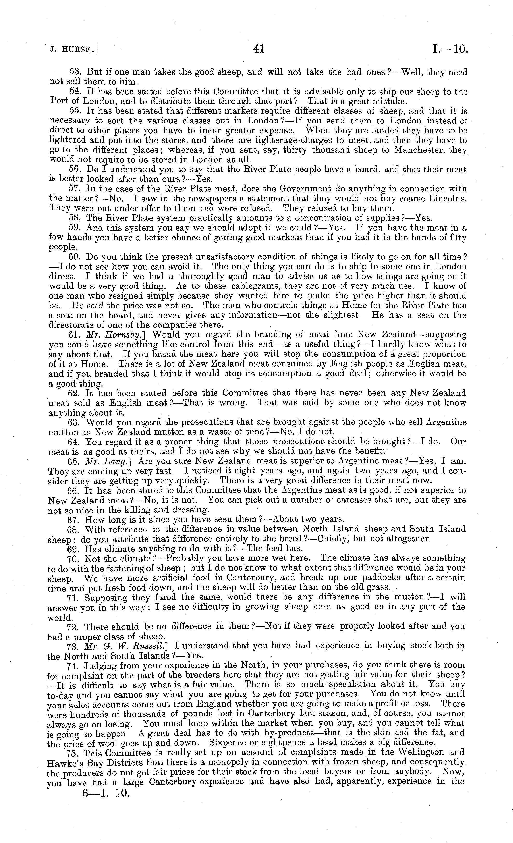 53. But if one man takes the good sheep, and will not take the bad ones ?—Well, they need not sell them to him. 54. It has been stated before this Committee that it is advisable only to ship our sheep to the Port of London, and to distribute them through that port?— That is a great mistake. 55. It has been stated that different markets require different classes of sheep, and that it is necessary to sort the various classes out in London ?—lf you send them to London instead of direct to other places you have to incur greater expense. When they are landed they have to be lightered and put into the stores, and there are lighterage-charges to meet, and then they have to go to the different places; whereas, if you sent, say, thirty thousand sheep to Manchester, they would not require to be stored in London at all. 56. Do I understand you to say that the Biver Plate people have a board, and that their meat is better looked after than ours?— Yes. 57. In the case of the Biver Plate meat, does the Government do anything in connection with the matter?— No. I saw in the newspapers a statement that they would not buy coarse Lincolns. They were put under offer to them and were refused. They refused to buy them. 58. The Eiver Plate system practically amounts to a concentration of supplies ? —Yes. 59. And this system you say we should adopt if we could?— Yes. If you have the meat in a few hands you have a better chance of getting good markets than if you had it in the hands of fifty people. 60. Do you think the present unsatisfactory condition of things is likely to go on for all time ? —I do not see how you can avoid it. The only thing you can do is to ship to some one in London direct. I think if we had a thoroughly good man to advise us as to how things are going on it would be a very good thing. As to these cablegrams, they are not of very much use. I know of one man who resigned simply because they wanted him to make the price higher than it should be. He said the price was not so. The man who controls things at Home for the Eiver Plate has a seat on the board, and never gives any information —not the slightest. He has a seat on the directorate of one of the companies there. 61. Mr. Hornsby.] Would you regard the branding of meat from New Zealand —supposing you could have something like control from this end—as a useful thing?—l hardly know what to say about that. If you brand the meat here you will stop the consumption of a great proportion of it at Home. There is a lot of New Zealand meat consumed by English people as English meat, and if you branded that I think it would stop its consumption a good deal; otherwise it would be a good thing. 62. It has been stated before this Committee that there has never been any New Zealand meat sold as English meat ?—That is wrong. That was said by some one who does not know anything about it. 63. Would you regard the prosecutions that are brought against the people who sell Argentine mutton as New Zealand mutton as a waste of time ?—No, I do not. 64. You regard it as a proper thing that those prosecutions should be brought ?—I do. Our meat is as good as theirs, and I do not see why we should not have the benefit. 65. Mr. Lang.] Are you sure New Zealand meat is superior to Argentine meat ?—Yes, I am. They are coming up very fast. I noticed it eight years ago, and again two years ago, and I consider they are getting up very quickly. There is a very great difference in their meat now. 66. It has been stated to this Committee that the Argentine meat as is good, if not superior to New Zealand meat ? —No, it is not. You can pick out a number of carcases that are, but they are not so nice in the killing and dressing. 67. How long is it since you have seen them ? —About two years. 68. With reference to the difference in value between North Island sheep and South Island sheep: do you attribute that difference entirely to the breed? —Chiefly, but not altogether. 69. Has climate anything to do with it ? —The feed has. 70. Not the climate ? —Probably you have more wet here. The climate has always something to do with the fattening of sheep ; but I do not know to what extent that difference would be in your sheep. We have more artificial food in Canterbury, and break up our paddocks after a certain time and put fresh food down, and the sheep will do better than on the old grass. 71. Supposing they fared the same, would there be any difference in the mutton? —I will answer you in this way : I see no difficulty in growing sheep here as good as in any part of the world. 72. There should be no difference in them ? —Not if they were properly looked after and you had a proper class of sheep. 73. Mr. G. W. Russell.] I understand that you have had experience in buying stock both in the North and South Islands ?—Yes. 74. Judging from your experience in the North, in your purchases, do you think there is room for complaint on the part of the breeders here that they are not getting fair value for their sheep ? It i s difficult to say what is a fair value. There is so much speculation about it. You buy to-day and you cannot say what you are going to get for your purchases. You do not know until your sales accounts come out from England whether you are going to make a profit or loss. There were hundreds of thousands of pounds lost in Canterbury last season, and, of course, you cannot always go on losing. You must keep within the market when you buy, and you cannot tell what is going to happen. A great deal has to do with by-products —that is the skin and the fat, and the price of wool goes up and down. Sixpence or eightpence a head makes a big difference. 75. This Committee is really set up on account of complaints made in the Wellington and Hawke's Bay Districts that there is a monopoly in connection with frozen sheep, and consequently the producers do not get fair prices for their stock from the local buyers or from anybody. Now, yo