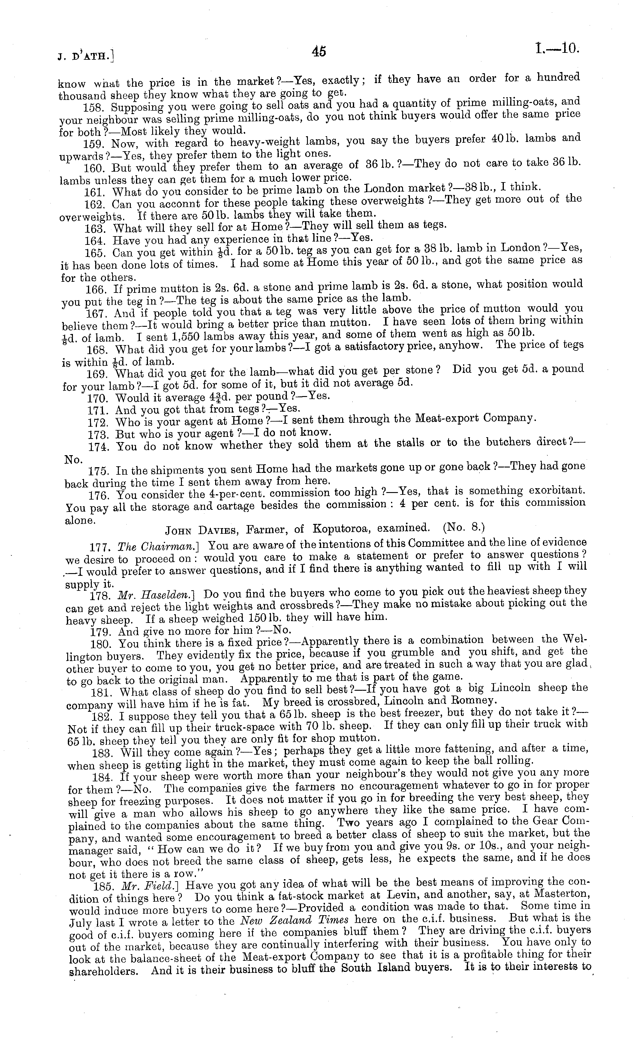 know what the price is in the market?— Yes, exactly; if they have an order for a hundred thousand sheep they know what they are going to get. _ 158 Supposing you were going to sell oats and you had a quantity of prime milling-oats, and your neighbour was selling prime milling-oats, do you not think buyers would offer the same price for both ?—Most likely they would. ■ , 159. Now, with regard to heavy-weight lambs, you say the buyers prefer 401b. lambs ana upwards ?—Yes, they prefer them to the light ones. ,„„-_,. , , , , or ik 160. But would they prefer them to an average of 36 lb. ?—They do not care to take 36 lb. lambs unless they can get them for a much lower price. 161 What do you consider to be prime lamb on the London market lb., 1 tmnk. 162. Can you acconnt for these people taking these overweights I— They get more out of the overweights. If there are 501b. lambs they will take them. 163. What will they sell for at Home ?—They will sell them as tegs. 164. Have you had any experience in that line ?—Yes. _ 165 Can you get within Jd. for a 501b. teg as you can get for a3B lb. lamb in London ?—Yes, it has been done lots of times. I had some at Home this year of 50 lb., and got the same price as for the others. ~„„-, , , v 166. If prime mutton is 2s. 6d. a stone and prime lamb is 2s. 6d. a stone, what position would you put the teg in ?—The teg is about the same price as the lamb. 167 And if people told you that a teg was very little above the price of mutton would you believe them?—lt would bring a better price than mutton. I have seen lots of them bring within J-d of lamb. I sent 1,550 lambs away this year, and some of them went as high as 501b. 8 ' 168. What did you get for your lambs ?—I got a satisfactory price, anyhow. The price ot tegs is within Jd. of lamb. c , , 169. What did you get for the lamb—what did you get per stone ? Did you get sd. a pound for your lamb?—l got sd. for some of it, but it did not average sd. 170. Would it average 4Jd. per pound ?—Yes. 171. And you got that from tegs?— Yes. 172. Who is your agent at Home ?—I sent them through the Meat-export Company. 173. But who is your agent ?—I do not know. 174. You do not know whether they sold them at the stalls or to the butchers direct I— ' 175. In the shipments you sent Home had the markets gone up or gone back ?—They had gone back during the time I sent them away from here. 176 You consider the 4-per-cent. commission too high ?—Yes, that is something exorbitant. You pay all the storage and cartage besides the commission : 4 per cent, is for this commission John Davies, Farmer, of Koputoroa, examined. (No. 8.) 177 The Chairman.] You are aware of the intentions of this Committee and the line of evidence we desire to proceed on : would you care to make a statement or prefer to answer questions ? .—I would prefer to answer questions, and if 1 find there is anything wanted to fill up with I will SUPP I7B 'Mr Haselden.] Do you find the buyers who come to you pick out the heaviest sheep they can get and reject the light weights and crossbreds ?—They make no mistake about picking out the heavy sheep. If a sheep weighed 1501b. they will have him. 179. And give no more for him ?—No. 180 You think there is a fixed price ?—Apparently there is a combination between the Wellington buyers. They evidently fix the price, because if you grumble and you shift, and get the other buyer to come to you, you get no better price, and are treated m such a way that you are glad to go back to the original man. Apparently to me that is part of the game. 181 What class of sheep do you find to sell best ?—lf you have got a big Lincoln sheep the company will have him if he is fat. My breed is crossbred, Lincoln and Eomney. 182 I suppose they tell you that a 65 lb. sheep is the best freezer, but they do not take it ?— Not if they can fill up their truck-space with 70 lb. sheep. If they can only fill up their truck with 65 lb. sheep they tell you they are only fit for shop mutton. 183 Will they come again ?—Yes ; perhaps they get a little more fattening, and alter a time, when sheep is getting light in the market, they must'come again to keep the ball rolling. 184 If your sheep were worth more than your neighbour's they would not give you any more for them '—-No The companies give the farmers no encouragement whatever to go in for proper sheep for freezing purposes. It does not matter if you go in for breeding the very best sheep, they will give a man who allows his sheep to go anywhere they like the same price. I have complained to the companies about the same thing. Two years ago I complained to the Gear Company and wanted some encouragement to breed a better class of sheep to suit the market, butthe manager said, " How can we do it ? If we buy from you and give you 9s. or 10s., and your neighbour, who does not breed the same class of sheep, gets less, he expects the same, and it he does not get it there is a row." .„,,,, *• . ~ 185 Mr Field.] Have you got any idea of what will be the best means ot improving the condition of things here ? Do you think a fat-stock market at Levin, and another, say, at Masterton, would induce more buyers to come here ?—Provided a condition was made to that. Some time in July last I wrote a letter to the New Zealand Times here on the c.i.f. business. But what is the good of ci f buyers coming here if the companies bluff them ? They are driving the c.i.f. buyers out of the market, because they are continually interfering with their business. You have only to look at the balance-sheet of the Meat-export Company to see that it is a profitable thing for their shareholders And it is their business to bluff the South Island buyers. It is to their interests to