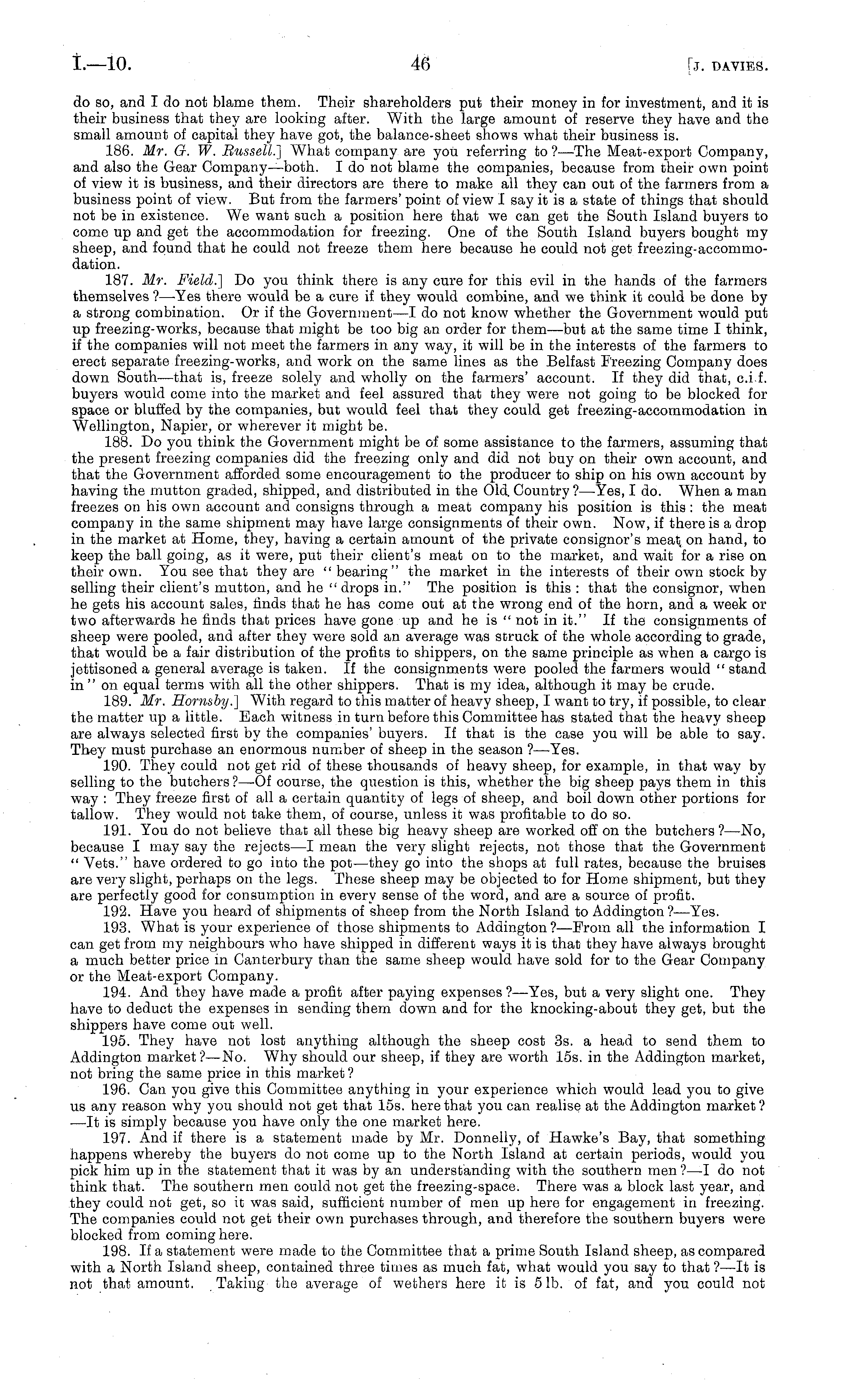 do so, and Ido not blame them. Their shareholders put their money in for investment, and it is their business that they are looking after. With the large amount of reserve they have and the small amount of capital they have got, the balance-sheet shows what their business is. 186. Mr. G. W. Russell.] What company are you referring to ?—The Meat-export Company, and also the Gear Company—both. I do not blame the companies, because from their own point of view it is business, and their directors are there to make all they can out of the farmers from a business point of view. But from the farmers' point of view I say it is a state of things that should not be in existence. We want such a position here that we can get the South Island buyers to come up and get the accommodation for freezing. One of the South Island buyers bought my sheep, and found that he could not freeze them here because he could not get freezing-accommo-dation. 187. Mr. Field.] Do you think there is any cure for this evil in the hands of the farmers themselves ? —Yes there would be a cure if they would combine, and we think it could be done by a strong combination. Or if the Government—l do not know whether the Government would put up freezing-works, because that might be too big an order for them—but at the same time I think, if the companies will not meet the farmers in any way, it will be in the interests of the farmers to erect separate freezing-works, and work on the same lines as the Belfast Freezing Company does down South—that is, freeze solely and wholly on the farmers' account. If they did that, c.i.f. buyers would come into the market and feel assured that they were not going to be blocked for space or bluffed by the companies, but would feel that they could get freezing-accommodation in Wellington, Napier, or wherever it might be. 188. Do you think the Government might be of some assistance to the farmers, assuming that the present freezing companies did the freezing only and did not buy on their own account, and that the Government afforded some encouragement to the producer to ship on his own account by having the mutton graded, shipped, and distributed in the Old. Country ?—Yes, I do. When a man freezes on his own account and consigns through a meat company his position is this : the meat company in the same shipment may have large consignments of their own. Now, if there is a drop in the market at Home, they, having a certain amount of the private consignor's meat on hand, to keep the ball going, as it were, put their client's meat on to the market, and wait for a rise on their own. You see that they are " bearing" the market in the interests of their own stock by selling their client's mutton, and he " drops in." The position is this : that the consignor, when he gets his account sales, finds that he has come out at the wrong end of the horn, and a week or two afterwards he finds that prices have gone up and he is " not in it." If the consignments of sheep were pooled, and after they were sold an average was struck of the whole according to grade, that would be a fair distribution of the profits to shippers, on the same principle as when a cargo is jettisoned a general average is taken. If the consignments were pooled the farmers would " stand in" on equal terms with all the other shippers. That is my idea, although it may be crude. 189. Mr. Hornsby.] With regard to this matter of heavy sheep, I want to try, if possible, to clear the matter up a little. Each witness in turn before this Committee has stated that the heavy sheep are always selected first by the companies' buyers. If that is the case you will be able to say. They must purchase an enormous number of sheep in the season ? —Yes. 190. They could not get rid of these thousands of heavy sheep, for example, in that way by selling to the butchers ?—Of course, the question is this, whether the big sheep pays them in this way : They freeze first of all a certain quantity of legs of sheep, and boil down other portions for tallow. They would not take them, of course, unless it was profitable to do so. 191. You do not believe that all these big heavy sheep are worked off on the butchers ?—No, because I may say the rejects —I mean the very slight rejects, not those that the Government " Vets." have ordered to go into the pot —they go into the shops at full rates, because the bruises are very slight, perhaps on the legs. These sheep may be objected to for Home shipment, but they are perfectly good for consumption in every sense of the word, and are a source of profit. 192. Have you heard of shipments of sheep from the North Island to Addington ?—Yes. 193. What is your experience of those shipments to Addington?—From all the information I can get from my neighbours who have shipped in different ways it is that they have always brought a much better price in Canterbury than the same sheep would have sold for to the Gear Company or the Meat-export Company. 194. And they have made a profit after paying expenses ?—Yes, but a very slight one. They have to deduct the expenses in sending them down and for the knocking-about they get, but the shippers have come out well. 195. They have not lost anything although the sheep cost 3s. a head to send them to Addington market?— No. Why should our sheep, if they are worth 15s. in the Addington market, not bring the same price in this market ? 196. Can you give this Committee anything in your experience which would lead you to give us any reason why you should not get that 15s. here that you can realise at the Addington market ? —It is simply because you have only the one market here. 197. And if there is a statement made by Mr. Donnelly, of Hawke's Bay, that something happens whereby the buyers do not come up to the North Island at certain periods, would you pick him up in the statement that it was by an understanding with the southern men ?—I do not think that. The southern men could n