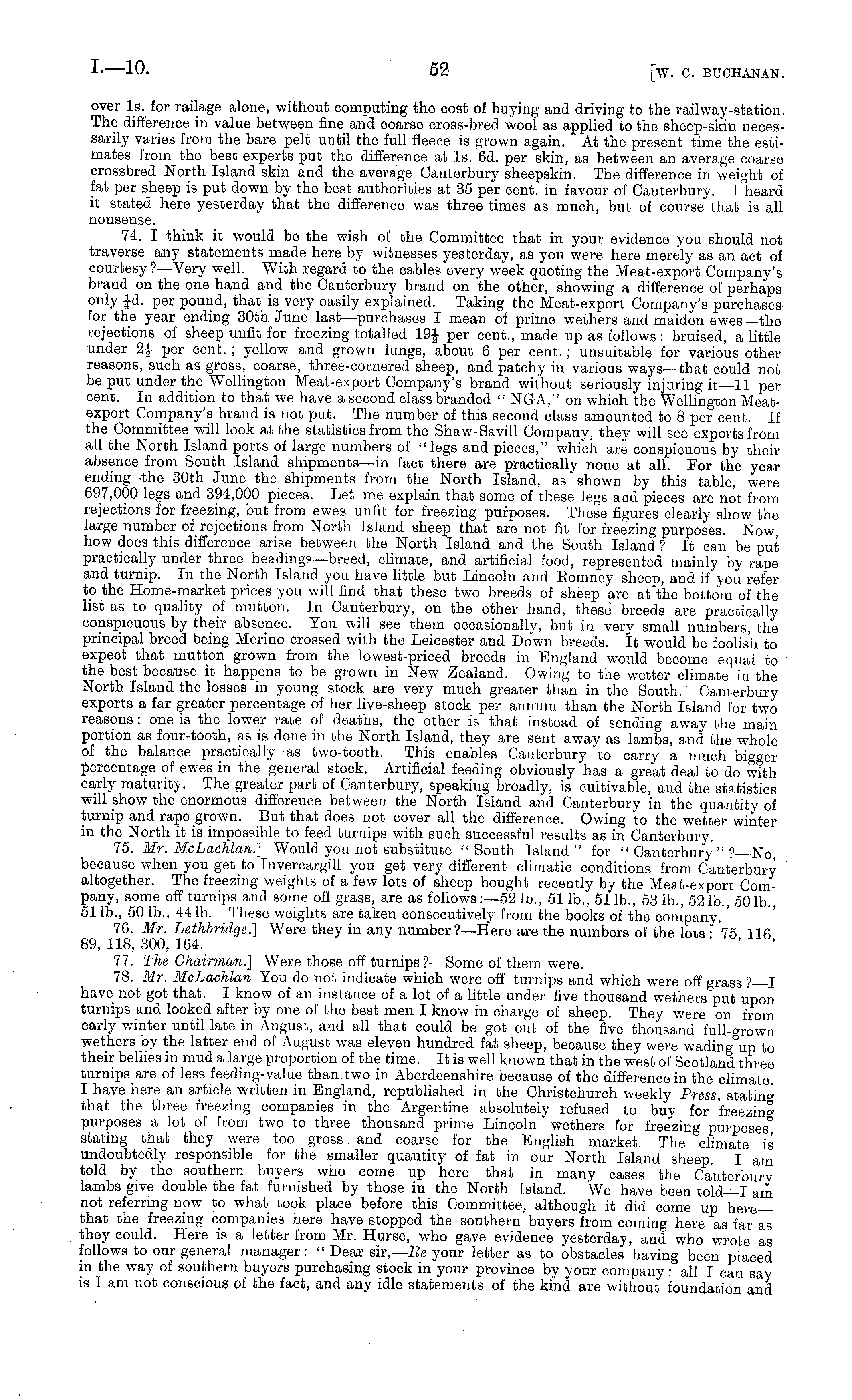 over Is. for railage alone, without computing the cost of buying and driving to the railway-station. The difference in value between fine and coarse cross-bred wool as applied to the sheep-skin necessarily varies from the bare pelt until the full fleece is grown again. At the present time the estimates from the best experts put the difference at Is. 6d. per skin, as between an average coarse crossbred North Island skin and the average Canterbury sheepskin. The difference in weight of fat per sheep is put down by the best authorities at 35 per cent, in favour of Canterbury. I heard it stated here yesterday that the difference was three times as much, but of course that is all nonsense. 74. I think it would be the wish of the Committee that in your evidence you should not traverse any statements made here by witnesses yesterday, as you were here merely as an act of courtesy ?—Very well. With regard to the cables every week quoting the Meat-export Company's brand on the one hand and the Canterbury brand on the other, showing a difference of perhaps only Jd. per pound, that is very easily explained. Taking the Meat-export Company's purchases for the year ending 30th June last—purchases I mean of prime wethers and maiden ewes—the rejections of sheep unfit for freezing totalled 19J per cent., made up as follows: bruised, a little under 2J per cent. ; yellow and grown lungs, about 6 per cent.; unsuitable for various other reasons, such as gross, coarse, three-cornered sheep, and patchy in various ways—that could not be put under the Wellington Meat-export Company's brand without seriously injuring it—ll per cent. In addition to that we have a second class branded " NGA," on which the Wellington Meatexport Company's brand is not put. The number of this second class amounted to 8 per cent. If the Committee will look at the statistics from the Shaw-Savill Company, they will see exports from all the North Island ports of large numbers of " legs and pieces," which are conspicuous by their absence from South Island shipments—in fact there are practically none at all. For the year ending the 30th June the shipments from the North Island, as shown by this table, were 697,000 legs and 394,000 pieces. Let me explain that some of these legs and pieces are not from rejections for freezing, but from ewes unfit for freezing purposes. These figures clearly show the large number of rejections from North Island sheep that are not fit for freezing purposes. Now, how does this difference arise between the North Island and the South Island ? It can be put practically under three headings—breed, climate, and artificial food, represented mainly by rape and turnip. In the North Island you have little but Lincoln and Eomney sheep, and if you refer to the Home-market prices you will find that these two breeds of sheep are at the bottom of the list as to quality of mutton. In Canterbury, on the other hand, these breeds are practically conspicuous by their absence. You will see them occasionally, but in very small numbers, the principal breed being Merino crossed with the Leicester and Down breeds. It would be foolish to expect that mutton grown from the lowest-priced breeds in England would become equal to the best because it happens to be grown in New Zealand. Owing to the wetter climate in the North Island the losses in young stock are very much greater than in the South. Canterbury exports a far greater percentage of her live-sheep stock per annum than the North Island for two reasons : one is the lower rate of deaths, the other is that instead of sending away the main portion as four-tooth, as is done in the North Island, they are sent away as lambs, and the whole of the balance practically as two-tooth. This enables Canterbury to carry a much bigger percentage of ewes in the general stock. Artificial feeding obviously has a great deal to do with early maturity. The greater part of Canterbury, speaking broadly, is cultivable, and the statistics will show the enormous difference between the North Island and Canterbury in the quantity of turnip and rape grown. But that does not cover all the difference. Owing to the wetter winter in the North it is impossible to feed turnips with such successful results as in Canterbury. 75. Mr. McLachlan.] Would you not substitute "South Island" for "Canterbury"? No because when you get to Invercargill you get very different climatic conditions from Canterbury altogether. The freezing weights of a few lots of sheep bought recently by the Meat-export Company, some off turnips and some off grass, are as follows: —s2 lb., 51 lb., 51 lb., 53 lb., 52 lb., 50 lb. 51 lb., 50 lb., 44 lb. These weights are taken consecutively from the books of the company.'' 76. Mr. Lethbridge.] Were they in any number ?—Here are the numbers of the lots ■75 116 89, 118,300, 164. ' ' ' 77. The Chairman.] Were those off turnips?— Some of them were. 78. Mr. McLachlan You do not indicate which were off turnips and which were off grass ? I have not got that. I know of an instance of a lot of a little under five thousand wethers put upon turnips and looked after by one of the best men I know in charge of sheep. They were on from early winter until late in August, and all that could be got out of the five thousand full-grown wethers by the latter end of August was eleven hundred fat sheep, because they were wading up to their bellies in mud a large proportion of the time. It is well known that in the west of Scotland three turnips are of less feeding-value than two in, Aberdeenshire because of the difference in the climate I have here an article written in England, republished in the Christchurch weekly Press, stating that the three freezing companies in the Argentine absolutely refused to buy for freezing purposes a lot of from two to three thousand prime Lincoln wethers for freezing purposes stating that they were too gross and coarse for the English market. The climate is undoubtedly respons