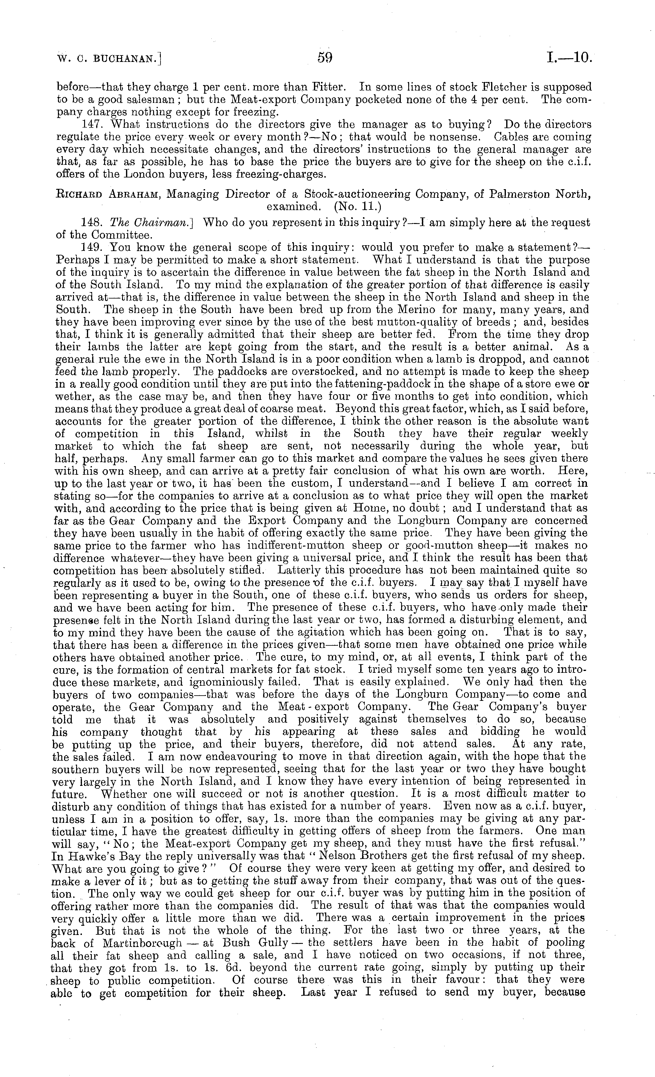 before —that they charge 1 per cent, more than Fitter. In some lines of stock Fletcher is supposed to be a good salesman; but the Meat-export Company pocketed none of the 4 per cent. The company charges nothing except for freezing. 147. What instructions do the directors give the manager as to buying? Do the directors regulate the price every week or every month?—No ; that would be nonsense. Cables are coming every day which necessitate changes, and the directors' instructions to the general manager are that, as far as possible, he has to base the price the buyers are to give for the sheep on the c.i.f. offers of the London buyers, less freezing-charges. Eiohard Abraham, Managing Director of a Stock-auctioneering Company, of Palmerston North, examined. (No. 11.) 148. The Chairman.] Who do you represent in this inquiry ?—I am simply here at the request of the Committee. 149. You know the general scope of this inquiry: would you prefer to make a statement?— Perhaps I may be permitted to make a short statement. What I understand is that the purpose of the inquiry is to ascertain the difference in value between the fat sheep in the North Island and of the South Island. To my mind the explanation of the greater portion of that difference is easily arrived at —that is, the difference in value between the sheep in the North Island and sheep in the South. The sheep in the South have been bred up from the Merino for many, many years, and they have been improving ever since by the use of the best mutton-quality of breeds ; and, besides that, I think it is generally admitted that their sheep are better fed. From the time they drop their lambs the latter are kept going from the start, and the result is a better animal. As a general rule the ewe in the North Island is in a poor condition when a lamb is droppod, and cannot feed the lamb properly. The paddocks are overstocked, and no attempt is made to keep the sheep in a really good condition until they are put into the fattening-paddock in the shape of a store ewe or wether, as the case may be, and then they have four or five months to get into condition, which means that they produce a great deal of coarse meat. Beyond this great factor, which, as I said before, accounts for the greater portion of the difference, I think the other reason is the absolute want of competition in this Island, whilst in the South they have their regular weekly market to which the fat sheep are sent, not necessarily during the whole year, but half, perhaps. Any small farmer can go to this market and compare the values he sees given there with his own sheep, and can arrive at a pretty fair conclusion of what his own are worth. Here, up to the last year or two, it has been the custom, I understand —and I believe I am correct in stating so—for the companies to arrive at a conclusion as to what price they will open the market with, and according to the price that is being given at Home, no doubt ; and I understand that as far as the Gear Company and the Export Company and the Longburn Company are concerned they have been usually in the habit of offering exactly the same price. They have been giving the same price to the farmer who has indifferent-mutton sheep or good-mutton sheep—-it makes no difference whatever —they have been giving a universal price, and I think the result has been that competition has been absolutely stifled. Latterly this procedure has not been maintained quite so regularly as it used to be, owing to the presence -of the c.i.f. buyers. I may say that I myself have been representing a buyer in the South, one of these c.i.f. buyers, who sends us orders for sheep, and we have been acting for him. The presence of these c.i.f. buyers, who have only made their presense felt in the North Island during the last year or two, has formed a disturbing element, and to my mind they have been the cause of the agitation which has been going on. That is to say, that there has been a difference in the prices given—that some men have obtained one price while others have obtained another price. The cure, to my mind, or, at all events, I think part of the cure, is the formation of central markets for fat stock. I tried myself some ten years ago to introduce these markets, and ignominiously failed. That is easily explained. We only had then the buyers of two companies—that was before the days of the Longburn Company—to come and operate, the Gear Company and the Meat - export Company. The Gear Company's buyer told me that it was absolutely and positively against themselves to do so, because his company thought that by his appearing at these sales and bidding he would be putting up the price, and their buyers, therefore, did not attend sales. At any rate, the sales failed. lam now endeavouring to move in that direction again, with the hope that the southern buyers will be now represented, seeing that for the last year or two they have bought very largely in the North Island, and I know they have every intention of being represented in future. Whether one will succeed or not is another question. It is a most difficult matter to disturb any condition of things that has existed for a number of years. Even now as a c.i.f. buyer, unless I am in a position to offer, say, Is. more than the companies may be giving at any particular time, I have the greatest difficulty in getting offers of sheep from the farmers. One man will say, " ISTo; the Meat-export Company get my sheep, and they must have the first refusal." In Hawke's Bay the reply universally was that " Nelson Brothers get the first refusal of my sheep. What are you going to give ? " Of course they were very keen at getting my offer, and desired to make a lever of it; but as to getting the stuff away from their company, that was out of the question. The only way we could get sheep for our c.i.f. buyer was by putting him in the position of offering rather more than the companies did. The result of that was