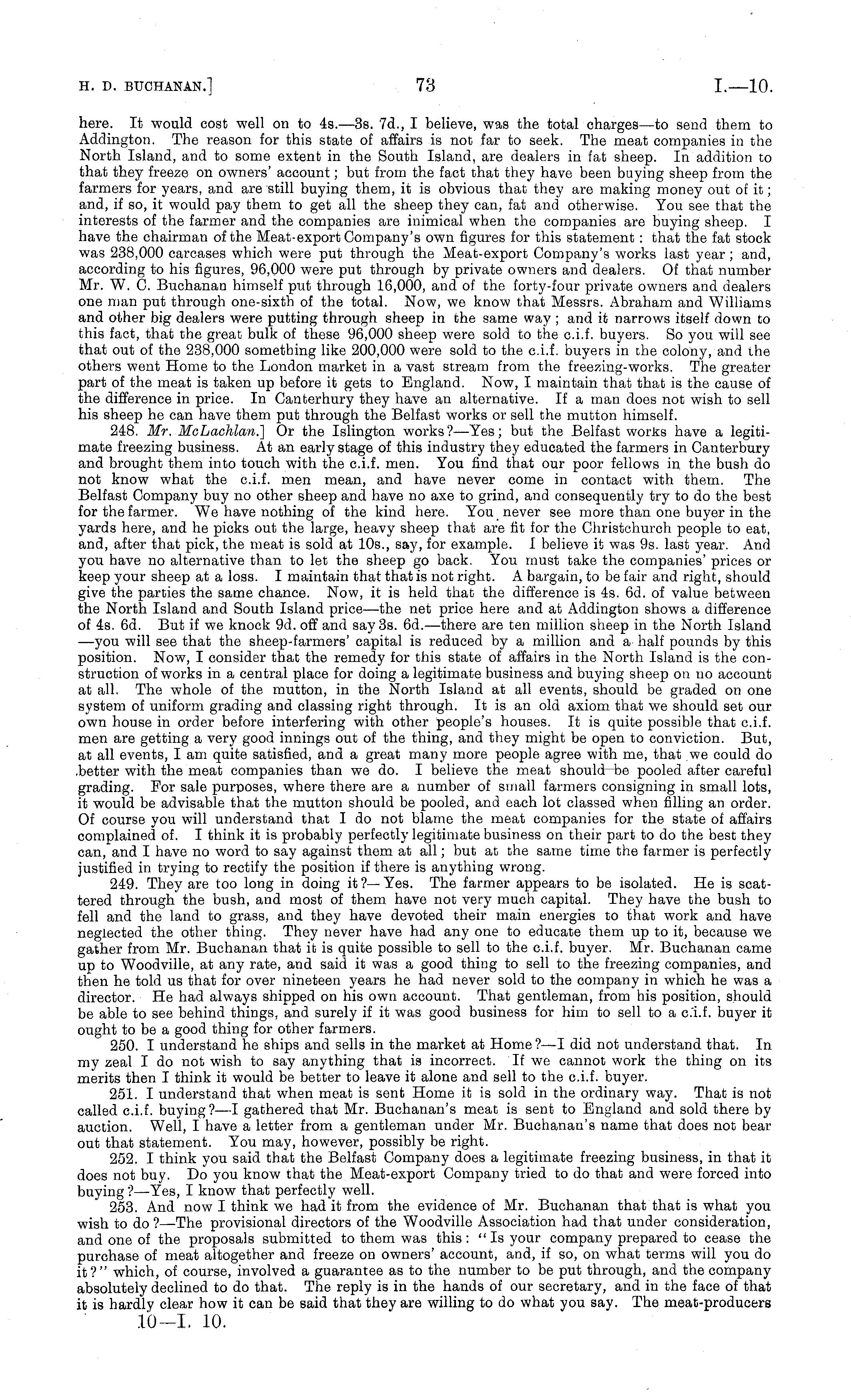 here. It would cost well on to 4s.—3s. 7d., I believe, was the total charges—to send them to Addington. The reason for this state of affairs is not far to seek. The meat companies in the North Island, and to some extent in the South Island, are dealers in fat sheep. In addition to that they freeze on owners' account; but from the fact that they have been buying sheep from the farmers for years, and are still buying them, it is obvious that they are making money out of it; and, if so, it would pay them to get all the sheep they can, fat and otherwise. You see that the interests of the farmer and the companies are inimical when the companies are buying sheep. I have the chairman of the Meat-export Company's own figures for this statement : that the fat stock was 238,000 carcases which were put through the Meat-export Company's works last year ; and, according to his figures, 96,000 were put through by private owners and dealers. Of that number Mr. W. 0. Buchanan himself put through 16,000, and of the forty-four private owners and dealers one man put through one-sixth of the total. Now, we know that Messrs. Abraham and Williams and other big dealers were putting through sheep in the same way ; and it narrows itself down to this fact, that the great bulk of these 96,000 sheep were sold to the c.i.f. buyers. So you will see that out of the 238,000 something like 200,000 were sold to the c.i.f. buyers in the colony, and the others went Home to the London market in a vast stream from the freezing-works. The greater part of the meat is taken up before it gets to England. Now, I maintain that that is the cause of the difference in price. In Canterhury they have an alternative. If a man does not wish to sell his sheep he can have them put through the Belfast works or sell the mutton himself. 248. Mr. McLachlan.] Or the Islington works?— Yes; but the Belfast works have a legitimate freezing business. At an early stage of this industry they educated the farmers in Canterbury and brought them into touch with the c.i.f. men. You find that our poor fellows in the bush do not know what the c.i.f. men mean, and have never come in contact with them. The Belfast Company buy no other sheep and have no axe to grind, and consequently try to do the best for the farmer. We have nothing of the kind here. You never see more than one buyer in the yards here, and he picks out the large, heavy sheep that are fit for the Christchurch people to eat, and, after that pick, the meat is sold at 10s., say, for example. I believe it was 9s. last year. And you have no alternative than to let the sheep go back. You must take the companies' prices or keep your sheep at a loss. I maintain that that is not right. A bargain, to be fair and right, should give the parties the same chance. Now, it is held that the difference is 4s. 6d. of value between the North Island and South Island price—the net price here and at Addington shows a difference of 4s. 6d. But if we knock 9d. off and say 3s. 6d. —there are ten million sheep in the North Island —you will see that the sheep-farmers' capital is reduced by a million and a half pounds by this position. Now, I consider that the remedy for this state of affairs in the North Island is the construction of works in a central place for doing a legitimate business and buying sheep on no account at all. The whole of the mutton, in the North Island at all events, should be graded on one system of uniform grading and classing right through. It is an old axiom that we should set our own house in order before interfering with other people's houses. It is quite possible that c.i.f. men are getting a very good innings out of the thing, and they might be open to conviction. But, at all events, I am quite satisfied, and a great many more people agree with me, that we could do .better with the meat companies than we do. I believe the meat should be pooled after careful grading. For sale purposes, where there are a number of small farmers consigning in small lots, it would be advisable that the mutton should be pooled, and each lot classed when filling an order. Of course you will understand that I do not blame the meat companies for the state of affairs complained of. I think it is probably perfectly legitimate business on their part to do the best they can, and I have no word to say against them at all; but at the same time the farmer is perfectly justified in trying to rectify the position if there is anything wrong. 249. They are too long in doing it?— Yes. The farmer appears to be isolated. He is scattered through the bush, and most of them have not very much capital. They have the bush to fell and the land to grass, and they have devoted their main energies to that work and have neglected the other thing. They never have had any one to educate them up to it, because we gather from Mr. Buchanan that it is quite possible to sell to the c.i.f. buyer. Mr. Buchanan came up to Woodville, at any rate, and said it was a good thing to sell to the freezing companies, and then he told us that for over nineteen years he had never sold to the company in which he was a director. He had always shipped on his own account. That gentleman, from his position, should be able to see behind things, and surely if it was good business for him to sell to a c.i.f. buyer it ought to be a good thing for other farmers. 250. I understand he ships and sells in the market at Home ? —I did not understand that. In my zeal I do not wish to say anything that is incorrect. If we cannot work the thing on its merits then I think it would be better to leave it alone and sell to the c.i.f. buyer. 251. I understand that when meat is sent Home it is sold in the ordinary way. That is not called c.i.f. buying ?—I gathered that Mr. Buchanan's meat is sent to England and sold there by auction. Well, I have a letter from a gentleman under Mr. Buchanan's name that does not bear out that statement. You may, however, possibly be ri
