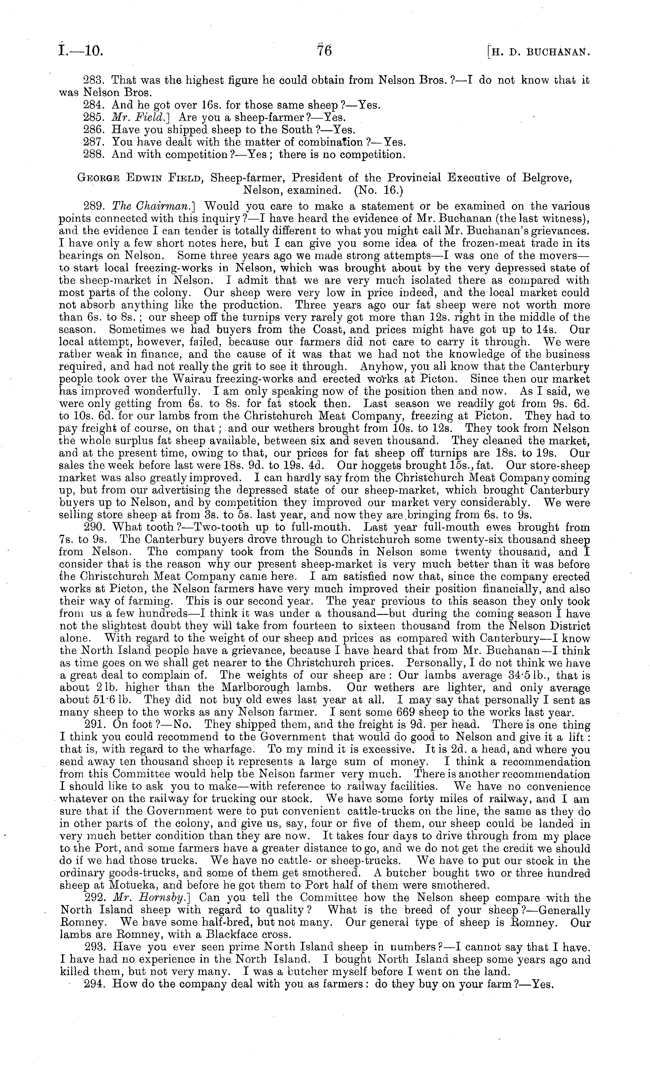 283. That was the highest figure he could obtain from Nelson Bros. ? —I do not know that it was Nelson Bros. 284. And he got over 16s. for those same sheep?— Yes. 285. Mr. Field.] Are you a sheep-farmer?— Yes. 286. Have you shipped sheep to the South ?—Yes. 287. You have dealt with the matter of combination ?—Yes. 288. And with competition?— Yes; there is no competition. George Edwin Field, Sheep-farmer, President of the Provincial Executive of Belgrove, Nelson, examined. (No. 16.) 289. The Chairman.] Would you care to make a statement or be examined on the various points connected with this inquiry?—l have heard the evidence of Mr. Buchanan (the last witness), and the evidence I can tender is totally different to what you might call Mr. Buchanan's grievances. I have only a few short notes here, but I can give you some idea of the frozen-meat trade in its bearings on Nelson. Some three years ago we made strong attempts—l was one of the movers — to start local freezing-works in Nelson, which was brought about by the very depressed state of the sheep-market in Nelson. I admit that we are very much isolated there as compared with most parts of the colony. Our sheep were very low in price indeed, and the local market could not absorb anything like the production. Three years ago our fat sheep were not worth more than 6s. to Bs. ; our sheep off the turnips very rarely got more than 12s. right in the middle of the season. Sometimes we had buyers from the Coast, and prices might have got up to 14s. Our local attempt, however, failed, because our farmers did not care to carry it through. We were rather weak in finance, and the cause of it was that we had not the knowledge of the business required, and had not really the grit to see it through. Anyhow, you all know that the Canterbury people took over the Wairau freezing-works and erected works at Picton. Since then our market has improved wonderfully. lam only speaking now of the position then and now. As I said, we were only getting from 6s. to Bs. for fat stock then. Last season we readily got from 9s. 6d. to 10s. 6d. for our lambs from the Christchurch Meat Company, freezing at Picton. They had to pay freight of course, on that ; and our wethers brought from 10s. to 12s. They took from Nelson the whole surplus fat sheep available, between six and seven thousand. They cleaned the market, and at the present time, owing to that, our prices for fat sheep off turnips are 18s. to 19s. Our sales the week before last were 18s. 9d. to 19s. 4d. Our hoggets brought 155., fat. Our store-sheep market was also greatly improved. I can hardly say from the Christchurch Meat Company coming up, but from our advertising the depressed state of our sheep-market, which brought Canterbury buyers up to Nelson, and by competition they improved our market very considerably. We were selling store sheep at from 3s. to ss. last year, and now they are bringing from 6s. to 9s. 290. What tooth ?—Two-tooth up to full-mouth. Last year full-mouth ewes brought from 7s. to 9s. The Canterbury buyers drove through to Christchurch some twenty-six thousand sheep from Nelson. The company took from the Sounds in Nelson some twenty thousand, and I consider that is the reason why our present sheep-market is very much better than it was before the Christchurch Meat Company came here. I am satisfied now that, since the company erected works at Picton, the Nelson farmers have very much improved their position financially, and also their way of farming. This is our second year. The year previous to this season they only took from us a few hundreds—l think it was under a thousand—but during the coming season I have not the slightest doubt they will take from fourteen to sixteen thousand from the Nelson District alone. With regard to the weight of our sheep and prices as compared with Canterbury—l know the North Island people have a grievance, because I have heard that from Mr. Buchanan—l think as time goes on we shall get nearer to the Christchurch prices. Personally, Ido not think we have a great deal to complain of. The weights of our sheep are: Our lambs average 34'51b., that is about 2 lb. higher than the Marlborough lambs. Our wethers are lighter, and only average about 51'61b. They did not buy old ewes last year at all. I may say that personally I sent as many sheep to the works as any Nelson farmer. I sent some 669 sheep to the works last year. 291. On foot ? —No. They shipped them, and the freight is 9d. per head. There is one thing I think you could recommend to the Government that would do good to Nelson and give it a lift : that is, with regard to the wharfage. To my mind it is excessive. It is 2d. a head, and where you send away ten thousand sheep it represents a large sum of money. I think a recommendation from this Committee would help the Nelson farmer very much. There is another recommendation I should like to ask you to make—with reference to railway facilities. We have no convenience whatever on the railway for trucking our stock. We have some forty miles of railway, and lam sure that if the Government were to put convenient cattle-trucks on the line, the same as they do in other parts of the colony, and give us, say, four or five of them, our sheep could be landed in very much better condition than they are now. It takes four days to drive through from my place to the Port, and some farmers have a greater distance to go, and we do not get the credit we should do if we had those trucks. We have no cattle- or sheep-trucks. We have to put our stock in the ordinary goods-trucks, and some of them get smothered. A butcher bought two or three hundred sheep at Motueka, and before he got them to Port half of them were smothered. 292. Mr. Hornsby.] Can you tell the Committee how the Nelson sheep compare with the North Island sheep with regard to quality ? What is the breed of your sheep ?—Generally Eomney. We have some half-bred, but not many. Our ge