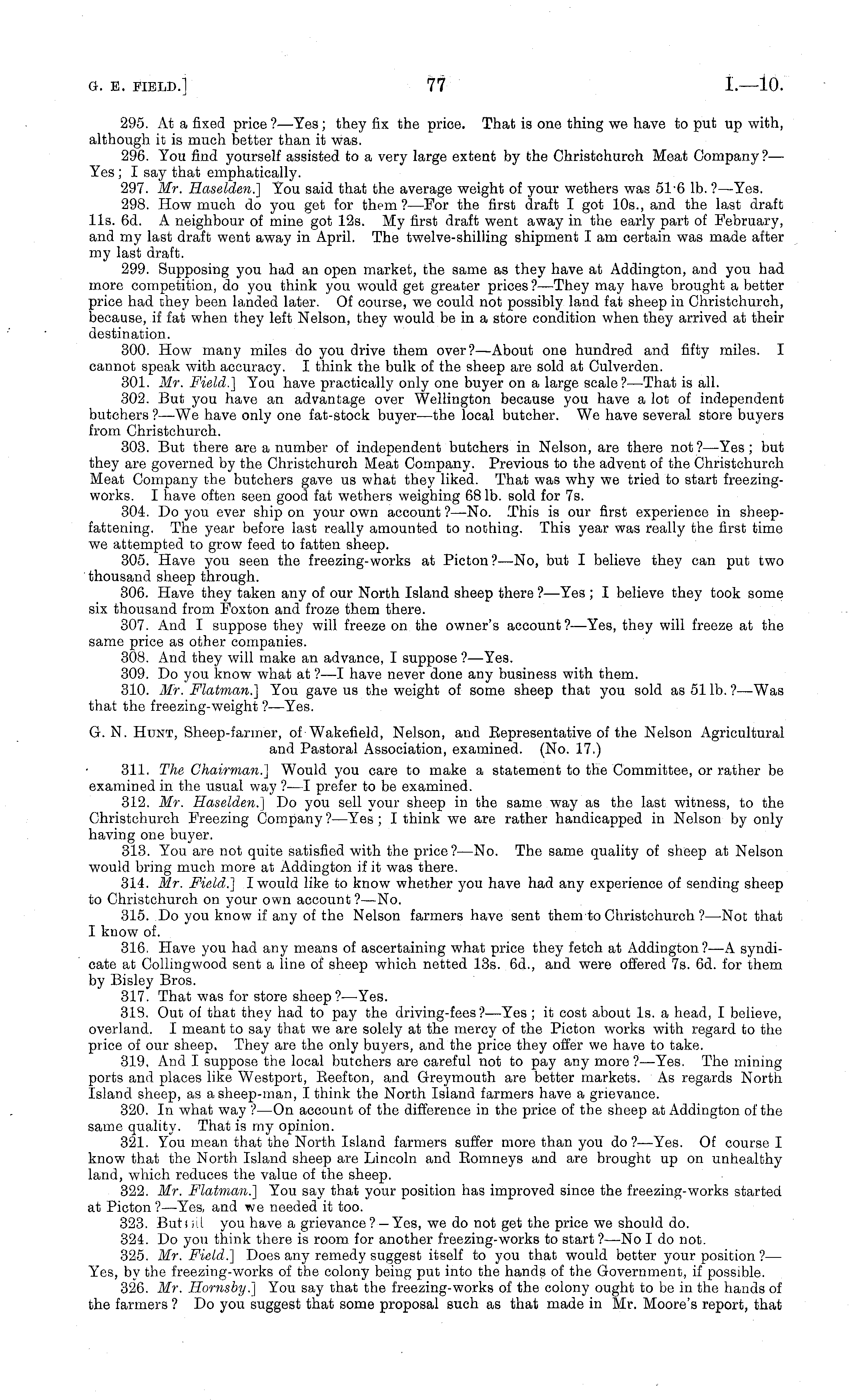 295. At a fixed price?— Yes; they fix the price. That is one thing we have to put up with, although it is much better than it was. 296. You find yourself assisted to a very large extent by the Christchurch Meat Company?— Yes; I say that emphatically. 297. Mr. Haselden.] You said that the average weight of your wethers was 516 lb. ?—Yes. 298. How much do you get for them? —For the first draft I got 10s., and the last draft lis. 6d. A neighbour of mine got 12s. My first draft went away in the early part of February, and my last draft went away in April. The twelve-shilling shipment lam certain was made after my last draft. 299. Supposing you had an open market, the same as they have at Addington, and you had more competition, do you think you would get greater prices?— They may have brought a better price had they been landed later. Of course, we could not possibly land fat sheep in Christchurch, because, if fat when they left Nelson, they would be in a store condition when they arrived at their destination. 300. How many miles do you drive them over? —About one hundred and fifty miles. I cannot speak with accuracy. I think the bulk of the sheep are sold at Culverden. 301. Mr. Field.] You have practically only one buyer on a large scale?— That is all. 302. But you have an advantage over Wellington because you have a lot of independent butchers ?—We have only one fat-stock buyer—the local butcher. We have several store buyers from Christchurch. 303. But there are a number of independent butchers in Nelson, are there not ?—Yes; but they are governed by the Christchurch Meat Company. Previous to the advent of the Christchurch Meat Company the butchers gave us what they liked. That was why we tried to start freezingworks. I have often seen good fat wethers weighing 68 lb. sold for 7s. 304. Do you ever ship on your own account ?—No. This is our first experience in sheepfattening. The year before last really amounted to nothing. This year was really the first time we attempted to grow feed to fatten sheep. 305. Have you seen the freezing-works at Picton?—-No, but I believe they can put two thousand sheep through. 306. Have they taken any of our North Island sheep there ?—Yes ; I believe they took some six thousand from Foxton and froze them there. 307. And I suppose they will freeze on the owner's account ?—Yes, they will freeze at the same price as other companies. 308. And they will make an advance, I suppose ? —Yes. 309. Do you know what at ?—I have never done any business with them. 310. Mr. Flatman.] You gave us the weight of some sheep that you sold as 51 lb. ?—Was that the freezing-weight ? —Yes. G.N. Hunt, Sheep-farmer, of Wakefield, Nelson, and Eepresentative of the Nelson Agricultural and Pastoral Association, examined. (No. 17.) 311. The Chairman.] Would you care to make a statement to the Committee, or rather be examined in the usual way ?—I prefer to be examined. 312. Mr. Haselden.] Do you sell your sheep in the same way as the last witness, to the Christchurch Freezing Company ?—Yes ; I think we are rather handicapped in Nelson by only having one buyer. 313. You are not quite satisfied with the price?— No. The same quality of sheep at Nelson would bring much more at Addington if it was there. 314. Mr. Field.] I would like to know whether you have had any experience of sending sheep to Christchurch on your own account?— No. 315. Do you know if any of the Nelson farmers have sent them to Christchurch ?—Not that I know of. 316. Have you had any means of ascertaining what price they fetch at Addington?—A syndicate at Collmgwood sent a line of sheep which netted 13s. 6d., and were offered 7s. 6d. for them by Bisley Bros. 317. That was for store sheep?— Yes. 318. Out of that they had to pay the driving-fees?— Yes ; it cost about Is. a head, I believe, overland. I meant to say that we are solely at the mercy of the Picton works with regard to the price of our sheep. They are the only buyers, and the price they offer we have to take. 319. And I suppose the local butchers are careful not to pay any more ?—Yes. The mining ports and places like Westport, Eeefton, and Greymouth are better markets. As regards North Island sheep, as a sheep-man, I think the North Island farmers have a grievance. 320. In what way ?—On account of the difference in the price of the sheep at Addington of the same quality. That is my opinion. 321. You mean that the North Island farmers suffer more than you do ?—Yes. Of course I know that the North Island sheep are Lincoln and Eomneys and are brought up on unhealthy land, which reduces the value of the sheep. 322. Mr. Flatman.] You say that your position has improved since the freezing-works started at Picton ?—Yes, and we needed it too. 323. Butsul you have a grievance?— Yes, we do not get the price we should do. 324. Do you think there is room for another freezing-works to start ?—No I do not. 325. Mr. Field.] Does any remedy suggest itself to you that would better your position ?— Yes, by the freezing-works of the colony being put into the hands of the Government, if possible. 326. Mr. Hornsby.] You say that the freezing-works of the colony ought to be in the hands of the farmers ? Do you suggest that some proposal such as that made in Mr. Moore's report, that