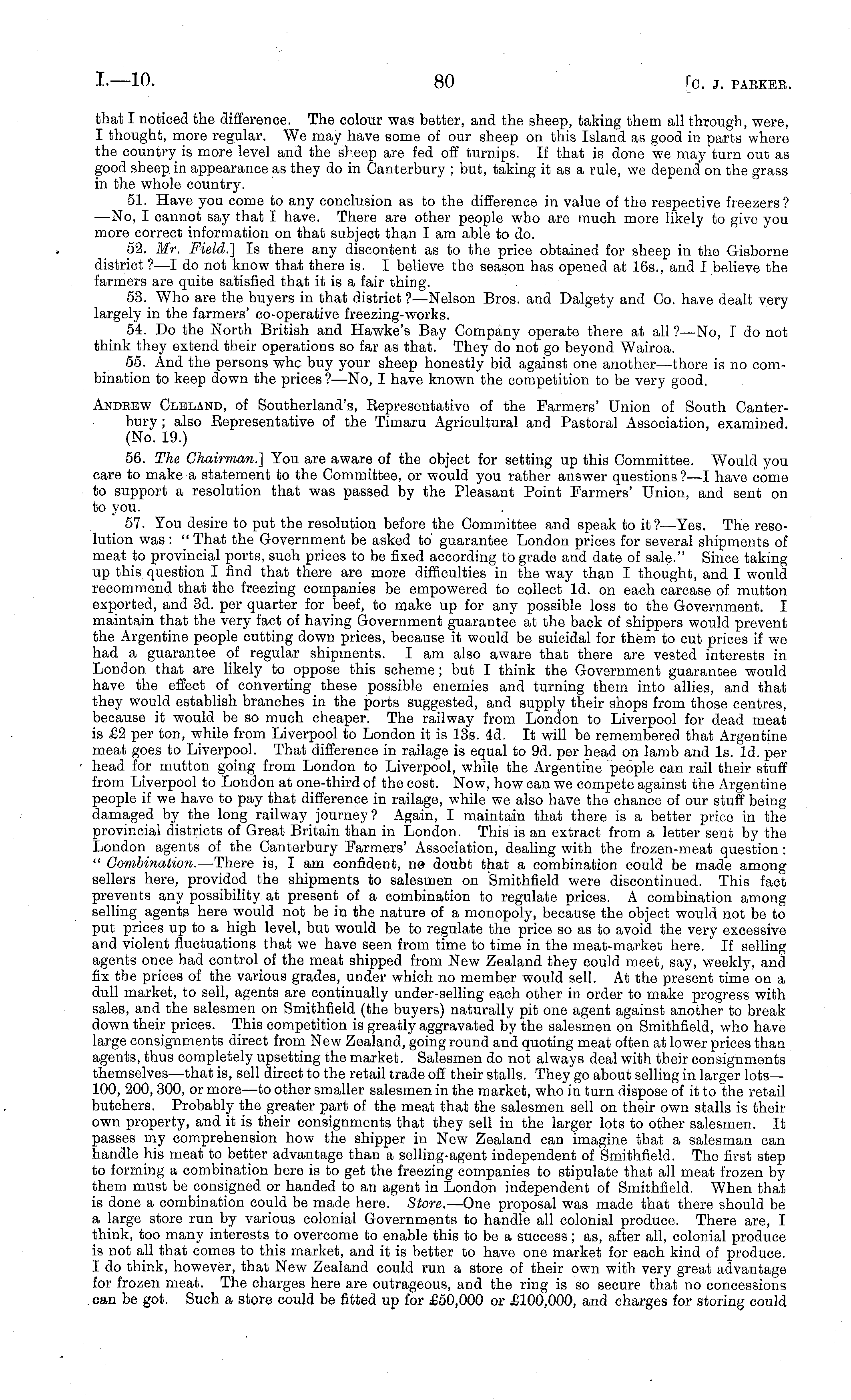 that I noticed the difference. The colour was better, and the sheep, taking them all through, were, I thought, more regular. We may have some of our sheep on this Island as good in parts where the country is more level and the sheep are fed off turnips. If that is done we may turn out as good sheep in appearance as they do in Canterbury ; but, taking it as a rule, we depend on the grass in the whole country. 51. Have you come to any conclusion as to the difference in value of the respective freezers? —No, I cannot say that I have. There are other people who are much more likely to give you more correct information on that subject than I am able to do. 52. Mr. Field.] Is there any discontent as to the price obtained for sheep in the Gisborne district ? —I do not know that there is. I believe the season has opened at 165., and I believe the farmers are quite satisfied that it is a fair thing. 53. Who are the buyers in that district ?—Nelson Bros, and Dalgety and Co. have dealt very largely in the farmers' co-operative freezing-works. 54. Do the North British and Hawke's Bay Company operate there at all ? —No, I do not think they extend their operations so far as that. They do not go beyond Wairoa. 55. And the persons whc buy your sheep honestly bid against one another—there is no combination to keep down the prices ?—No, I have known the competition to be very good. Andrew Cleland, of Southerland's, Representative of the Farmers' Union of South Canterbury ; also Representative of the Timaru Agricultural and Pastoral Association, examined. (No. 19.) 56. The Chairman.] You are aware of the object for setting up this Committee. Would you care to make a statement to the Committee, or would you rather answer questions ?—I have come to support a resolution that was passed by the Pleasant Point Farmers' Union, and sent on to you. 57. You desire to put the resolution before the Committee and speak to it?— Yes. The resolution was : " That the Government be asked to' guarantee London prices for several shipments of meat to provincial ports, such prices to be fixed according to grade and date of sale." Since taking up this question I find that there are more difficulties in the way than I thought, and I would recommend that the freezing companies be empowered to collect Id. on each carcase of mutton exported, and 3d. per quarter for beef, to make up for any possible loss to the Government. I maintain that the very fact of having Government guarantee at the back of shippers would prevent the Argentine people cutting down prices, because it would be suicidal for them to cut prices if we had a guarantee of regular shipments. I am also aware that there are vested interests in London that are likely to oppose this scheme; but I think the Government guarantee would have the effect of converting these possible enemies and turning them into allies, and that they would establish branches in the ports suggested, and supply their shops from those centres, because it would be so much cheaper. The railway from London to Liverpool for dead meat is £2 per ton, while from Liverpool to London it is 13s. 4d. It will be remembered that Argentine meat goes to Liverpool. That difference in railage is equal to 9d. per head on lamb and Is. Id. per head for mutton going from London to Liverpool, while the Argentine people can rail their stuff from Liverpool to London at one-third of the cost. Now, how can we compete against the Argentine people if we have to pay that difference in railage, while we also have the chance of our stuff being damaged by the long railway journey? Again, I maintain that there is a better price in the provincial districts of Great Britain than in London. This is an extract from a letter sent by the London agents of the Canterbury Farmers' Association, dealing with the frozen-meat question : " Combination. —There is, I am confident, no doubt that a combination could be made among sellers here, provided the shipments to salesmen on Smithfield were discontinued. This fact prevents any possibility at present of a combination to regulate prices. A combination among selling agents here would not be in the nature of a monopoly, because the object would not be to put prices up to a high level, but would be to regulate the price so as to avoid the very excessive and violent fluctuations that we have seen from time to time in the meat-market here. If selling agents once had control of the meat shipped from New Zealand they could meet, say, weekly, and fix the prices of the various grades, under which no member would sell. At the present time on a dull market, to sell, agents are continually under-selling each other in order to make progress with sales, and the salesmen on Smithfield (the buyers) naturally pit one agent against another to break down their prices. This competition is greatly aggravated by the salesmen on Smithfield, who have large consignments direct from New Zealand, going round and quoting meat often at lower prices than agents, thus completely upsetting the market. Salesmen do not always deal with their consignments themselves —that is, sell direct to the retail trade off their stalls. They go about selling in larger lots— 100, 200, 300, or more —to other smaller salesmen in the market, who in turn dispose of it to "the retail butchers. Probably the greater part of the meat that the salesmen sell on their own stalls is their own property, and it is their consignments that they sell in the larger lots to other salesmen. It passes my comprehension how the shipper in New Zealand can imagine that a salesman can handle his meat to better advantage than a selling-agent independent of Smithfield. The first step to forming a combination here is to get the freezing companies to stipulate that all meat frozen by them must be consigned or handed to an agent in London independent of Smithfield. When that is done a combination could be made here. Store. —One proposal was made 
