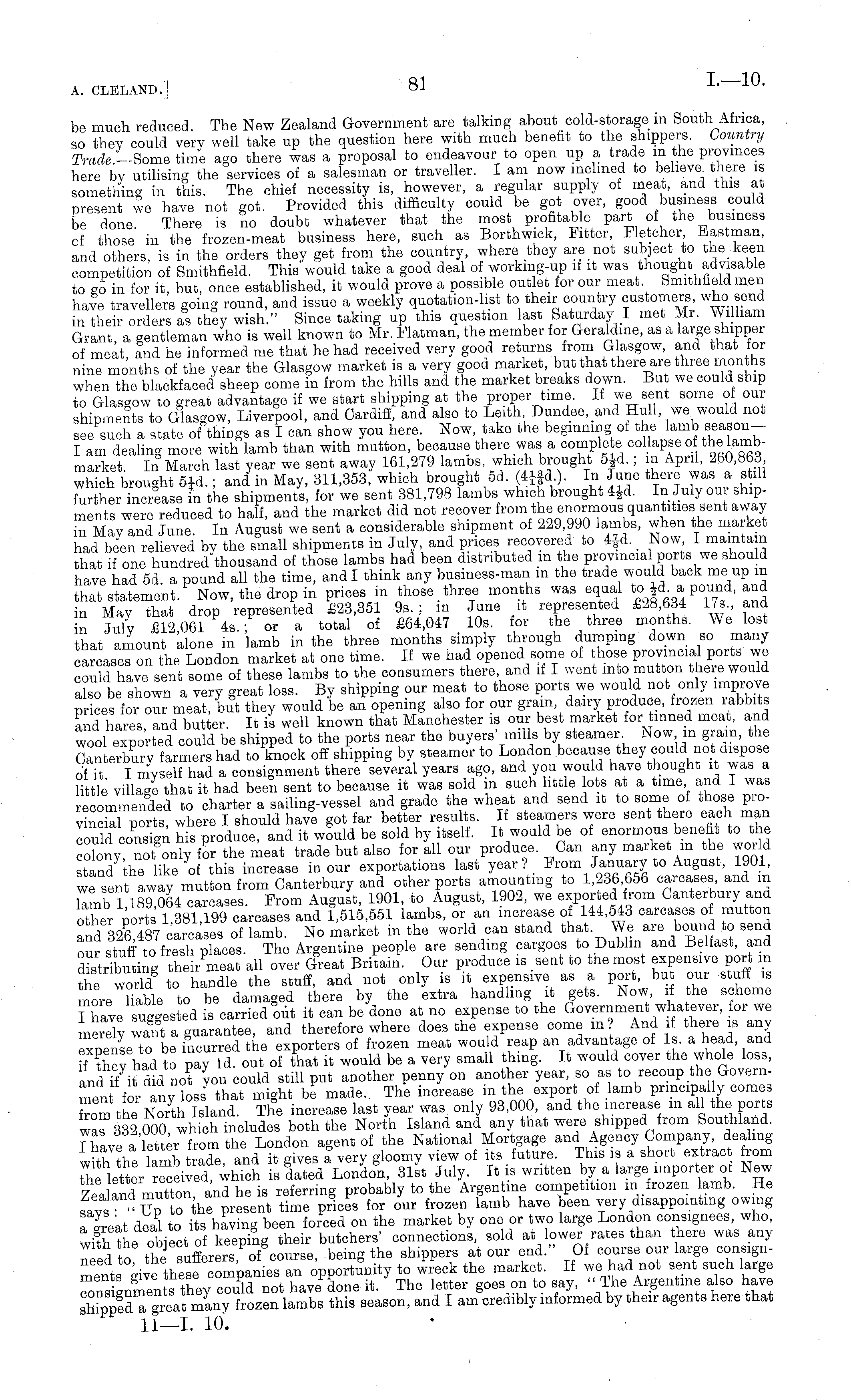 be much reduced. The New Zealand Government are talking about cold-storage in South Africa, so they could very well take up the question here with much benefit to the shippers. Country Trade-Some time ago there was a proposal to endeavour to open up a trade in the provinces here by utilising the services of a salesman or traveller. lam now inclined to believe there is something in this, The chief necessity is, however, a regular supply of meat, and this at present we have not got. Provided this difficulty could be got over, good business could be done There is no doubt whatever that the most profitable part of the business of those in the frozen-meat business here, such as Borthwick, Fitter, Fletcher Eastman, and others, is in the orders they get from the country, where they are not subject to the keen competition of Smithfield. This would take a good deal of workmg-up if it was though advisable to go in for it, but, once established, it would prove a possible outlet for our meat Smithfield men hale travellers going round, and issue a weekly quotation-list to their country customers, who send in their orders as they wish." Since taking up this question last Saturday I met Mr. William Grant, a gentleman who is well known to Mr. Flatman, the member for Geraldine, as a large shipper of meat, and he informed me that he had received very good returns from Glasgow, and that for nine months of the year the Glasgow market is a very good market, but that there are three months when the blackfaced sheep come in from the hills and the market breaks down. But we could ship to Glasgow to great advantage if we start shipping at the proper time. If we sent some of our shipments to Glasgow, Liverpool, and Cardiff, and also to Leith Dundee, and Hull we would not see such a state of things as I can show you here. Now, take the beginning of the lamb seasonlam dealing more with lamb than with mutton, because there was a complete collapse o the lambmarket In March last year we sent away 161,279 lambs, which brought s|d.; in April, 260,863 which brought s}d.; and in May, 311,353, which brought fid. 4f|d). In June there was a still farther increase in the shipments, for we sent 381,798 lambs winch brought 4Jd. In July our shipments were reduced to half, and the market did not recover from the enormous quantities sent away hi May and June. In August we sent a considerable shipment of 229,990 lambs, when the market had been relieved by the small shipments in July, and prices recovered to 4|d. Now I maintain that if one hundred thousand of those lambs had been distributed in the provincial ports we should have had sd. a pound all the time, and I think any business-man in the trade would back me up m that statement. Now, the drop in prices in those three months was equal to. jd :a pound, and in May that drop represented £23,351 9s. ; m June it represented £28,634 175., and in July £12 061 4s or a total of £64,047 10s. for the three months. We lost that amount klone in lamb in the three months simply through dumping down so many carcases on the London market at one time. If we had opened some of those provincial ports we could have sent some of these lambs to the consumers there, and if I went into mutton there would also be shown a very great loss. By shipping our meat to those ports we would not only improve prices for our meat/but they would be an opening also for our gram, dairy produce, frozen rabbits and hares, and butter. It is well known that Manchester is our best market for tinned meat, and wool exported could be shipped to the ports near the buyers mills by steamer. Now m grain, the Canterbury farmers had to knock off shipping by steamer to London because they could not dispose of it I myself had a consignment there several years ago, and you would have thought it was a httle village that it had been sent to because it was sold in such little lots at a time and I was recommended to charter a sailing-vessel and grade the wheat and send it to some of those provincial ports, where I should have got far better results. If steamers were sent there each man lould consign his produce, and it would be sold by itself. It would be of enormous benefit to the cdony notonly for the meat trade but also for all our produce. Can any market m the world stand the like of this increase in our exportations last year ? _ From January to August, 1901, we sen away mutton from Canterbury and other ports amounting to 1,236 656 carcases and in hlmb 1 189,064 carcases. From August, 1901, to August, 1902, we expor ed from Canterbury ana other ports 1 381,199 carcases and 1,515,551 lambs, or an increase of 144,543 carcases of mutton and 32M87 carcases of lamb. No market in the world can stand that. We are bound to send our stuff to fresh places. The Argentine people are sending cargoes to Dublin and Belfast, and attributing theirmeat all over Great Britain. Our produce is sent to the most expensive port m the world to handle the stuff, and not only is it expensive as a port, bu our stuff is more Table to be damaged there by the extra handling it gets. Now if the scheme I have su-ested is carried out it can be done at no expense to the Government whatever, for we merely 3 guarantee, and therefore where does the expense come in? And if there is any Expense to be incurred the exporters of frozen meat would reap an advantage of Is. a head, and ff E had to pay Id. out of that it would be a very small thing. It would cover the whole loss, and if it did not you could still put another penny on another year so as to recoup the Government for any loss that might be made. The increase in the export of lamb principally comes rom the North Island. The increase last year was, only 93,000, and the increase m all the ports was 332 000 which includes both the North Island and any that were shipped from Southland. Tray! a letter from the London agent of the National Mortgage and Agency Company, dealing with the lamb trade, and it gives a very gl