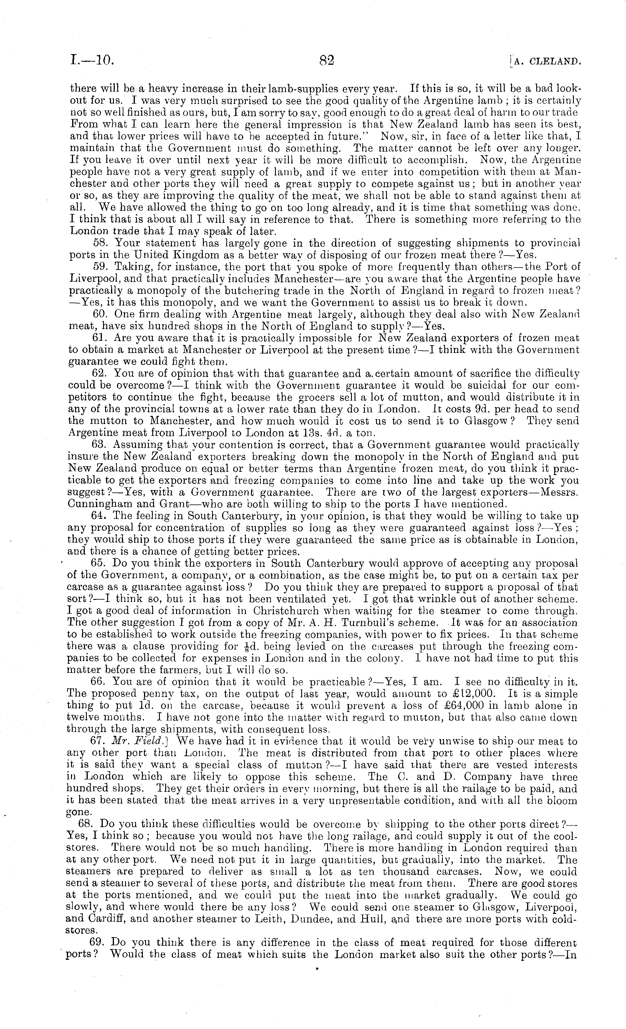 there will be a heavy increase in their lamb-supplies every year. If this is so, it will be a bad lookout for us. I was very much surprised to see the good quality of the Argentine lamb ; it is certainly not so well finished as ours, but, I am sorry to say, good enough to do a great deal of harm to our trade From what I can learn here the general impression is that New Zealand lamb has seen its best, and that lower prices will have to be accepted in future." Now, sir, in face of a letter like that, I maintain that the Government must do something. The matter cannot be left over any longer. If you leave it over until next year it will be more difficult to accomplish. Now, the Argentine people have not a very great supply of lamb, and if we enter into competition with them at Manchester and other ports they will need a great supply to compete against us; but in another year or so, as they are improving the quality of the meat, we shall not be able to stand against them at all. We have allowed the thing to go on too long already, and it is time that something was done. I think that is about all I will say in reference to that. There is something more referring to the London trade that I may speak of later. 58. Your statement has largely gone in the direction of suggesting shipments to provincial ports in the United Kingdom as a better way of disposing of our frozen meat there ?—Yes. 59. Taking, for instance, the port that you spoke of more frequently than others —the Port of Liverpool, and that practically includes Manchester —are you aware that the Argentine people have practically a monopoly of the butchering trade in the North of England in regard to frozen meat? —Yes, it has this monopoly, and we want the Government to assist us to break it down. 60. One firm dealing with Argentine meat largely, although they deal also with New Zealand meat, have six hundred shops in the North of England to supply?— Yes. 61. Are you aware that it is practically impossible for New Zealand exporters of frozen meat to obtain a market at Manchester or Liverpool at the present time ?—I think with the Government guarantee we could fight them. 62. You are of opinion that with that guarantee and a. certain amount of sacrifice the difficulty could be overcome?—l think with the Government guarantee it would be suicidal for our competitors to continue the fight, because the grocers sell a lot of mutton, and would distribute it in any of the provincial towns at a lower rate than they do in London. It costs 9d. per head to send the mutton to Manchester, and how much would it cost us to send it to Glasgow ? They send Argentine meat from Liverpool to London at 13s. 4d. a ton. 63. Assuming that your contention is correct, that a Government guarantee would practically insure the New Zealand exporters breaking down the monopoly in the North of England and put New Zealand produce on equal or better terms than Argentine frozen meat, do you think it practicable to get the exporters and freezing companies to come into line and take up the work you suggest?— Yes, with a Government guarantee. There are two of the largest exporters —Messrs. Cunningham and Grant —who are both willing to ship to the ports I have mentioned. 64. The feeling in South Canterbury, in your opinion, is that they would be willing to take up any proposal for concentration of supplies so long as they were guaranteed against loss ? —Yes ; they would ship to those ports if they were guaranteed the same price as is obtainable in London, and there is a chance of getting better prices. 65. Do you think the exporters in South Canterbury would approve of accepting any proposal of the Government, a company, or a combination, as the case might be, to put on a certain tax per carcase as a guarantee against loss ? Do you think they are prepared to support a proposal of that sort?—l think so, but it has not been ventilated yet. I got that wrinkle out of another scheme. I got a good deal of information in Christchurch when waiting for the steamer to come through. The other suggestion I got from a copy of Mr. A. H. Turnbull's scheme. It was for an association to be established to work outside the freezing companies, with power to fix prices. In that scheme there was a clause providing for Jd. being levied on the carcases put through the freezing companies to be collected for expenses in London and in the colony. I have not had time to put this matter before the farmers, but I will do so. 66. You are of opinion that it would be practicable?— Yes, I am. I see no difficulty in it.. The proposed penny tax, on the output of last year, would amount to £12,000. It is a simple thing to put Id. on the carcase, because it would prevent a loss of £64,000 in lamb alone in twelve months. I have not gone into the matter with regard to mutton, but that also came down through the large shipments, with consequent loss. 67. Mr. Field.] We have had it in evidence that it would be very unwise to ship our meat to any other port than London. The meat is distributed from that port to other places where it is said they want a special class of mutton ? —I have said that there are vested interests in London which are likely to oppose this scheme. The G. and D. Company have three hundred shops. They get their orders in every morning, but there is all the railage to be paid, and it has been stated that the meat arrives in a very unpresentable condition, and with all the bloom gone. 68. Do you think these difficulties would be overcome by shipping to the other ports direct ?— Yes, I think so ; because you would not have the long railage, and could supply it out of the coolstores. There would not be so much handling. There is more handling in London required than at any other port. We need not put it in large quantities, but gradually, into the market. The steamers are prepared to deliver as small a lot as ten thousand carcases. Now, we could send a steamer to several