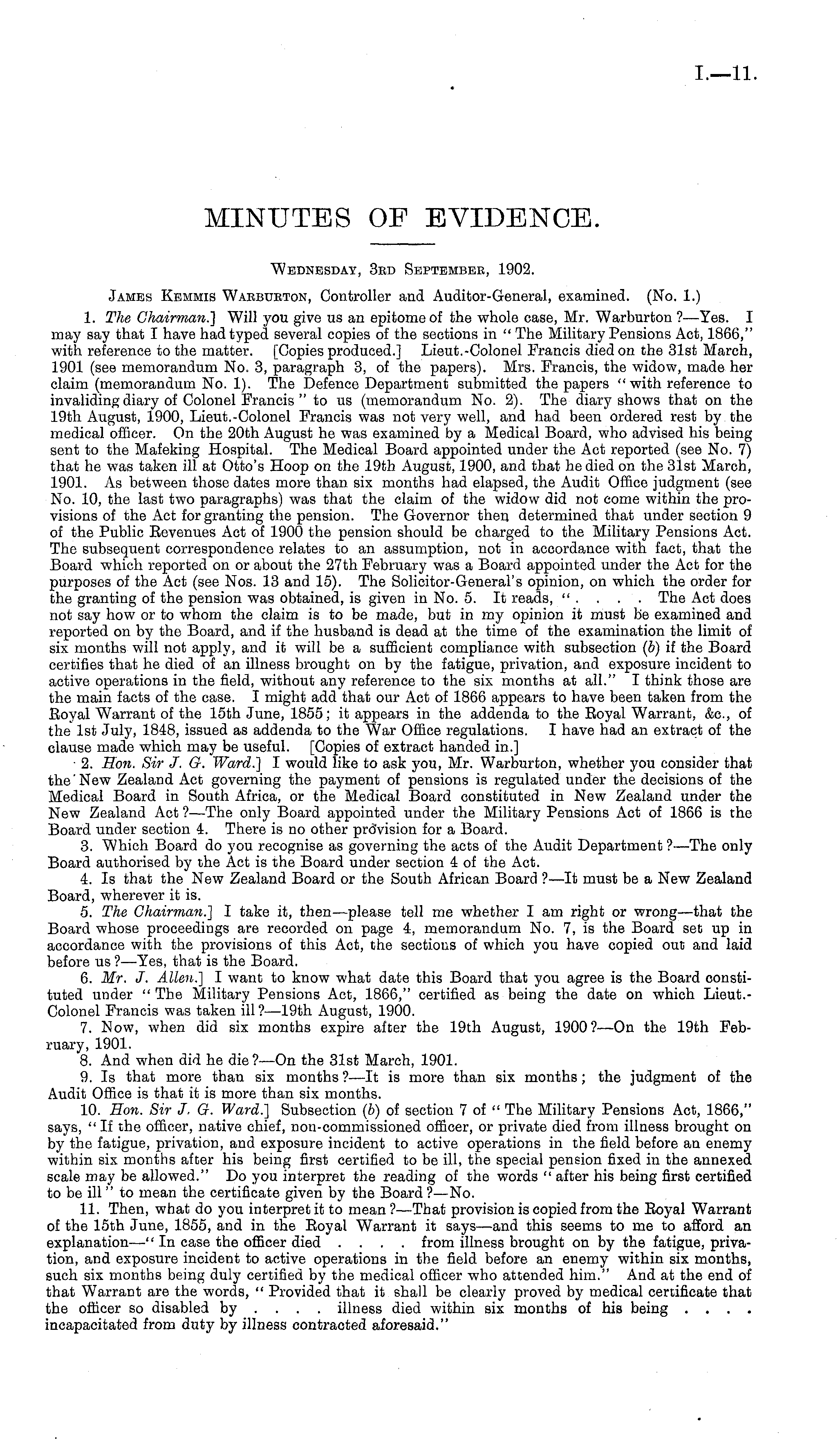 Wednesday, 3rd September, 1902. James Kemmis Warburton, Controller and Auditor-General, examined. (No. 1.) 1. The Chairman.] Will you give us an epitome of the whole case, Mr. Warburton ?—Yes. I may say that I have had typed several copies of the sections in " The Military Pensions Act, 1866," with reference to the matter. [Copies produced.] Lieut.-Colonel Francis died on the 31st March, 1901 (see memorandum No. 3, paragraph 3, of the papers). Mrs. Francis, the widow, made her claim (memorandum No. 1). The Defence Department submitted the papers "with reference to invaliding diary of Colonel Francis "to us (memorandum No. 2). The diary shows that on the 19th August, 1900, Lieut.-Colonel Francis was not very well, and had been ordered rest by the medical officer. On the 20th August he was examined by a Medical Board, who advised his being sent to the Mafeking Hospital. The Medical Board appointed under the Act reported (see No. 7) that he was taken ill at Otto's Hoop on the 19th August, 1900, and that he died on the 31st March, 1901. As between those dates more than six months had elapsed, the Audit Office judgment (see No. 10, the last two paragraphs) was that the claim of the widow did not come within the provisions of the Act for granting the pension. The Governor then determined that under section 9 of the Public Eevenues Act of 1900 the pension should be charged to the Military Pensions Act. The subsequent correspondence relates to an assumption, not in accordance with fact, that the Board which reported on or about the 27th February was a Board appointed under the Act for the purposes of the Act (see Nos. 13 and 15). The Solicitor-General's opinion, on which the order for the granting of the pension was obtained, is given in No. 5. It reads, " . . . . The Act does not say how or to whom the claim is to be made, but in my opinion it must be examined and reported on by the Board, and if the husband is dead at the time of the examination the limit of six months will not apply, and it will be a sufficient compliance with subsection (b) if the Board certifies that he died of an illness brought on by the fatigue, privation, and exposure incident to active operations in the field, without any reference to the six months at all." I think those are the main facts of the case. I might add that our Act of 1866 appears to have been taken from the Boyal Warrant of the 15th June, 1855; it appears in the addenda to the Royal Warrant, &c, of the Ist July, 1848, issued as addenda to the War Office regulations. I have had an extract of the clause made which may be useful. [Copies of extract handed in.] 2. Hon. Sir J. G. Ward.] I would like to ask you, Mr. Warburton, whether you consider that the' New Zealand Act governing the payment of pensions is regulated under the decisions of the Medical Board in South Africa, or the Medical Board constituted in New Zealand under the New Zealand Act ?—The only Board appointed under the Military Pensions Act of 1866 is the Board under section 4. There is no other provision for a Board. 3. Which Board do you recognise as governing the acts of the Audit Department ?—The only Board authorised by the Act is the Board under section 4 of the Act. 4. Is that the New Zealand Board or the South African Board ?—lt must be a New Zealand Board, wherever it is. 5. The Chairman.] I take it, then—please tell me whether I am right or wrong—that the Board whose proceedings are recorded on page 4, memorandum No. 7, is the Board set up in accordance with the provisions of this Act, the sections of which you have copied out and laid before us ? —Yes, that is the Board. 6. Mr. J. Allen.] I want to know what date this Board that you agree is the Board constituted under " The Military Pensions Act, 1866," certified as being the date on which Lieut.Colonel Francis was taken ill ? —l9th August, 1900. 7. Now, when did six months expire after the 19th August, 1900?— On the 19th February, 1901. 8. And when did he die?—On the 31st March, 1901. 9. Is that more than six months ?—-It is more than six months; the judgment of the Audit Office is that it is more than six months. 10. Hon. Sir J, G. Ward.] Subsection (b) of section 7of " The Military Pensions Act, 1866," says, "If the officer, native chief, non-commissioned officer, or private died from illness brought on by the fatigue, privation, and exposure incident to active operations in the field before an enemy within six months after his being first certified to be ill, the special pension fixed in the annexed scale may be allowed." Do you interpret the reading of the words " after his being first certified to be ill" to mean the certificate given by the Board ? —No. 11. Then, what do you interpret it to mean?— That provision is copied from the Eoyal Warrant of the 15th June, 1855, and in the Eoyal Warrant it says—and this seems to me to afford an explanation —" In case the officer died .... from illness brought on by the fatigue, privation, and exposure incident to active operations in the field before an enemy within six months, such six months being duly certified by the medical officer who attended him." And at the end of that Warrant are the words, " Provided that it shall be clearly proved by medical certificate that the officer so disabled by .... illness died within six months of his being . incapacitated from duty by illness contracted aforesaid."