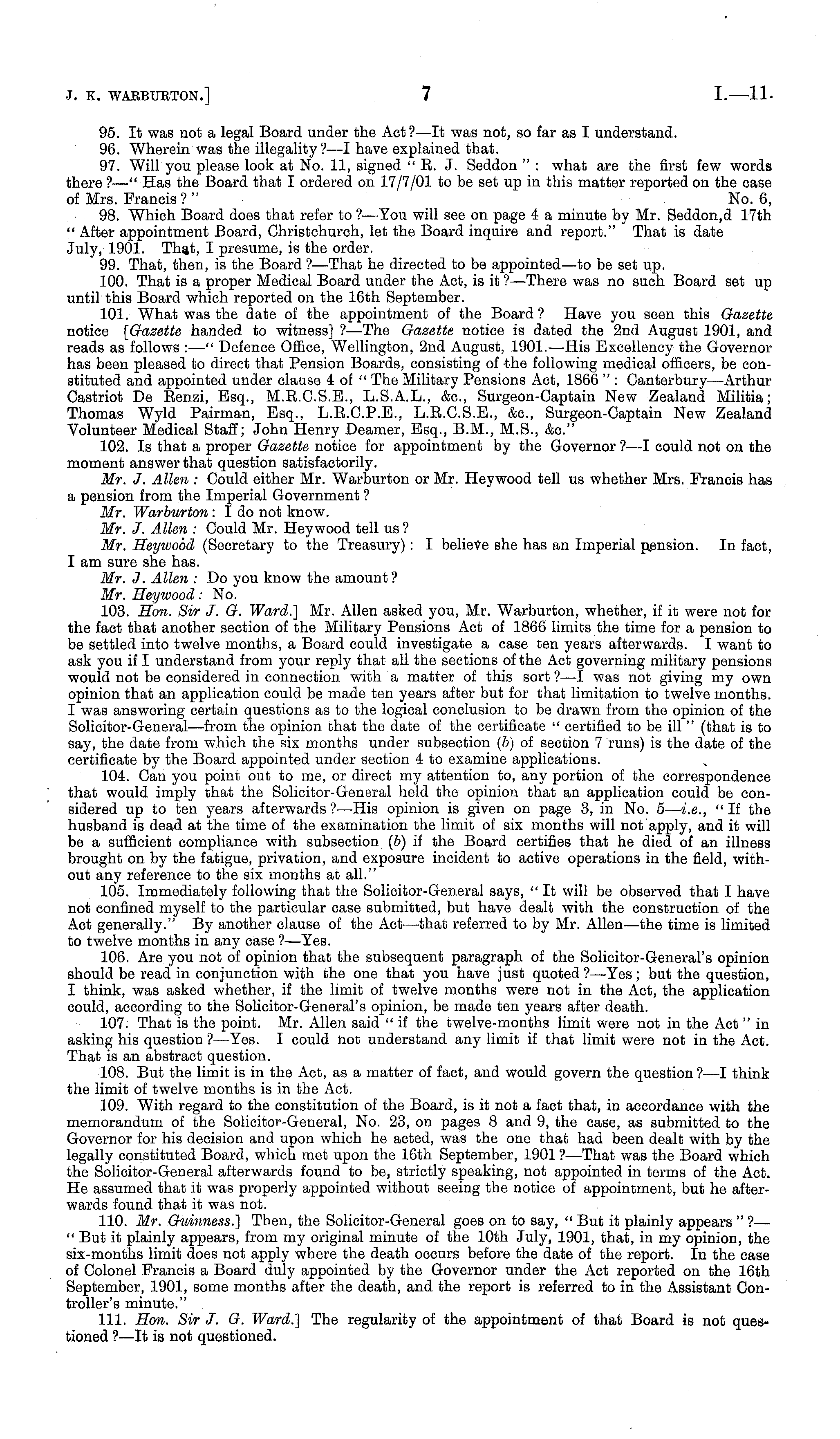 95. It was not a legal Board under the Act? —It was not, so far as I understand. 96. Wherein was the illegality ?—I have explained that. 97. Will you please look at No. 11, signed "E. J. Seddon " : what are the first few words there ?—" Has the Board that I ordered on 17/7/01 to be set up in this matter reported on the case of Mrs. Francis ? " No. 6, 98. Which Board does that refer to ?—You will see on page 4 a minute by Mr. Seddon,d 17th " After appointment Board, Christchurch, let the Board inquire and report." That is date July, 1901. That, I presume, is the order. 99. That, then, is the Board ? —That he directed to be appointed—to be set up. 100. That is a proper Medical Board under the Act, is it ?—There was no such Board set up until this Board which reported on the 16th September. 101. What was the date of the appointment of the Board? Have you seen this Gazette notice [Gazette handed to witness] ?—The Gazette notice is dated the 2nd August 1901, and reads as follows : —" Defence Office, Wellington, 2nd August, 1901.—His Excellency the Governor has been pleased to direct that Pension Boards, consisting of the following medical officers, be constituted and appointed under clause 4 of " The Military Pensions Act, 1866 " : Canterbury—Arthur Castriot De Eenzi, Esq., M.E.C.S.E., L.S.A.L., &c, Surgeon-Captain New Zealand Militia; Thomas Wyld Pairman, Esq., L.E.C.P.E., L.E.C.S.E., &c, Surgeon-Captain New Zealand Volunteer Medical Staff; John Henry Deamer, Esq., 8.M., M.S., &c." 102. Is that a proper Gazette notice for appointment by the Governor ?—I could not on the moment answer that question satisfactorily. Mr. J. Allen : Could either Mr. Warburton or Mr. Heywood tell us whether Mrs. Francis has a pension from the Imperial Government ? Mr. Warburton : Ido not know. Mr. J. Allen : Could Mr. Heywood tell us ? Mr. Heywood (Secretary to the Treasury): I believe she has an Imperial pension. In fact, I am sure she has. Mr. J. Allen : Do you know the amount? Mr. Heywood: No. 103. Hon. Sir J. G. Ward.] Mr. Allen asked you, Mr. Warburton, whether, if it were not for the fact that another section of the Military Pensions Act of 1866 limits the time for a pension to be settled into twelve months, a Board could investigate a case ten years afterwards. I want to ask you if I understand from your reply that all the sections of the Act governing military pensions would not be considered in connection with a matter of this sort ? —I was not giving my own opinion that an application could be made ten years after but for that limitation to twelve months. I was answering certain questions as to the logical conclusion to be drawn from the opinion of the Solicitor-General —from the opinion that the date of the certificate " certified to be ill " (that is to say, the date from which the six months under subsection (b) of section 7 runs) is the date of the certificate by the Board appointed under section 4 to examine applications. 104. Can you point out to me, or direct my attention to, any portion of the correspondence that would imply that the Solicitor-General held the opinion that an application could be considered up to ten years afterwards ?—His opinion is given on page 3, in No. s— i.e., "If the husband is dead at the time of the examination the limit of six months will not apply, and it will be a sufficient compliance with subsection (b) if the Board certifies that he died of an illness brought on by the fatigue, privation, and exposure incident to active operations in the field, without any reference to the six months at all." 105. Immediately following that the Solicitor-General says, " It will be observed that I have not confined myself to the particular case submitted, but have dealt with the construction of the Act generally." By another clause of the Act —that referred to by Mr. Allen—the time is limited to twelve months in any case ? —-Yes. 106. Are you not of opinion that the subsequent paragraph of the Solicitor-General's opinion should be read in conjunction with the one that you have just quoted?— Yes; but the question, I think, was asked whether, if the limit of twelve months were not in the Act, the application could, according to the Solicitor-General's opinion, be made ten years after death. 107. That is the point. Mr. Allen said "if the twelve-months limit were not in the Act "in asking his question ? —Yes. I could not understand any limit if that limit were not in the Act. That is an abstract question. 108. But the limit is in the Act, as a matter of fact, and would govern the question?—l think the limit of twelve months is in the Act. 109. With regard to the constitution of the Board, is it not a fact that, in accordance with the memorandum of the Solicitor-General, No. 23, on pages 8 and 9, the case, as submitted to the Governor for his decision and upon which he acted, was the one that had been dealt with by the legally constituted Board, which met upon the 16th September, 1901 ?—That was the Board which the Solicitor-General afterwards found to be, strictly speaking, not appointed in terms of the Act. He assumed that it was properly appointed without seeing the notice of appointment, but he afterwards found that it was not. 110. Mr. Guinness.] Then, the Solicitor-General goes on to say, " But it plainly appears "?— " But it plainly appears, from my original minute of the 10th July, 1901, that, in my opinion, the six-months limit does not apply where the death occurs before the date of the report. In the case of Colonel Francis a Board duly appointed by the Governor under the Act reported on the 16th September, 1901, some months after the death, and the report is referred to in the Assistant Controller's minute." 111. Hon. Sir J. G. Ward.] The regularity of the appointment of that Board is not questioned ?—lt is not questioned.