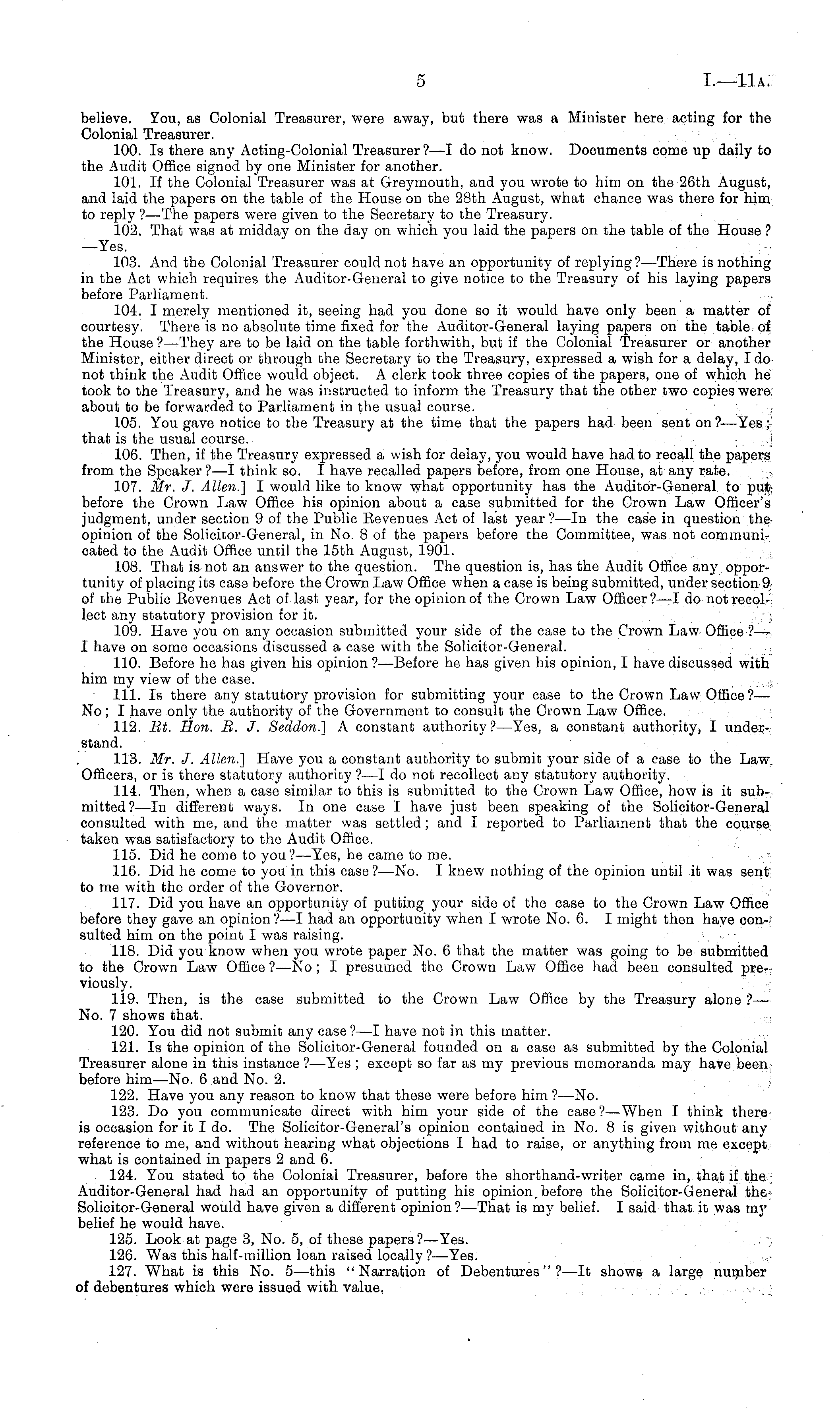 believe. You, as Colonial Treasurer, were away, but there was a Minister here acting for the Colonial Treasurer. 100. Is there any Acting-Colonial Treasurer?—l do not know. Documents come up daily to the Audit Office signed by one Minister for another. 101. If the Colonial Treasurer was at Greymouth, and you wrote to him on the 26th August, and laid the papers on the table of the House on the 28th August, what chance was there for him to reply ?—The papers were given to the Secretary to the Treasury. 102. That was at midday on the day on which you laid the papers on the table of the House ? —Yes. 103. And the Colonial Treasurer could not have an opportunity of replying ? —There is nothing in the Act which requires the Auditor-General to give notice to the Treasury of his laying papers before Parliament. 104. I merely mentioned it, seeing had you done so it would have only been a matter of courtesy. There is no absolute time fixed for the Auditor-General laying papers on the table of the House?— They are to be laid on the table forthwith, but if the Colonial Treasurer or another Minister, either direct or through the Secretary to the Treasury, expressed a wish for a delay, I do not think the Audit Office would object. A clerk took three copies of the papers, one of which he took to the Treasury, and he was instructed to inform the Treasury that the other two copies were about to be forwarded to Parliament in the usual course. 105. You gave notice to the Treasury at the time that the papers had been sent on?— Yes; that is the usual course. 106. Then, if the Treasury expressed a wish for delay, you would have had to recall the papers from the Speaker? —I think so. I have recalled papers before, from one House, at any rate. ■. 107. Mr. J. Allen.] I would like to know what opportunity has the Auditor-General to putbefore the Crown Law Office his opinion about a case submitted for the Crown Law Officer's judgment, under section 9 of the Public Eevenues Act of last year?—ln the case in question the opinion of the Solicitor-General, in No. 8 of the papers before the Committee, was not communicated to the Audit Office until the 15th August, 1901. 108. That is not an answer to the question. The question is, has the Audit Office any opportunity of placing its case before the Crown Law Office when a case is being submitted, under section 9. of the Public Eevenues Act of last year, for the opinion of the Crown Law Officer?—l do not recollect any statutory provision for it. ■) 109. Have you on any occasion submitted your side of the case to the Crown Law Office ?— I have on some occasions discussed a case with the Solicitor-General. 110. Before he has given his opinion ?—Before he has given his opinion, I have discussed with him my view of the case. 111. Is there any statutory provision for submitting your case to the Crown Law Office?— No; I have only the authority of the Government to consult the Crown Law Office. 112. Bt. Hon. B. J. Seddon.] A constant authority?— Yes, a constant authority, I understand. 113. Mr. J. Allen.] Have you a constant authority to submit your side of a case to the Law Officers, or is there statutory authority?—l do not recollect any statutory authority. 114. Then, when a case similar to this is submitted to the Crown Law Office, how is it submitted?—ln different ways. In one ease I have just been speaking of the Solicitor-General consulted with me, and the matter was settled; and I reported to Parliament that the course taken was satisfactory to the Audit Office. 115. Did he come to you? —Yes, he came to me. > 116. Did he come to you in this case ? —No. I knew nothing of the opinion until it was sent to me with the order of the Governor. 117. Did you have an opportunity of putting your side of the case to the Crown Law Office before they gave an opinion? —I had an opportunity when I wrote No. 6. I might then have consulted him on the point I was raising. 118. Did you know when you wrote paper No. 6 that the matter was going to be submitted to the Crown Law Office ? —No ; I presumed the Crown Law Office had been consulted previously. 119. Then, is the case submitted to the Crown Law Office by the Treasury alone ?— No. 7 shows that. 120. You did not submit any case ? —I have not in this matter. 121. Is the opinion of the Solicitor-General founded on a case as submitted by the Colonial Treasurer alone in this instance ?—Yes ; except so far as my previous memoranda may have been before him—No. 6 and No. 2. 122. Have you any reason to know that these were before him ?—No. 123. Do you communicate direct with him your side of the case?— When I think there is occasion for it I do. The Solicitor-General's opinion contained in No. Bis given without any reference to me, and without hearing what objections I had to raise, or anything from me except what is contained in papers 2 and 6. 124. You stated to the Colonial Treasurer, before the shorthand-writer came in, that if the Auditor-General had had an opportunity of putting his opinion, before the Solicitor-General the-Solicitor-General would have given a different opinion ?—That is my belief. I said that it was my belief he would have. 125. Look at page 3, No. 5, of these papers?— Yes. 126. Was this half-million loan raised locally?— Yes. 127. What is this No. s—this "Narration of Debentures"? —It shows a large number of debentures which were issued with value,