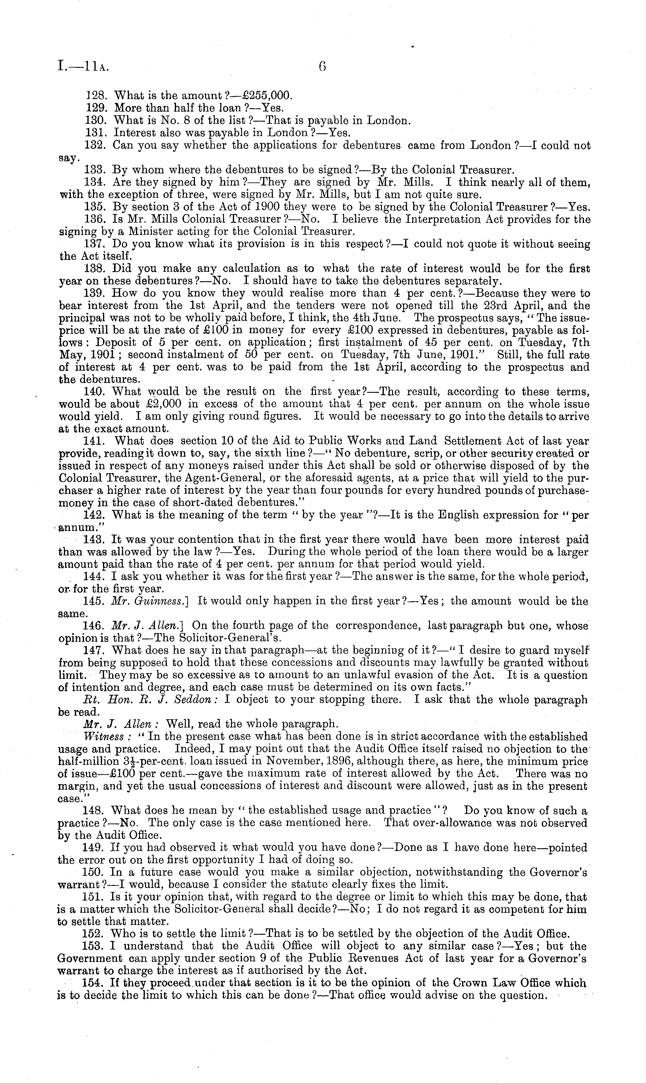 128. What is the amount ?—£255,000. 129. More than half the loan ?—Yes. 130. What is No. 8 of the list ?—That is payable in London. 131. Interest also was payable in London ?—Yes. 132. Can you say whether the applications for debentures came from London ? —I could not say. 133. By whom where the debentures to be signed ?—By the Colonial Treasurer. 134. Are they signed by him ?—They are signed by Mr. Mills. I think nearly all of them, with the exception of three, were signed by Mr. Mills, but I am not quite sure. 135. By section 3 of the Act of 1900 they were to be signed by the Colonial Treasurer ?—Yes. 136. Is Mr. Mills Colonial Treasurer ?—No. I believe the Interpretation Act provides for the signing by a Minister acting for the Colonial Treasurer. 137. Do you know what its provision is in this respect?—l could not quote it without seeing the Act itself. 138. Did you make any calculation as to what the rate of interest would be for the first year on these debentures ? —No. I should have to take the debentures separately. 139. How do you know they would realise more than 4 per cent. ? —Because they were to bear interest from the Ist April, and the tenders were not opened till the 23rd April, and the principal was not to be wholly paid before, I think, the 4th June. The prospectus says, " The issueprice will be at the rate of £100 in money for every £100 expressed in debentures, payable as follows : Deposit of 5 per cent, on application; first instalment of 45 per cent, on Tuesday, 7th May, 1901; second instalment of 50 per cent, on Tuesday, 7th June, 1901." Still, the full rate of interest at 4 per cent, was to be paid from the Ist April, according to the prospectus and the debentures. 140. What would be the result on the first year?— The result, according to these terms, would be about £2,000 in excess of the amount that 4 per cent, per annum on the whole issue would yield. lam only giving round figures. It would be necessary to go into the details to arrive at the exact amount. 141. What does section 10 of the Aid to Public Works and Land Settlement Act of last year provide, reading it down to, say, the sixth line ? —" No debenture, scrip, or other security created or issued in respect of any moneys raised under this Act shall be sold or otherwise disposed of by the Colonial Treasurer, the Agent-General, or the aforesaid agents, at a price that will yield to the purchaser a higher rate of interest by the year than four pounds for every hundred pounds of purchasemoney in the case of short-dated debentures." 142. What is the meaning of the term " by the year "? —It is the English expression for " per annum." 143. It was your contention that in the first year there would have been more interest paid than was allowed by the law ?—Yes. During the whole period of the loan there would be a larger amount paid than the rate of 4 per cent, per annum for that period would yield. 144. I ask you whether it was for the first year ?—The answer is the same, for the whole period, or. for the first year. 145. Mr. Guinness.] It would only happen in the first year?— Yes; the amount would be the same. 146. Mr. J. Allen.] On the fourth page of the correspondence, last paragraph but one, whose opinion is that ?—The Solicitor-General's. 147. What does he say in that paragraph—at the beginning of it ? —" I desire to guard myself from being supposed to hold that these concessions and discounts may lawfully be granted without limit. They may be so excessive as to amount to an unlawful evasion of the Act. It is a question of intention and degree, and each case must be determined on its own facts." Bt. Hon. B. J. Seddon: I object to your stopping there. I ask that the whole paragraph be read. Mr. J. Allen : Well, read the whole paragraph. Witness : " In the present case what has been done is in strict accordance with the established usage and practice. Indeed, I may point out that the Audit Office itself raised no objection to the half-million loan issued in November, 1896, although there, as here, the minimum price of issue—£loo per cent. —gave the maximum rate of interest allowed by the Act. There was no margin, and yet the usual concessions of interest and discount were allowed, just as in the present case." 148. What does he mean by " the established usage and practice " ? Do you know of such a practice ?—No. The only case is the case mentioned here. That over-allowance was not observed by the Audit Office. 149. If you had observed it what would you have done?— Done as I have done here—pointed the error out on the first opportunity I had of doing so. 150. In a future case would you make a similar objection, notwithstanding the Governor's warrant ?—I would, because I consider the statute clearly fixes the limit. 151. Is it your opinion that, with regard to the degree or limit to which this may be done, that is a matter which the Solicitor-General shall decide?—No; I do not regard it as competent for him to settle that matter. 152. Who is to settle the limit ?—That is to be settled by the objection of the Audit Office. 153. I understand that the Audit Office will object to any similar case ?—Yes ; but the Government can apply under section 9 of the Public Revenues Act of last year for a Governor's warrant to charge the interest as if authorised by the Act. 154. If they proceed under that section is it to be the opinion of the Crown Law Office which is to decide the limit to which this can be done ?—That office would advise on the question.