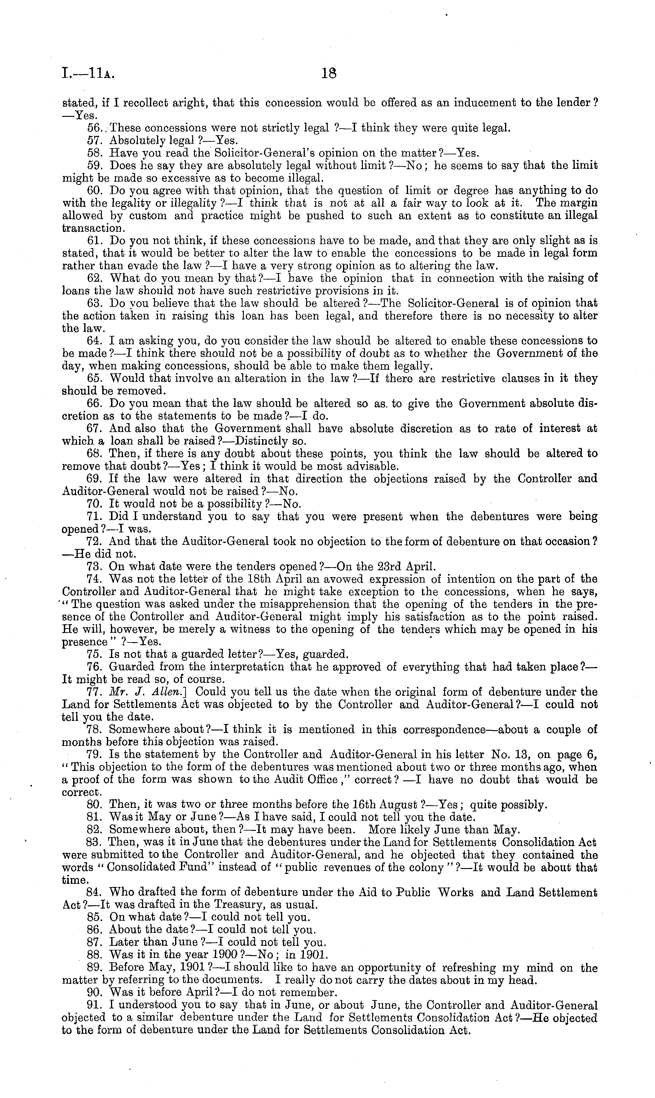 stated, if I recollect aright, that this concession would be offered as an inducement to the lender ? —Yes. 56. These concessions were not strictly legal ?—I think they were quite legal. 57. Absolutely legal ?—Yes. 58. Have you read the Solicitor-General's opinion on the matter ? —Yes. 59. Does he say they are absolutely legal without limit ? —No; he seems to say that the limit might be made so excessive as to become illegal. 60. Do you agree with that opinion, that the question of limit or degree has anything to do with the legality or illegality ?—I think that is not at all a fair way to look at it. The margin allowed by custom and practice might be pushed to such an extent as to constitute an illegal transaction. 61. Do you not think, if these concessions have to be made, and that they are only slight as is stated, that it would be better to alter the law to enable the concessions to be made in legal form rather than evade the law ?—I have a very strong opinion as to altering the law. 62. What do you mean by that ? —I have the opinion that in connection with the raising of loans the law should not have such restrictive provisions in it. 63. Do you believe that the law should be altered ? —The Solicitor-General is of opinion that the action taken in raising this loan has been legal, and therefore there is no necessity to alter the law. 64. I am asking you, do you consider the law should be altered to enable these concessions to be made ? —I think there should not be a possibility of doubt as to whether the Government of the day, when making concessions, should be able to make them legally. 65. Would that involve an alteration in the law ?—lf there are restrictive clauses in it they should be removed. 66. Do you mean that the law should be altered so as. to give the Government absolute discretion as to the statements to be made ? —I do. 67. And also that the Government shall have absolute discretion as to rate of interest at which a loan shall be raised ? —Distinctly so. 68. Then, if there is any doubt about these points, you think the law should be altered to remove that doubt ?—Yes; I think it would be most advisable. 69. If the law were altered in that direction the objections raised by the Controller and Auditor-General would not be raised ?—No. 70. It would not be a possibility ?—No. 71. Did I understand you to say that you were present when the debentures were being opened? —I was. 72. And that the Auditor-General took no objection to the form of debenture on that occasion ? —He did not. 73. On what date were the tenders opened?—On the 23rd April. 74. Was not the letter of the 18th April an avowed expression of intention on the part of the Controller and Auditor-General that he might take exception to the concessions, when he says, "The question was asked under the misapprehension that the opening of the tenders in the presence of the Controller and Auditor-General might imply his satisfaction as to the point raised. He will, however, be merely a witness to the opening of the tenders which may be opened in his presence " ?—Yes. 75. Is not that a guarded letter? —Yes, guarded. 76. Guarded from the interpretation that he approved of everything that had taken place?— It might be read so, of course. 77. Mr. J. Allen.] Could you tell us the date when the original form of debenture under the Land for Settlements Act was objected to by the Controller and Auditor-General ? —I could not tell you the date. 78. Somewhere about ? —I think it is mentioned in this correspondence—about a couple of months before this objection was raised. 79. Is the statement by the Controller and Auditor-General in his letter No. 13, on page 6, " This objection to the form of the debentures was mentioned about two or three months ago, when a proof of the form was shown to the Audit Office ," correct ?—I have no doubt that would be correct. 80. Then, it was two or three months before the 16th August ? —Yes; quite possibly. 81. Was it May or June?—As I have said, I could not tell you the date. 82. Somewhere about, then ?—lt may have been. More likely June than May. 83. Then, was it in June that the debentures under the Land for Settlements Consolidation Act were submitted to the Controller and Auditor-General, and he objected that they contained the words " Consolidated Fund" instead of " public revenues of the colony " ?—lt would be about that time. 84. Who drafted the form of debenture under the Aid to Public Works and Land Settlement Act?—lt was drafted in the Treasury, as usual. 85. On what date ?—I could not tell you. 86. About the date?—l could not tell you. 87. Later than June ?—I could not tell you. 88. Was it in the year 1900 ?—No; in 1901. 89. Before May, 1901 ?—I should like to have an opportunity of refreshing my mind on the matter by referring to the documents. I really do not carry the dates about in my head. 90. Was it before April?—l do not remember. 91. I understood you to say that in June, or about June, the Controller and Auditor-General objected to a similar debenture under the Land for Settlements Consolidation Act ?—He objected to the form of debenture under the Land for Settlements Consolidation Act.