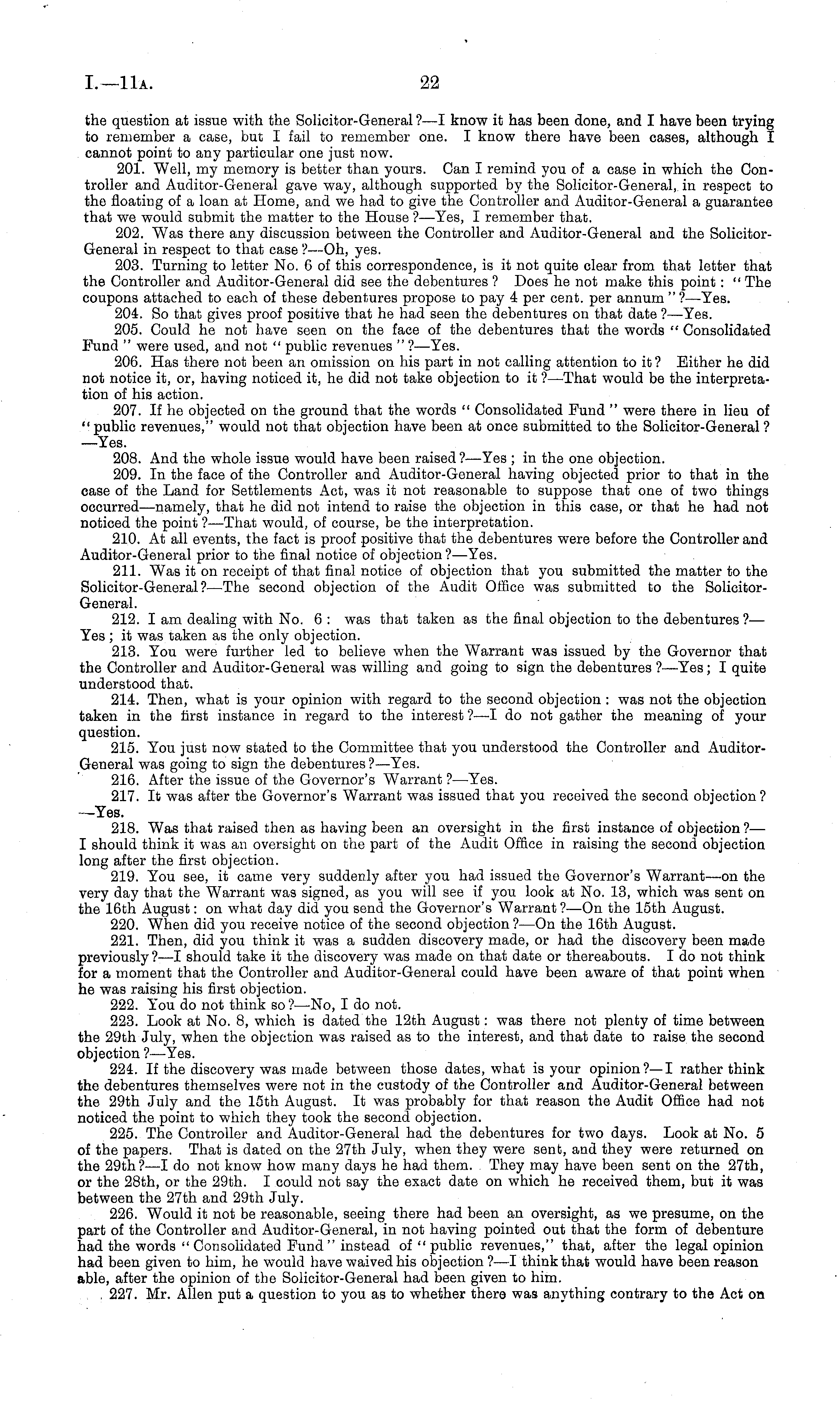 the question at issue with the Solicitor-General ?—I know it has been done, and I have been trying to remember a case, but I fail to remember one. I know there have been cases, although I cannot point to any particular one just now. 201. Well, my memory is better than yours. Can I remind you of a case in which the Controller and Auditor-General gave way, although supported by the Solicitor-General, in respect to the floating of a loan at Home, and we had to give the Controller and Auditor-General a guarantee that we would submit the matter to the House ? —Yes, I remember that. 202. Was there any discussion between the Controller and Auditor-General and the SolicitorGeneral in respect to that case ?—Oh, yes. 203. Turning to letter No. 6 of this correspondence, is it not quite clear from that letter that the Controller and Auditor-General did see the debentures ? Does he not make this point: " The coupons attached to each of these debentures propose to pay 4 per cent, per annum " ?—Yes. 204. So that gives proof positive that he had seen the debentures on that date ?—Yes. 205. Could he not have seen on the face of the debentures that the words " Consolidated Fund " were used, and not " public revenues " ? —Yes. 206. Has there not been an omission on his part in not calling attention to it ? Either he did not notice it, or, having noticed it, he did not take objection to it ? —That would be the interpretation of his action. 207. If he objected on the ground that the words " Consolidated Fund " were there in lieu of "public revenues," would not that objection have been at once submitted to the Solicitor-General ? —Yes. 208. And the whole issue would have been raised ?—Yes ; in the one objection. 209. In the face of the Controller and Auditor-General having objected prior to that in the case of the Land for Settlements Act, was it not reasonable to suppose that one of two things occurred—namely, that he did not intend to raise the objection in this case, or that he had not noticed the point ? —That would, of course, be the interpretation. 210. At all events, the fact is proof positive that the debentures were before the Controller and Auditor-General prior to the final notice of objection ? —Yes. 211. Was it on receipt of that final notice of objection that you submitted the matter to the Solicitor-General?—The second objection of the Audit Office was submitted to the SolicitorGeneral. 212. I am dealing with No. 6 : was that taken as the final objection to the debentures ?— Yes; it was taken as the only objection. 213. You were further led to believe when the Warrant was issued by the Governor that the Controller and Auditor-General was willing and going to sign the debentures ?—Yes; I quite understood that. 214. Then, what is your opinion with regard to the second objection : was not the objection taken in the first instance in regard to the interest ?—I do not gather the meaning of your question. 215. You just now stated to the Committee that you understood the Controller and AuditorGeneral was going to sign the debentures ? —Yes. 216. After the issue of the Governor's Warrant ?—Yes. 217. It was after the Governor's Warrant was issued that you received the second objection? —Yes. 218. Was that raised then as having been an oversight in the first instance of objection ?— I should think it was an oversight on the part of the Audit Office in raising the second objection long after the first objection. 219. You see, it came very suddenly after you had issued the Governor's Warrant—on the very day that the Warrant was signed, as you will see if you look at No. 13, which was sent on the 16th August: on what day did you send the Governor's Warrant ?—On the 15th August. 220. When did you receive notice of the second objection ? —On the 16th August. 221. Then, did you think it was a sudden discovery made, or had the discovery been made previously?—I should take it the discovery was made on that date or thereabouts. I do not think for a moment that the Controller and Auditor-General could have been aware of that point when he was raising his first objection. 222. You do not think so ? —No, I do not. 223. Look at No. 8, which is dated the 12th August: was there not plenty of time between the 29th July, when the objection was raised as to the interest, and that date to raise the second objection ? —Yes. 224. If the discovery was made between those dates, what is your opinion?—I rather think the debentures themselves were not in the custody of the Controller and Auditor-General between the 29th July and the 15th August. It was probably for that reason the Audit Office had not noticed the point to which they took the second objection. 225. The Controller and Auditor-General had the debentures for two days. Look at No. 5 of the papers. That is dated on the 27th July, when they were sent, and they were returned on the 29th? —I do not know how many days he had them. They may have been sent on the 27th, or the 28th, or the 29th. I could not say the exact date on which he received them, but it was between the 27th and 29th July. 226. Would it not be reasonable, seeing there had been an oversight, as we presume, on the part of the Controller and Auditor-General, in not having pointed out that the form of debenture had the words " Consolidated Fund" instead of " public revenues," that, after the legal opinion had been given to him, he would have waived his objection ? —I think that would have been reason able, after the opinion of the Solicitor-General had been given to him. 227. Mr. Allen put a question to you as to whether there was anything contrary to the Act on