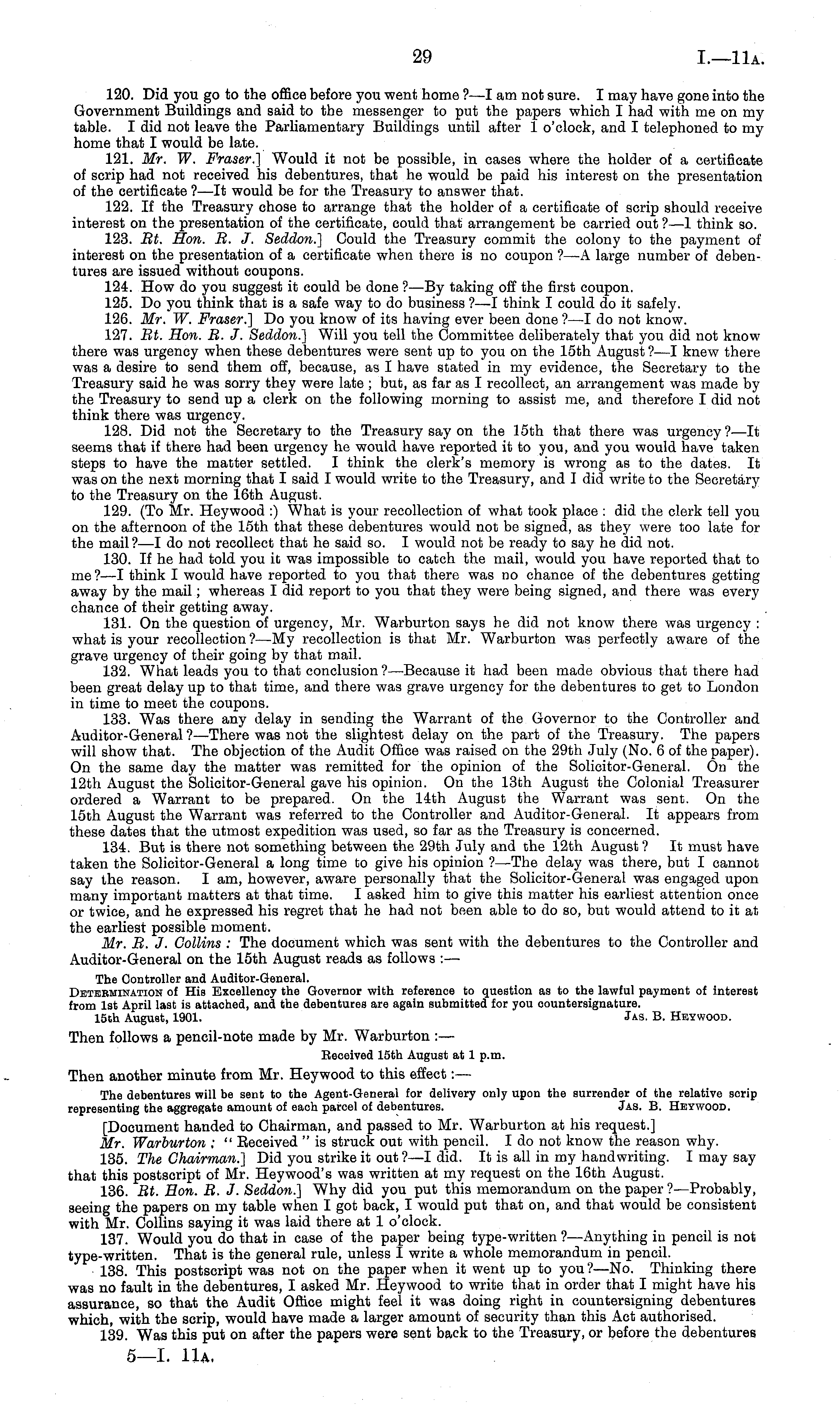 120. Did you go to the office before you went home ?—I am not sure. I may have gone into the Government Buildings and said to the messenger to put the papers which I had with me on my table. I did not leave the Parliamentary Buildings until after 1 o'clock, and I telephoned to my home that I would be late. 121. Mr. W. Fraser.] Would it not be possible, in cases where the holder of a certificate of scrip had not received his debentures, that he would be paid his interest on the presentation of the certificate ?—lt would be for the Treasury to answer that. 122. If the Treasury chose to arrange that the holder of a certificate of scrip should receive interest on the presentation of the certificate, could that arrangement be carried out ?—-I think so. 123. Bt. Hon. B. J. Seddon.] Could the Treasury commit the colony to the payment of interest on the presentation of a certificate when there is no coupon ?—A large number of debentures are issued without coupons. 124. How do you suggest it could be done ?—By taking off the first coupon. 125. Do you think that is a safe way to do business ?—I think I could do it safely. 126. Mr. W. Fraser.] Do you know of its having ever been done ?—I do not know. 127. Bt. Hon. B. J. Seddon.] Will you tell the Committee deliberately that you did not know there was urgency when these debentures were sent up to you on the 15th August ?—I knew there was a desire to send them off, because, as I have stated in my evidence, the Secretary to the Treasury said he was sorry they were late ; but, as far as I recollect, an arrangement was made by the Treasury to send up a clerk on the following morning to assist me, and therefore I did not think there was urgency. 128. Did not the Secretary to the Treasury say on the 15th that there was urgency?—lt seems that if there had been urgency he would have reported it to you, and you would have taken steps to have the matter settled. I think the clerk's memory is wrong as to the dates. It was on the next morning that I said I would write to the Treasury, and I did write to the Secretary to the Treasury on the 16th August. 129. (To Mr. Heywood :) What is your recollection of what took place : did the clerk tell you on the afternoon of the 15th that these debentures would not be signed, as they were too late for the mail?—l do not recollect that he said so. I would not be ready to say he did not. 130. If he had told you it was impossible to catch the mail, would you have reported that to me ?—I think I would have reported to you that there was no chance of the debentures getting away by the mail; whereas I did report to you that they were being signed, and there was every chance of their getting away. 131. On the question of urgency, Mr. Warburton says he did not know there was urgency : what is your recollection ?—My recollection is that Mr. Warburton was perfectly aware of the grave urgency of their going by that mail. 132. What leads you to that conclusion ?—Because it had been made obvious that there had been great delay up to that time, and there was grave urgency for the debentures to get to London in time to meet the coupons. 133. Was there any delay in sending the Warrant of the Governor to the Controller and Auditor-General ? —There was not the slightest delay on the part of the Treasury. The papers will show that. The objection of the Audit Office was raised on the 29th July (No. 6of the paper). On the same day the matter was remitted for the opinion of the Solicitor-General. On the 12th August the Solicitor-General gave his opinion. On the 13th August the Colonial Treasurer ordered a Warrant to be prepared. On the 14th August the Warrant was sent. On the 15th August the Warrant was referred to the Controller and Auditor-General. It appears from these dates that the utmost expedition was used, so far as the Treasury is concerned. 134. But is there not something between the 29th July and the 12th August? It must have taken the Solicitor-General a long time to give his opinion ?—The delay was there, but I cannot say the reason. I am, however, aware personally that the Solicitor-General was engaged upon many important matters at that time. I asked him to give this matter his earliest attention once or twice, and he expressed his regret that he had not been able to do so, but would attend to it at the earliest possible moment. Mr. B. J. Collins : The document which was sent with the debentures to the Controller and Auditor-General on the 15th August reads as follows : — The Controller and Auditor-General. Determination of His Excellenoy the Governor with reference to question as to the lawful payment of interest from Ist April last is attached, and the debentures are again submitted for you countersignature. 15th August, 1901. Jas. B. Heywood. Then follows a pencil-note made by Mr. Warburton : — Received 15th August at 1 p.m. Then another minute from Mr. Heywood to this effect: — The debentures will be sent to the Agent-General for delivery only upon the surrender of the relative scrip representing the aggregate amount of each parcel of debentures. Jas. B. Heywood. [Document handed to Chairman, and passed to Mr. Warburton at his request.] Mr. Warburton : " Eeceived "is struck out with pencil. Ido not know the reason why. 135. The Chairman.] Did you strike it out ?—I did. It is all in my handwriting. I may say that this postscript of Mr. Heywood's was written at my request on the 16th August. 136. Bt. Hon. B. J. Seddon.] Why did you put this memorandum on the paper ?—Probably, seeing the papers on my table when I got back, I would put that on, and that would be consistent with Mr. Collins saying it was laid there at 1 o'clock. 137. Would you do that in case of the paper being type-written ?—Anything in pencil is not type-written. That is the general rule, unless I write a whole memorandum in pencil. 138. This postscript was not on the paper when it went up to you?— No. Thinking there 
