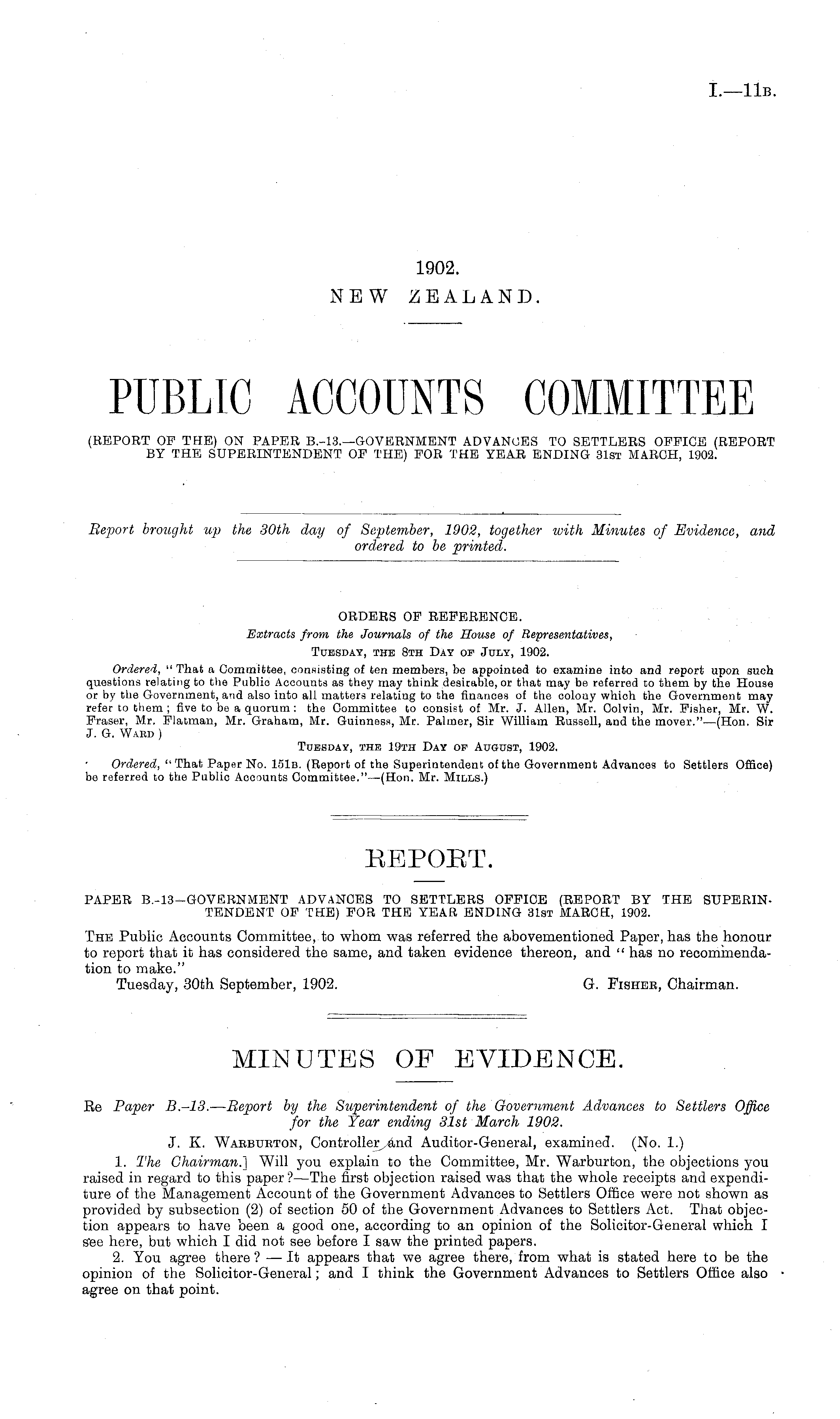 ORDERS OF REFERENCE. Extracts from, the Journals of the House of Representatives, Tuesday, the Bth Day op July, 1902. Ordered, "That a Committee, consisting of ten members, be appointed to examine into and report upon such questions relating to the Publio Accounts as they may think desirable, or that may be referred to them by the House or by the Government, and also into all matters relating to the finances of the colony which the Government may refer to them ; five to be a quorum : the Committee to consist of Mr. J. Allen, Mr. Colvin, Mr. Fisher, Mr. W. Fraser, Mr. Flatman, Mr. Graham, Mr. Guinness, Mr. Palmer, Sir William Russell, and the mover." —(Hon. Sir J. G. Wabd ) Tuesday, the 19th Day op August, 1902. Ordered, "That Paper No. 151b. (Report of the Superintendent of the Government Advances to Settlers Office) be referred to the Public Accounts Committee."—(Hon. Mr. Mills.)