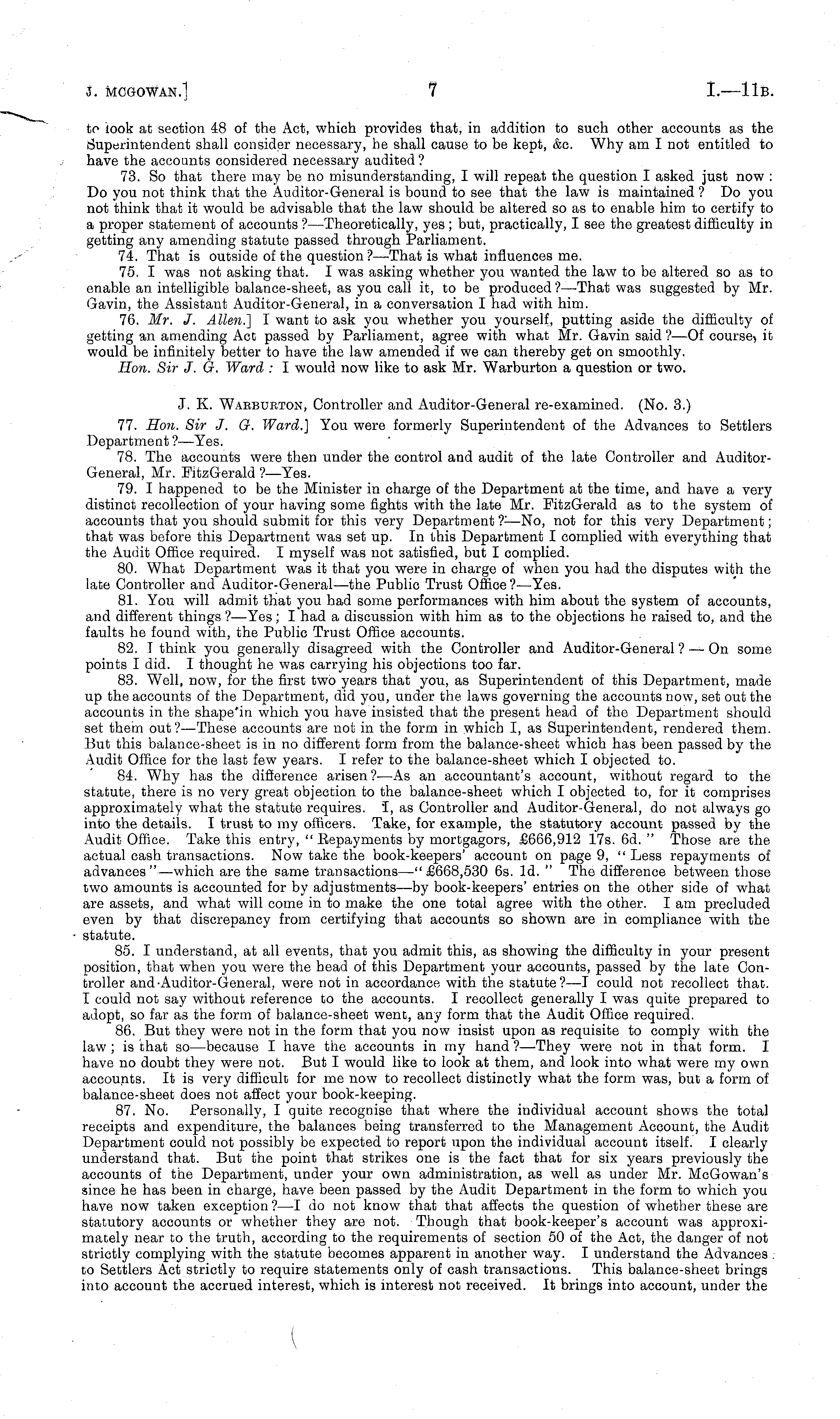 to look at section 48 of the Act, which provides that, in addition to such other accounts as the Superintendent shall consider necessary, he shall cause to be kept, &c. Why am I not entitled to have the accounts considered necessary audited ? 73. So that there may be no misunderstanding, I will repeat the question I asked just now : Do you not think that the Auditor-General is bound to see that the law is maintained ? Do you not think that it would be advisable that the law should be altered so as to enable him to certify to a proper statement of accounts ?—Theoretically, yes ; but, practically, I see the greatest difficulty in getting any amending statute passed through Parliament. 74. That is outside of the question ?—-That is what influences me. 75. I was not asking that. I was asking whether you wanted the law to be altered so as to enable an intelligible balance-sheet, as you call it, to be produced ?—That was suggested by Mr. Gavin, the Assistant Auditor-General, in a conversation I had with him. 76. Mr. J. Allen.] I want to ask you whether you yourself, putting aside the difficulty of getting an amending Act passed by Parliament, agree with what Mr. Gavin said?—Of course, it would be infinitely better to have the law amended if we can thereby get on smoothly. Hon. Sir J. G. Ward : I would now like to ask Mr. Warburton a question or two. J. K. Warburton, Controller and Auditor-General re-examined. (No. 3.) 77. Hon. Sir J. G. Ward.] You were formerly Superintendent of the Advances to Settlers Department ?—Yes. 78. The accounts were then under the control and audit of the late Controller and AuditorGeneral, Mr. FitzGerald ?—Yes. 79. I happened to be the Minister in charge of the Department at the time, and have a very distinct recollection of your having some fights with the late Mr. FitzGerald as to the system of accounts that you should submit for this very Department T- —No, not for this very Department; that was before this Department was set up. In this Department I complied with everything that the Audit Office required. I myself was not satisfied, but I complied. 80. What Department was it that you were in charge of when you had the disputes with the late Controller and Auditor-General—the Public Trust Office?— Yes. 81. You will admit that you had some performances with him about the system of accounts, and different things ?—Yes; I had a discussion with him as to the objections he raised to, and the faults he found with, the Public Trust Office accounts. 82. I think you generally disagreed with the Controller and Auditor-General ? —On some points I did. I thought he was carrying his objections too far. 83. Well, now, for the first two years that you, as Superintendent of this Department, made up the accounts of the Department, did you, under the laws governing the accounts now, set out the accounts in the shape'in which you have insisted that the present head of the Department should set them out? —These accounts are not in the form in which I, as Superintendent, rendered them. But this balance-sheet is in no different form from the balance-sheet which has been passed by the Audit Office for the last few years. I refer to the balance-sheet which I objected to. 84. Why has the difference arisen?—As an accountant's account, without regard to the statute, there is no very great objection to the balance-sheet which I objected to, for it comprises approximately what the statute requires. I, as Controller and Auditor-General, do not always go into the details. I trust to my officers. Take, for example, the statutory account passed by the Audit Office. Take this entry, " Repayments by mortgagors, £666,912 17s. 6d. " Those are the actual cash transactions. Now take the book-keepers' account on page 9, " Less repayments of advances" —which are the same transactions—"£66B,s3o 6s. Id. " The difference between those two amounts is accounted for by adjustments —by book-keepers' entries on the other side of what are assets, and what will come in to make the one total agree with the other. lam precluded even by that discrepancy from certifying that accounts so shown are in compliance with the statute. 85. I understand, at all events, that you admit this, as showing the difficulty in your present position, that when you were the head of this Department your accounts, passed by the late Controller and-Auditor-General, were not in accordance with the statute? —I could not recollect that. I could not say without reference to the accounts. I recollect generally I was quite prepared to adopt, so far as the form of balance-sheet went, any form that the Audit Office required. 86. But they were not in the form that you now insist upon as requisite to comply with the law ; is that so —because I have the accounts in my hand ?—They were not in that form. I have no doubt they were not. But I would like to look at them, and look into what were my own accounts. It is very difficult for me now to recollect distinctly what the form was, but a form of balance-sheet does not affect your book-keeping. 87. No. Personally, I quite recognise that where the individual account shows the total receipts and expenditure, the balances being transferred to the Management Account, the Audit Department could not possibly be expected to report upon the individual account itself. I clearly understand that. But the point that strikes one is the fact that for six years previously the accounts of the Department, under your own administration, as well as under Mr. McGowan's since he has been in charge, have been passed by the Audit Department in the form to which you have now taken exception ?—I do not know that that affects the question of whether these are statutory accounts or whether they are not. Though that book-keeper's account was approximately near to the truth, according to the requirements of section 50 of the Act, the danger of not strictly complying with the statute becomes