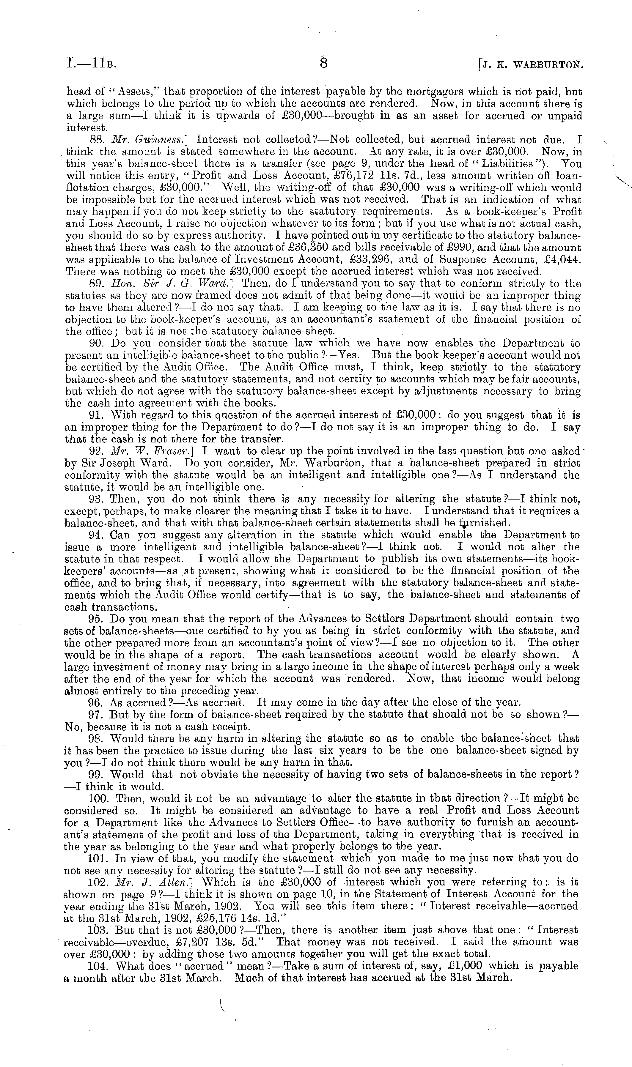 head of " Assets," that proportion of the interest payable by the mortgagors which is not paid, but which belongs to the period up to which the accounts are rendered. Now, in this account there is a large sum —I think it is upwards of £30,000 —brought in as an asset for accrued or unpaid interest. 88. Mr. Guinness.] Interest not collected?— Not collected, but accrued interest not due. I think the amount is stated somewhere in the account. At any rate, it is over £30,000. Now, in this year's balance-sheet there is a transfer (see page 9, under the head of "Liabilities"). You will notice this entry, "Profit and Loss Account, £76,172 lis. 7d., less amount written off loanflotation charges, £30,000." Well, the writing-off of that £30,000 was a writing-off which would be impossible but for the accrued interest which was not received. That is an indication of what may happen if you do not keep strictly to the statutory requirements. As a book-keeper's Profit and Loss Account, I raise no objection whatever to its form ; but if you use what is not actual cash, you should do so by express authority. I have pointed out in my certificate to the statutory balancesheet that there was cash to the amount of £36,350 and bills receivable of £990, and that the amount was applicable to the balance of Investment Account, £33,296, and of Suspense Account, £4,044. There was nothing to meet the £30,000 except the accrued interest which was not received. 89. Hon. Sir J. G. Ward.] Then, do I understand you to say that to conform strictly to the statutes as they are now framed does not admit of that being done—it would be an improper thing to have them altered ? —I do not say that. lam keeping to the law as it is. I say that there is no objection to the book-keeper's account, as an accountant's statement of the financial position of the office; but it is not the statutory balance-sheet. 90. Do you consider that the statute law which we have now enables the Department to present an intelligible balance-sheet to the public ?—Yes. But the book-keeper's account would not be certified by the Audit Office. The Audit Office must, I think, keep strictly to the statutory balance-sheet and the statutory statements, and not certify to accounts which may be fair accounts, but which do not agree with the statutory balance-sheet except by adjustments necessary to bring the cash into agreement with the books. 91. With regard to this question of the accrued interest of £30,000: do you suggest that it is an improper thing for the Department to do ? —I do not say it is an improper thing to do. I say that the cash is not there for the transfer. 92. Mr. W. Fraser.] I want to clear up the point involved in the last question but one asked by Sir Joseph Ward. Do you consider, Mr. Warburton, that a balance-sheet prepared in strict conformity with the statute would be an intelligent and intelligible one ?—As I understand the statute, it would be an intelligible one. 93. Then, you do not think there is any necessity for altering the statute?—l think not, except, perhaps, to make clearer the meaning that I take it to have. I understand that it requires a balance-sheet, and that with that balance-sheet certain statements shall be furnished. 94. Can you suggest any alteration in the statute which would enable the Department to issue a more intelligent and intelligible balance-sheet ?—I think not. I would not alter the statute in that respect. I would allow the Department to publish its own statements—its bookkeepers' accounts—as at present, showing what it considered to be the financial position of the office, and to bring that, if necessary, into agreement with the statutory balance-sheet and statements which the Audit Office would certify—that is to say, the balance-sheet and statements of cash transactions. 95. Do you mean that the report of the Advances to Settlers Department should contain two sets of balance-sheets —one certified to by you as being in strict conformity with the statute, and the other prepared more from an accountant's point of view?—l see no objection to it. The other would be in the shape of a report. The cash transactions account would be clearly shown. A large investment of money may bring in a large income in the shape of interest perhaps only a week after the end of the year for which the account was rendered. Now, that income would belong almost entirely to the preceding year. 96. As accrued? —As accrued. It may come in the day after the close of the year. 97. But by the form of balance-sheet required by the statute that should not be so shown ?— No, because it is not a cash receipt. 98. Would there be any harm in altering the statute so as to enable the balance-sheet that it has been the practice to issue during the last six years to be the one balance-sheet signed by you ?—I do not think there would be any harm in that. 99. Would that not obviate the necessity of having two sets of balance-sheets in the report ? —I think it would. 100. Then, would it not be an advantage to alter the statute in that direction ?—lt might be considered so. It might be considered an advantage to have a real Profit and Loss Account for a Department like the Advances to Settlers Office—to have authority to furnish an accountant's statement of the profit and loss of the Department, taking in everything that is received in the year as belonging to the year and what properly belongs to the year. 101. In view of that, you modify the statement which you made to me just now that you do not see any necessity for altering the statute ?—I still do not see any necessity. 102. Mr. J. Allen.] Which is the £30,000 of interest which you were referring to:, is it shown on page 9 ?—I think it is shown on page 10, in the Statement of Interest Account for the year ending the 31st March, 1902. You will see this item there: " Interest receivable—accrued at the 31st March, 1902, £25,176 14s. Id
