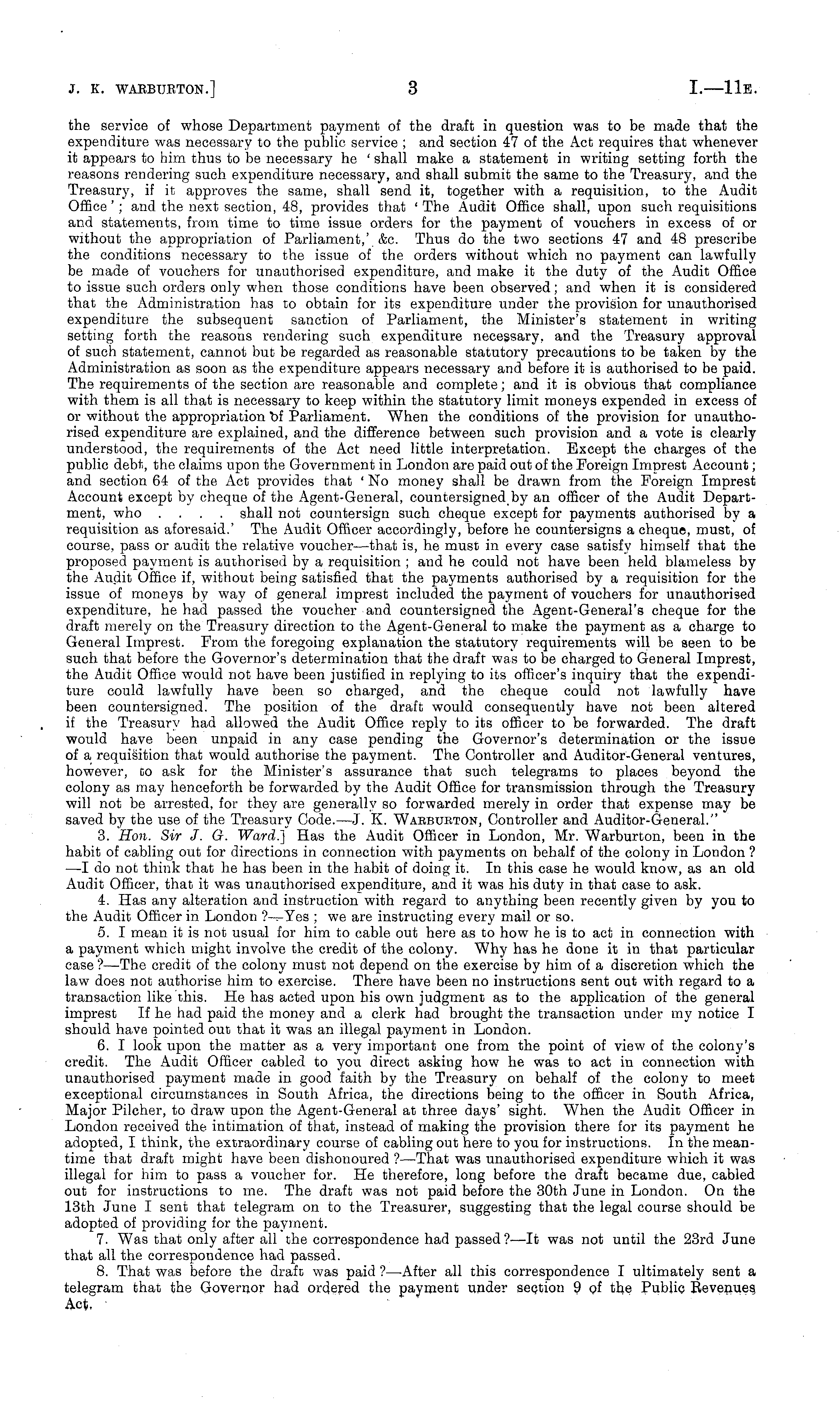the service of whose Department payment of the draft in question was to be made that the expenditure was necessary to the public service ; and section 47 of the Act requires that whenever it appears to him thus to be necessary he ' shall make a statement in writing setting forth the reasons rendering such expenditure necessary, and shall submit the same to the Treasury, and the Treasury, if it approves the same, shall send it, together with a requisition, to the Audit Office' ; and the next section, 48, provides that ' The Audit Office shall, upon such requisitions and statements, from time to time issue orders for the payment of vouchers in excess of or without the appropriation of Parliament,' &c. Thus do the two sections 47 and 48 prescribe the conditions necessary to the issue of the orders without which no payment can lawfully be made of vouchers for unauthorised expenditure, and make it the duty of the Audit Office to issue such orders only when those conditions have been observed; and when it is considered that the Administration has to obtain for its expenditure under the provision for unauthorised expenditure the subsequent sanction of Parliament, the Minister's statement in writing setting forth the reasons rendering such expenditure necessary, and the Treasury approval of such statement, cannot but be regarded as reasonable statutory precautions to be taken by the Administration as soon as the expenditure appears necessary and before it is authorised to be paid. The requirements of the section are reasonable and complete; and it is obvious that compliance with them is all that is necessary to keep within the statutory limit moneys expended in excess of or without the appropriation bf Parliament. When the conditions of the provision for unauthorised expenditure are explained, and the difference between such provision and a vote is clearly understood, the requirements of the Act need little interpretation. Except the charges of the public debt, the claims upon the Government in London are paid out of the Foreign Imprest Account; and section 64 of the Act provides that ' No money shall be drawn from the Foreign Imprest Account except by cheque of the Agent-General, countersigned by an officer of the Audit Department, who .... shall not countersign such cheque except for payments authorised by a requisition as aforesaid.' The Audit Officer accordingly, before he countersigns a cheque, must, of course, pass or audit the relative voucher—that is, he must in every case satisfy himself that the proposed payment is authorised by a requisition ; and he could not have been held blameless by the Audit Office if, without being satisfied that the payments authorised by a requisition for the issue of moneys by way of general imprest included the payment of vouchers for unauthorised expenditure, he had passed the voucher and countersigned the Agent-General's cheque for the draft merely on the Treasury direction to the Agent-General to make the payment as a charge to General Imprest. From the foregoing explanation the statutory requirements will be seen to be such that before the Governor's determination that the draft was to be charged to General Imprest, the Audit Office would not have been justified in replying to its officer's inquiry that the expenditure could lawfully have been so charged, and the cheque could not lawfully have been countersigned. The position of the draft would consequently have not been altered if the Treasury had allowed the Audit Office reply to its officer to be forwarded. The draft would have been unpaid in any case pending the Governor's determination or the issue of a requisition that would authorise the payment. The Controller and Auditor-General ventures, however, co ask for the Minister's assurance that such telegrams to places beyond the colony as may henceforth be forwarded by the Audit Office for transmission through the Treasury will not be arrested, for they are generally so forwarded merely in order that expense may be saved by the use of the Treasury Code.— J. K. Warburton, Controller and Auditor-General." 3. Hon. Sir J. G. Ward.] Has the Audit Officer in London, Mr. Warburton, been in the habit of cabling out for directions in connection with payments on behalf of the colony in London ? —I do not think that he has been in the habit of doing it. In this case he would know, as an old Audit Officer, that it was unauthorised expenditure, and it was his duty in that case to ask. 4. Has any alteration and instruction with regard to anything been recently given by you to the Audit Officer in London ; we are instructing every mail or so. 5. I mean it is not usual for him to cable out here as to how he is to act in connection with a payment which might involve the credit of the colony. Why has he done it in that particular case ?—The credit of the colony must not depend on the exercise by him of a discretion which the law does not authorise him to exercise. There have been no instructions sent out with regard to a transaction like this. He has acted upon his own judgment as to the application of the general imprest If he had paid the money and a clerk had brought the transaction under my notice I should have pointed out that it was an illegal payment in London. 6. I look upon the matter as a very important one from the point of view of the colony's credit. The Audit Officer cabled to you direct asking how he was to act in connection with unauthorised payment made in good faith by the Treasury on behalf of the colony to meet exceptional circumstances in South Africa, the directions being to the officer in South Africa, Major Pilcher, to draw upon the Agent-General at three days' sight. When the Audit Officer in London received the intimation of that, instead of making the provision there for its payment he adopted, I think, the extraordinary course of cabling out here to you for instructions. In the meantime that draft might have been dishonoured ? —Th