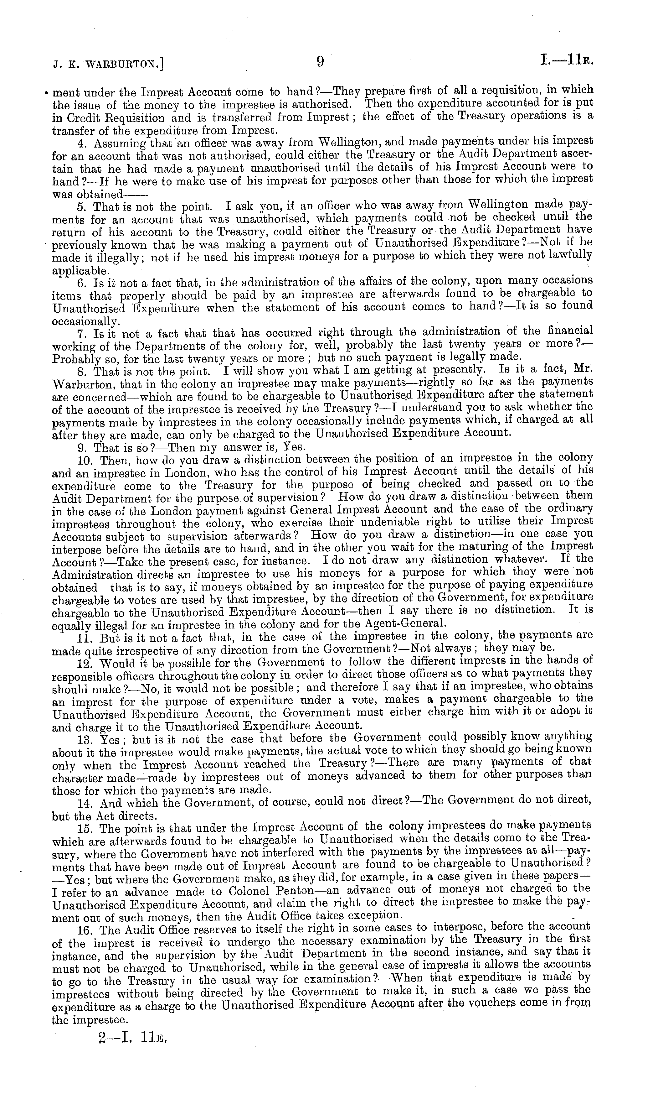 ment under the Imprest Account come to hand?—They prepare first of all a requisition, in which the issue of the money to the imprestee is authorised. Then the expenditure accounted for is put in Credit Eequisition and is transferred from Imprest; the effect of the Treasury operations is a transfer of the expenditure from Imprest. 4. Assuming that an officer was away from Wellington, and made payments under his imprest for an account that was not authorised, could either the Treasury or the Audit Department ascertain that he had made a payment unauthorised until the details of his Imprest Account were to hand ?—lf he were to make use of his imprest for purposes other than those for which the imprest was obtained 5. That is not the point. I ask you, if an officer who was away from Wellington made payments for an account that was unauthorised, which payments could not be checked until the return of his account to the Treasury, could either the Treasury or the Audit Department have previously known that he was making a payment out of Unauthorised Expenditure?—Not if he made it illegally; not if he used his imprest moneys for a purpose to which they were not lawfully applicable. 6. Is it not a fact that, in the administration of the affairs of the colony, upon many occasions items that properly should be paid by an imprestee are afterwards found to be chargeable to Unauthorised Expenditure when the statement of his account comes to hand ?—lt is so found occasionally. 7. Is it not a fact that that has occurred right through the administration of the financial working of the Departments of the colony for, well, probably the last twenty years or more ?— Probably so, for the last twenty years or more ; but no such payment is legally made. 8. That is not the point. I will show you what lam getting at presently. Is it a fact, Mr. Warburton, that in the colony an imprestee may make payments—rightly so far as the payments are concerned—which are found to be chargeable to Unauthorised Expenditure after the statement of the account of the imprestee is received by the Treasury ?—I understand you to ask whether the payments made by imprestees in the colony occasionally include payments which, if charged at all after they are made, can only be charged to the Unauthorised Expenditure Account. 9. That is so? —Then my answer is, Yes. 10. Then, how do you draw a distinction between the position of an imprestee in the colony and an imprestee in London, who has the control of his Imprest Account until the details' of his expenditure come to the Treasury for the purpose of being checked and passed on to the Audit Department for the purpose of supervision? How do you draw a distinction between them in the case of the London payment against General Imprest Account and the case of the ordinary imprestees throughout the colony, who exercise their undeniable right to utilise their Imprest Accounts subject to supervision afterwards ? How do you draw a distinction—in one case you interpose before the details are to hand, and in the other you wait for the maturing of the Imprest Account ? —Take the present case, for instance. Ido not draw any distinction whatever. If the Administration directs an imprestee to use his moneys for a purpose for which they were not obtained—that is to say, if moneys obtained by an imprestee for the purpose of paying expenditure chargeable to votes are used by that imprestee, by the direction of the Government, for expenditure chargeable to the Unauthorised Expenditure Account—then I say there is no distinction. It is equally illegal for an imprestee in the colony and for the Agent-General. 11. But is it not a fact that, in the case of the imprestee in the colony, the payments are made quite irrespective of any direction from the Government ?—Not always ; they may be. 12. Would it be possible for the Government to follow the different imprests in the hands of responsible officers throughout the colony in order to direct those officers as to what payments they should make ?—No, it would not be possible; and therefore I say that if an imprestee, who obtains an imprest for the purpose of expenditure under a vote, makes a payment chargeable to the Unauthorised Expenditure Account, the Government must either charge him with it or adopt it and charge it to the Unauthorised Expenditure Account. 13. Yes ; but is it not the case that before the Government could possibly know anything about it the imprestee would make pavments, the actual vote to which they should go being known only when the Imprest Account reached the Treasury ?—There are many payments of that character made—made by imprestees out of moneys advanced to them for other purposes than those for which the payments are made. 14. And which the Government, of course, could not direct ?—The Government do not direct, but the Act directs. 15. The point is that under the Imprest Account of the colony imprestees do make payments which are afterwards found to be chargeable to Unauthorised when the details come to the Treasury, where the Government have not interfered with the payments by the imprestees at all—payments that have been made out of Imprest Account are found to be chargeable to Unauthorised ? —Yes ; but where the Government make, as they did, for example, in a case given in these papers— I refer'to an advance made to Colonel Penton—an advance out of moneys not charged to the Unauthorised Expenditure Account, and claim the right to direct the imprestee to make the payment out of such moneys, then the Audit Office takes exception. 16. The Audit Office reserves to itself the right in some cases to interpose, before the account of the imprest is received to undergo the necessary examination by the Treasury in the first instance and the supervision by the Audit Department in the second instance, and say that it must not be charged to Unauthorised, while in the general case of imprests it allows t