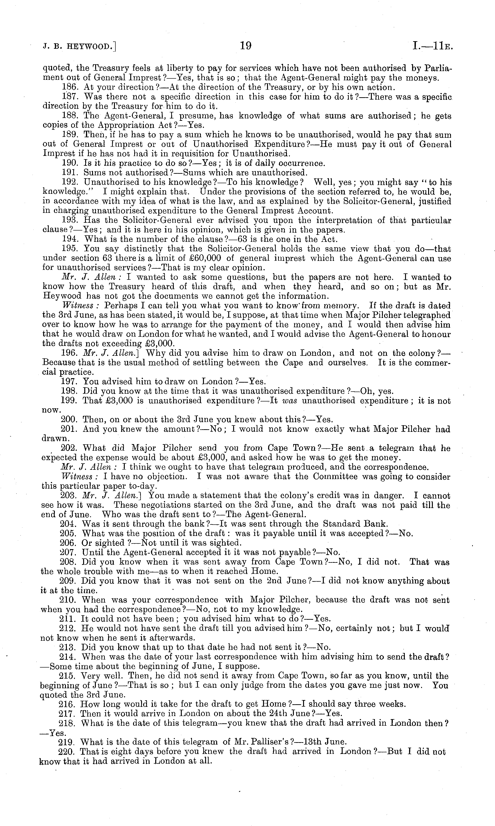 quoted, the Treasury feels at liberty to pay for services which have not been authorised by Parliament out of General Imprest? —Yes, that is so; that the Agent-General might pay the moneys. 186. At your direction?—At the direction of the Treasury, or by his own action. 187. Was there not a specific direction in this case for him to do it ?—There was a specific direction by the Treasury for him to do it. 188. The Agent-General, I presume, has knowledge of what sums are authorised; he gets copies of the Appropriation Act? —Yes. 189. Then, if he has to pay a sum which he knows to be unauthorised, would he pay that sum out of General Imprest or out of Unauthorised Expenditure?—He must pay it out of General Imprest if he has not had it in requisition for Unauthorised. 190. Is it his practice to do so ?—Yes; it is of daily occurrence. 191. Sums not authorised? —Sums which are unauthorised. 192. Unauthorised to his knowledge?—To his knowledge? Well, yes; you might say "to his knowledge." I might explain that. Under the provisions of the section referred to, he would be, in accordance with my idea of what is the law, and as explained by the Solicitor-General, justified in charging unauthorised expenditure to the General Imprest Account. 193. Has the Solicitor-General ever advised you upon the interpretation of that particular clause?—Yes; and it is here in his opinion, which is given in the papers. 194. What is the number of the clause ? —63 is the one in the Act. 195. You say distinctly that the Solicitor-General holds the same view that you do—that under section 63 there is a limit of £60,000 of general imprest which the Agent-General can use for unauthorised services ?—That is my clear opinion. Mr. J. Allen : I wanted to ask some questions, but the papers are not here. I wanted to know how the Treasury heard of this draft, and when they heard, and so on; but as Mr. Heywood has not got the documents we cannot get the information. Witness : Perhaps I can tell you what you want to know' from memory. If the draft is dated the 3rd June, as has been stated, it would be, I suppose, at that time when Major Pilcher telegraphed over to know how he was to arrange for the payment of the money, and I would then advise him that he would draw on London for what he wanted, and I would advise the Agent-General to honour the drafts not exceeding £3,000. 196. Mr. J. Allen.] Why did you advise him to draw on London, and not on the colony?— Because that is the usual method of settling between the Cape and ourselves. It is the commercial practice. 197. You advised him to draw on London ?—Yes. 198. Did you know at the time that it was unauthorised expenditure ? —Oh, yes. 199. That £3,000 is unauthorised expenditure ?—lt was unauthorised expenditure ; it is not now. 200. Then, on or about the 3rd June you knew about this?—Yes. 201. And you knew the amount?'—No; I would not know exactly what Major Pilcher had drawn. 202. What did Major Pilcher send you from Cape Town? —He sent a telegram that he expected the expense would be about £3,000, and asked how he was to get the money. Mr. J. Allen : I think we ought to have that telegram produced, and the correspondence. Witness : I have no objection. I was not aware that the Committee was going to consider this particular paper to-day. 203. Mr. J. Allan.] You made a statement that the colony's credit was in danger. I cannot see how it was. These negotiations started on the 3rd June, and the draft was not paid till the end of June. Who was the draft sent to?—The Agent-General. 204. Was it sent through the bank ?—lt was sent through the Standard Bank. 205. What was the position of the draft : was it payable until it was accepted? —No. 206. Or sighted ? —Not until it was sighted. 207. Until the Agent-General accepted it it was not payable?—No. 208. Did you know when it was sent away from Cape Town? —No, I did not. That was the whole trouble with me—as to when it reached Home. 209. Did you know that it was not sent on the 2nd June ?—I did not know anything about it at the time. 210. When was your correspondence with Major Pilcher, because the draft was not sent when you had the correspondence? —No, not to my knowledge. 211. It could not have been; you advised him what to do?—Yes. 212. He would not have sent the draft till you advised him ?—No, certainly not; but I would not know when he sent it afterwards. 213. Did you know that up to that date he had not sent it ? —No. 214. When was the date of your last correspondence with him advising him to send the draft? —Some time about the beginning of June, I suppose. 215. Very well. Then, he did not send it away from Cape Town, so far as you know, until the beginning of June ?—That is so ; but I can only judge from the dates you gave me just now. You quoted the 3rd June. 216. How long would it take for the draft to get Home ?—I should say three weeks. 217. Then it would arrive in London on about the 24th June? —Yes. 218. What is the date of this telegram—you knew that the draft had arrived in London then? —Yes. 219. What is the date of this telegram of Mr. Palliser's?—l3th June. 220. That is eight days before you knew the draft had arrived in London ?—But I did not know that it had arrived in London at all.